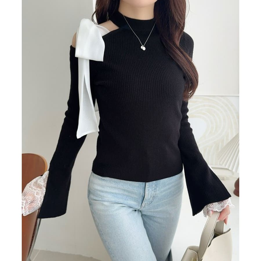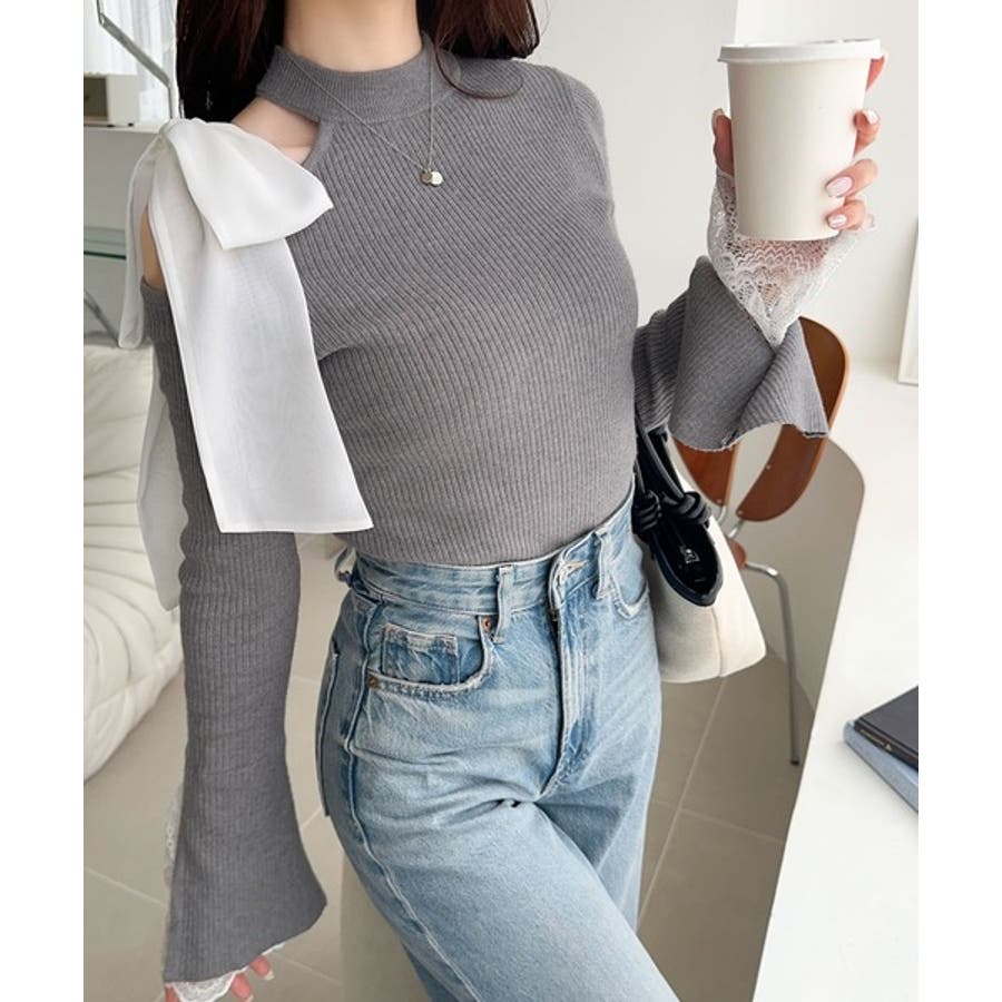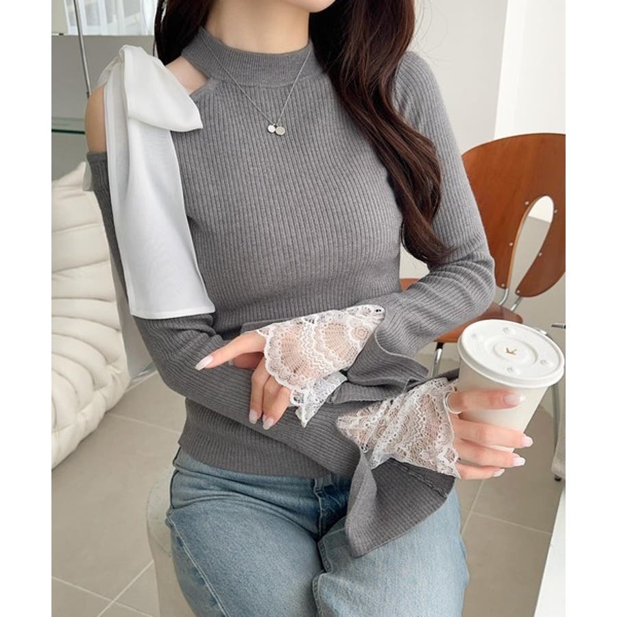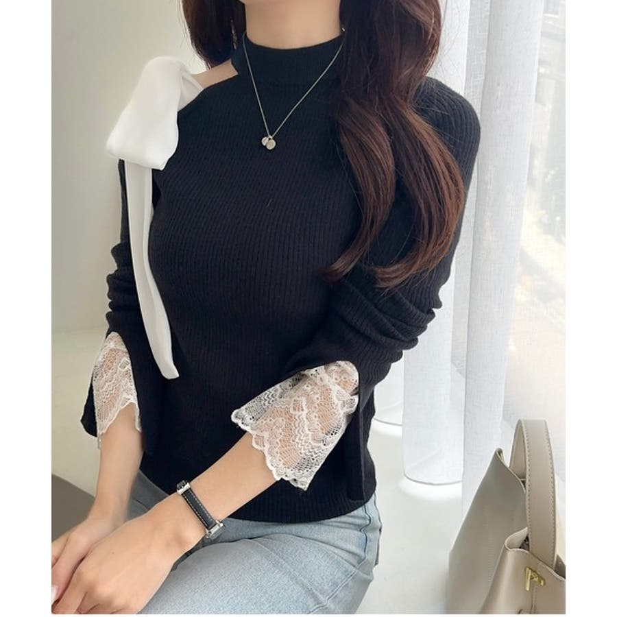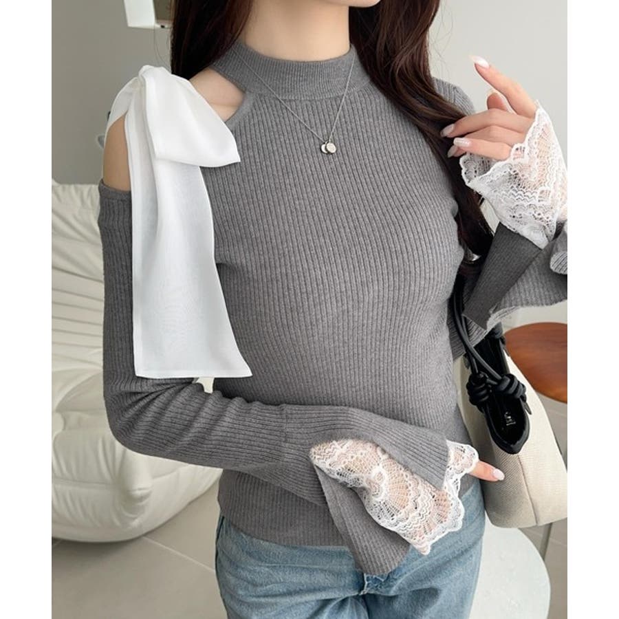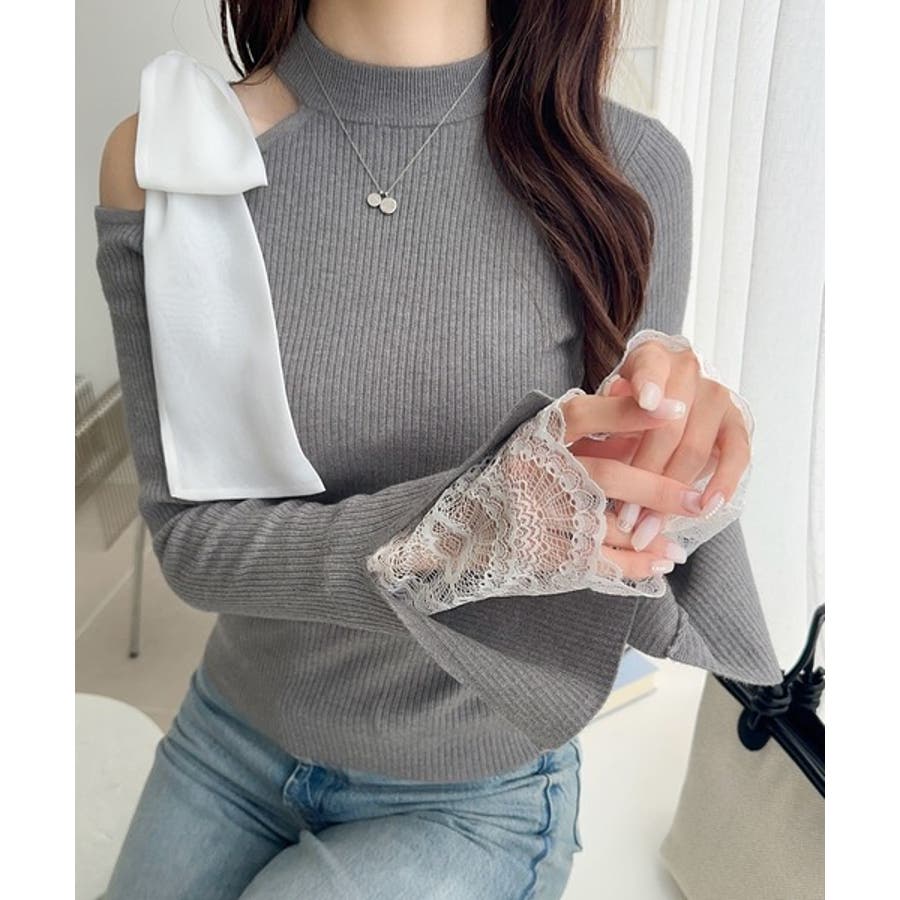 【mily bilet】大人フェミニンの主役トップス。肩シフォンリボン袖レース使…