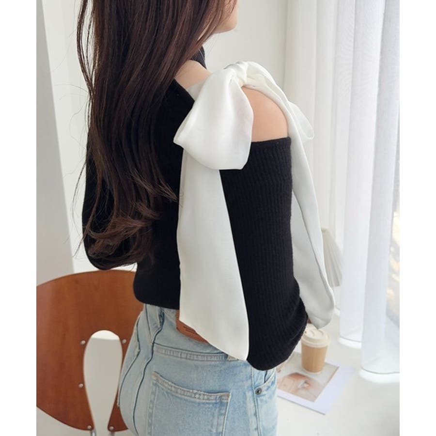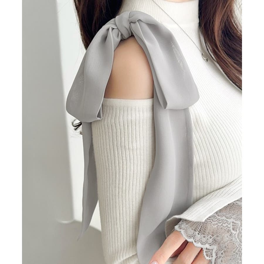 肩に大胆にあしらわれたシフォンリボンが、ふと動くたびに軽やかに揺れて印象的なアクセントに。