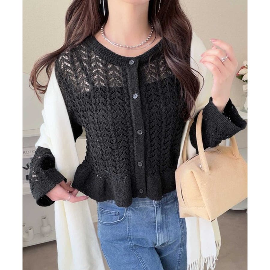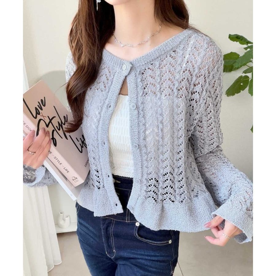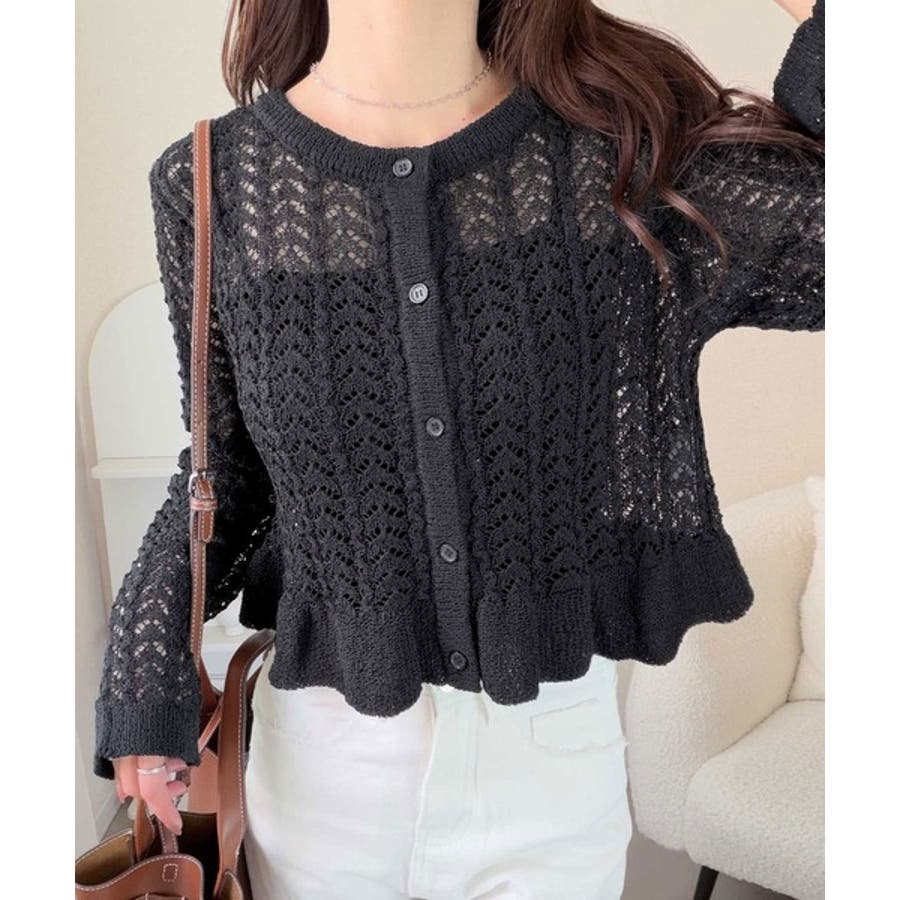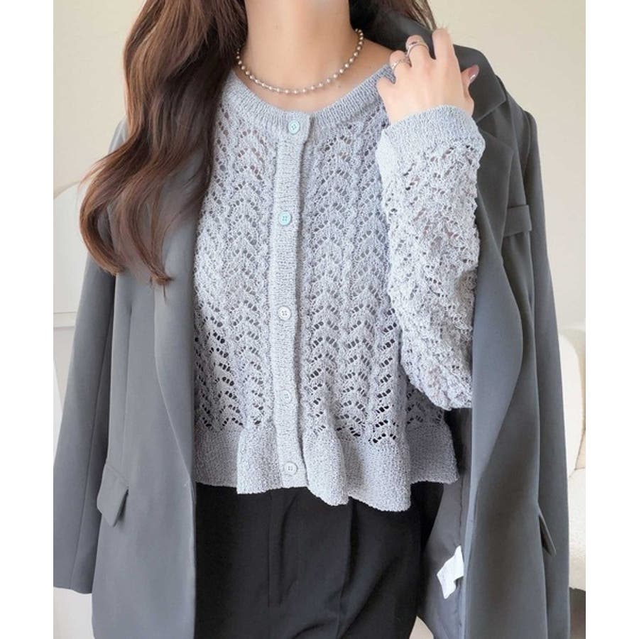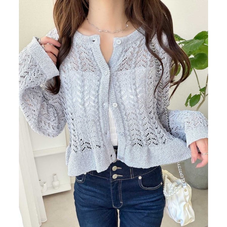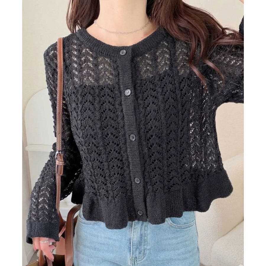 軽やかな透かし編みが印象的なフリルカーディガン。