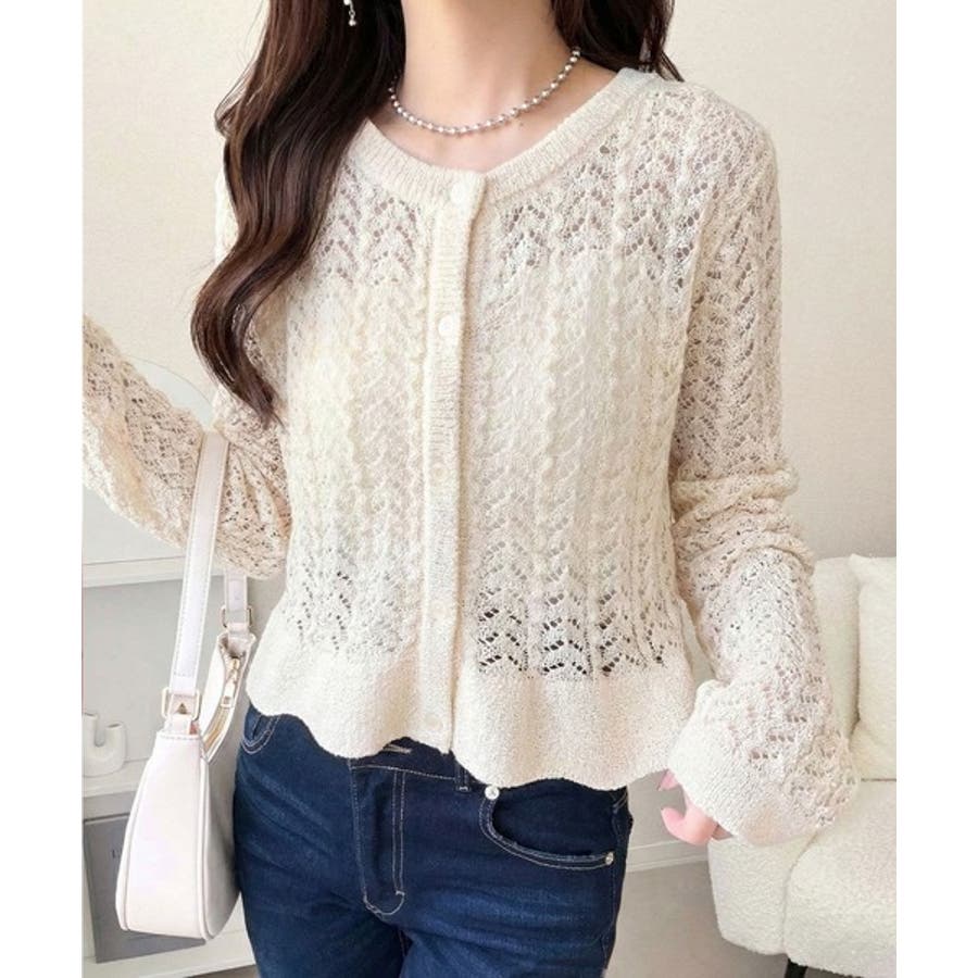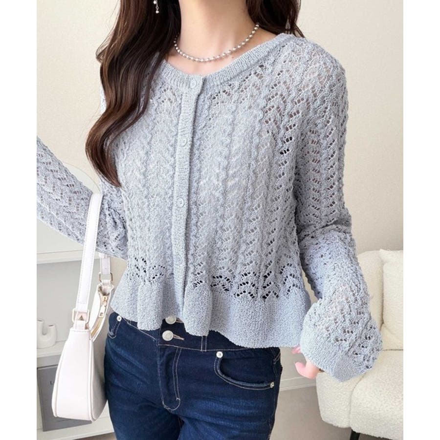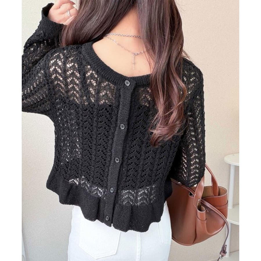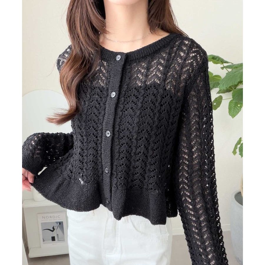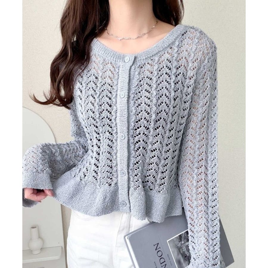 軽やかな透かし編みが印象的なフリルカーディガン。