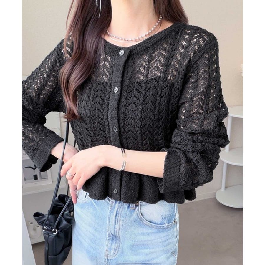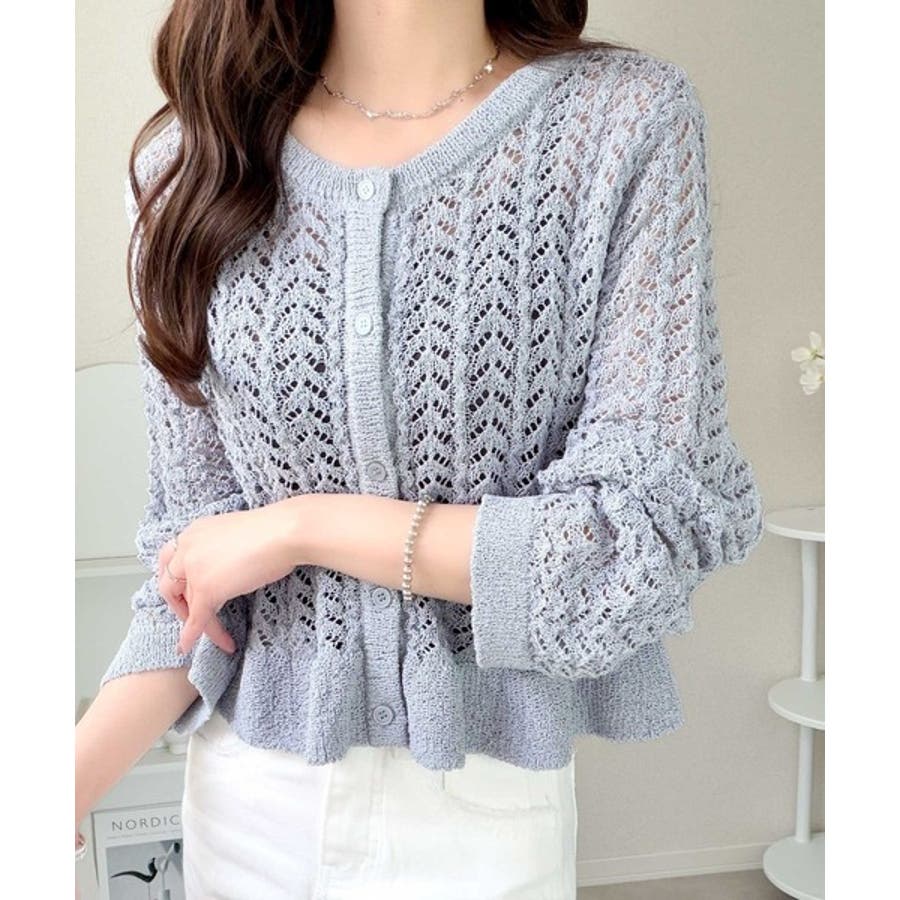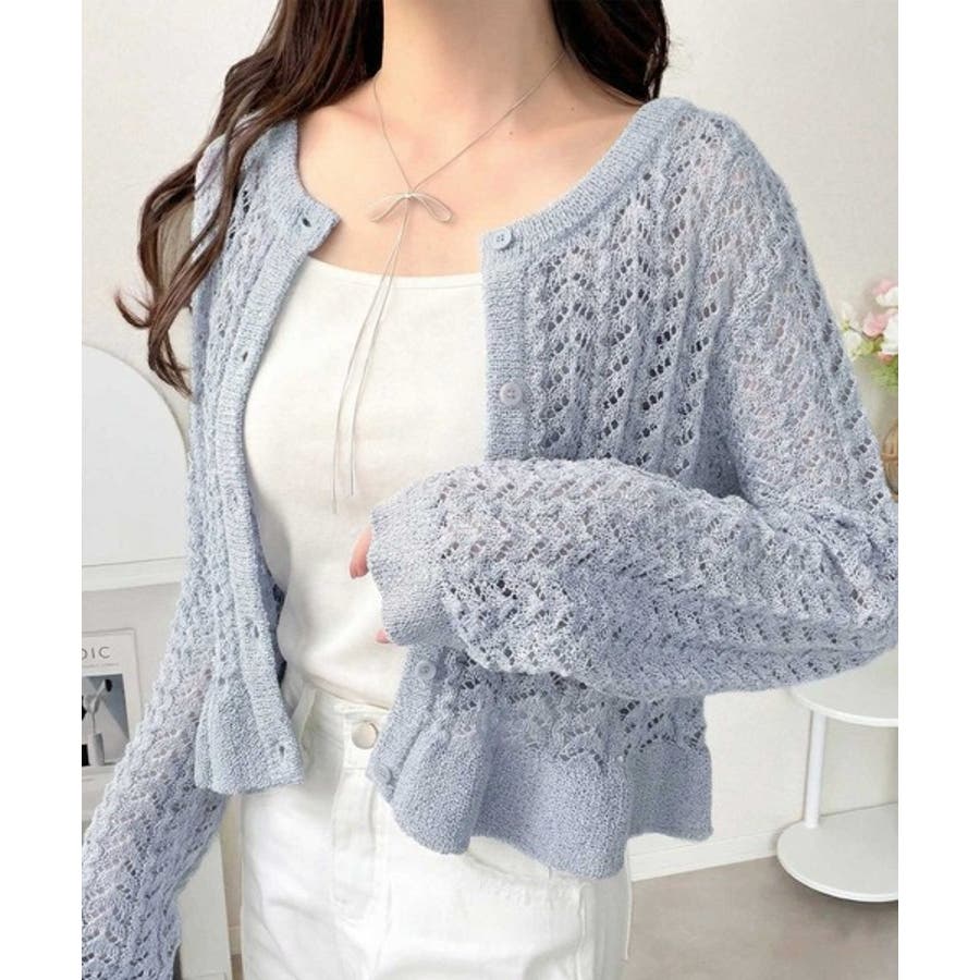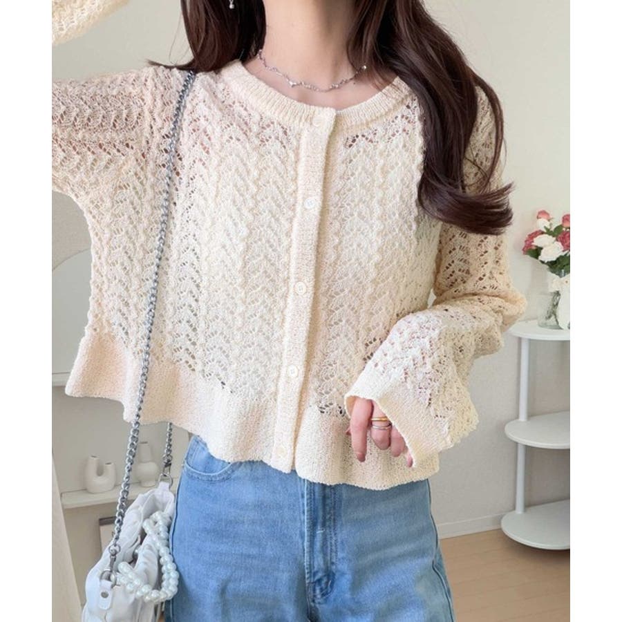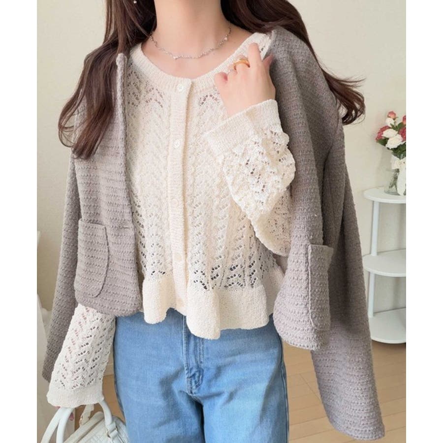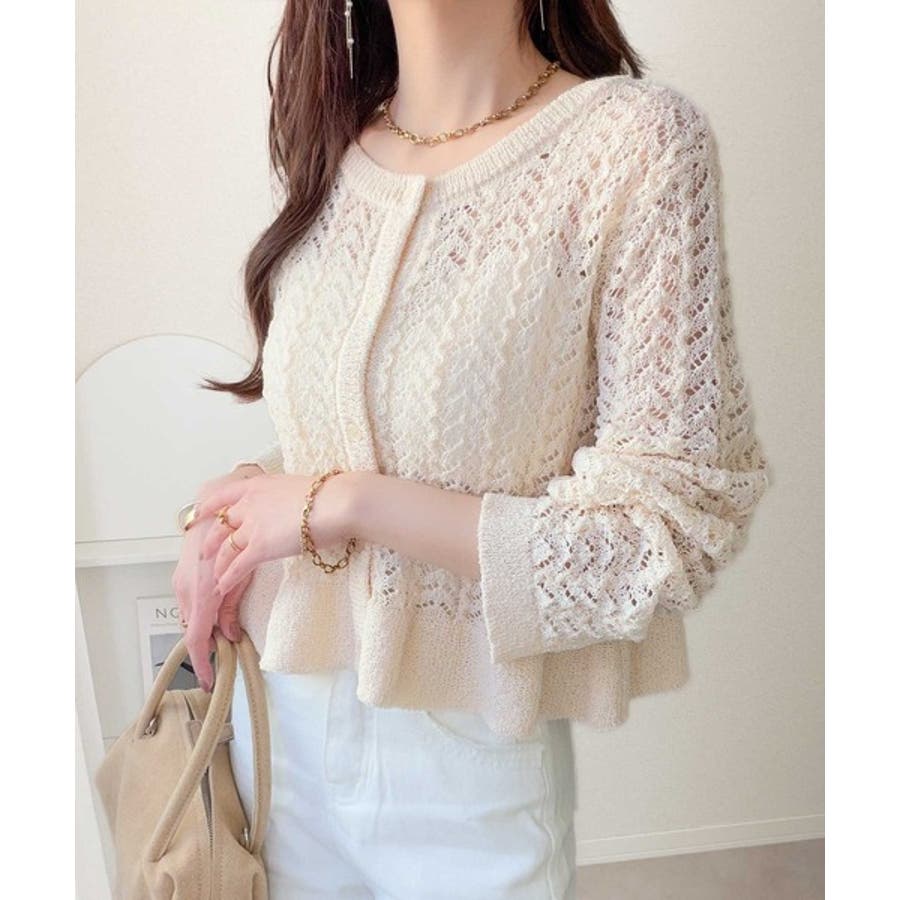 軽やかな透かし編みが印象的なフリルカーディガン。