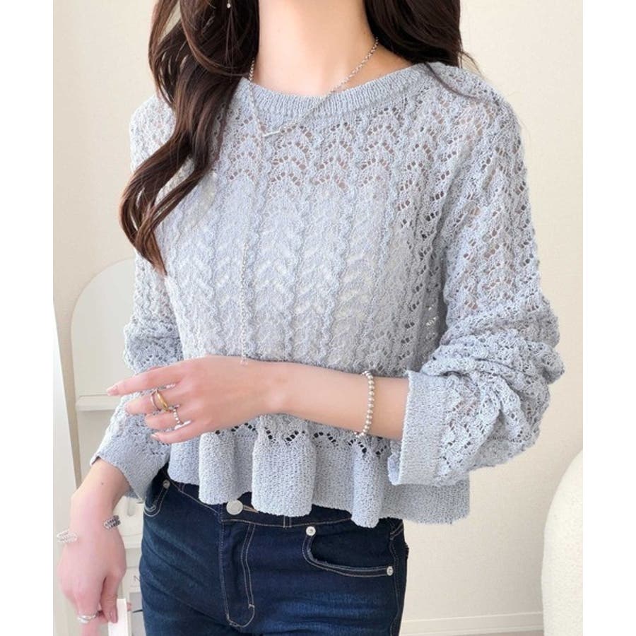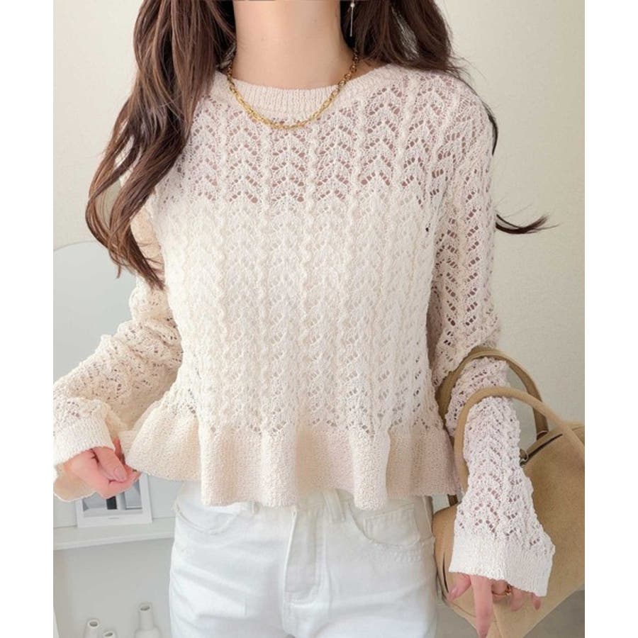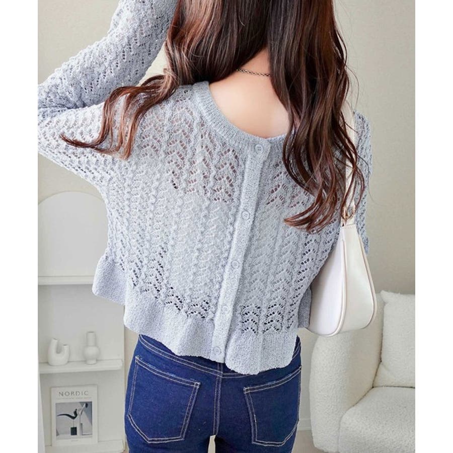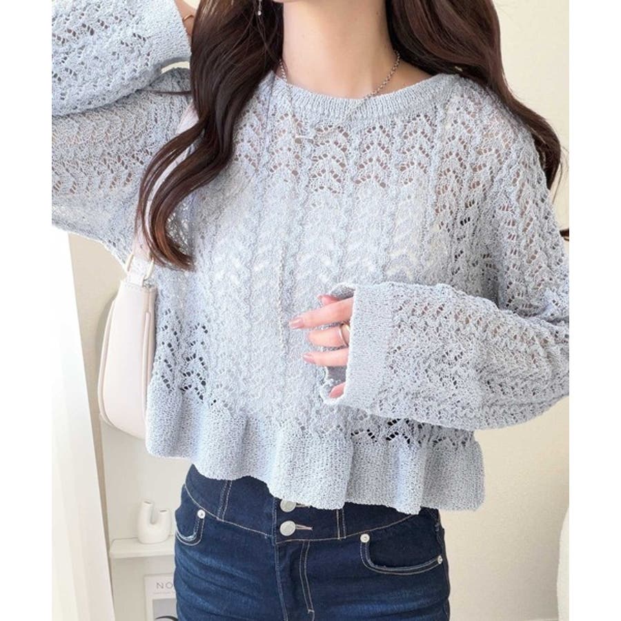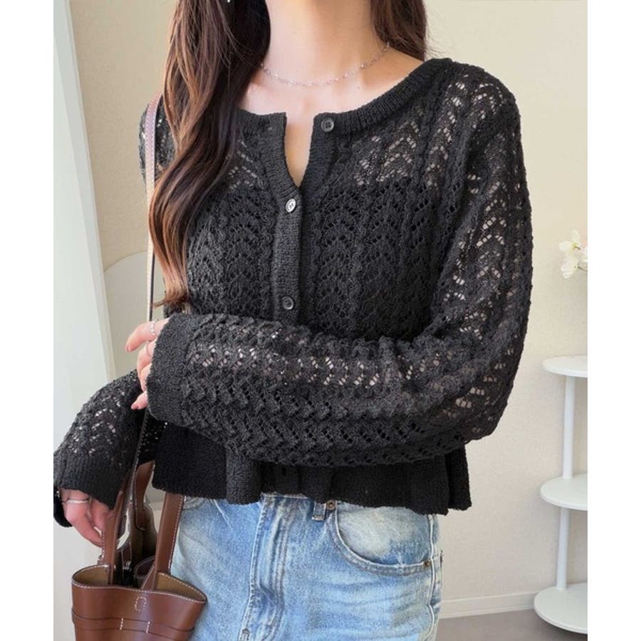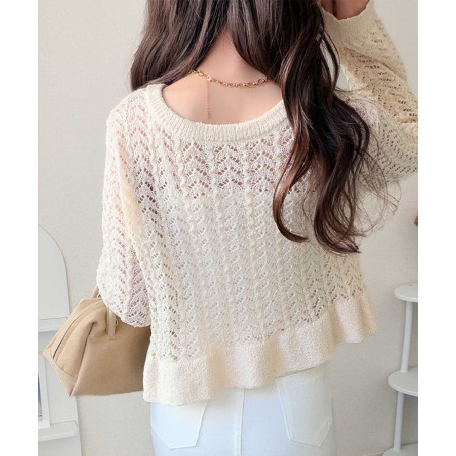 軽やかな透かし編みが印象的なフリルカーディガン。