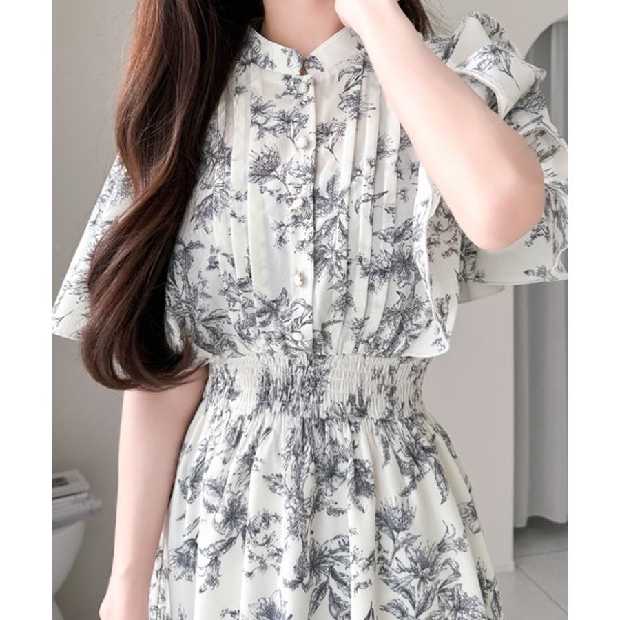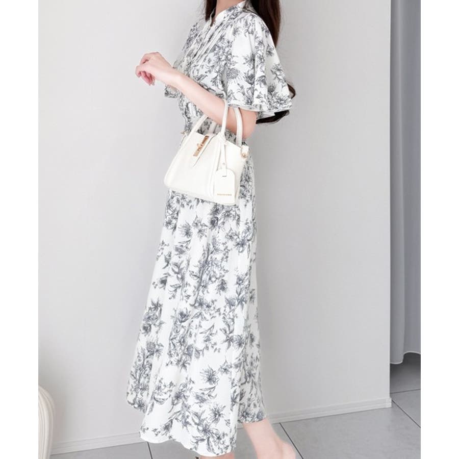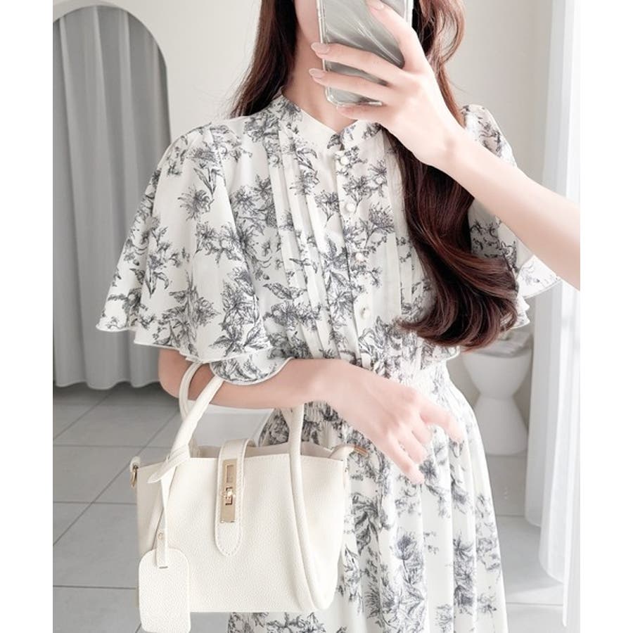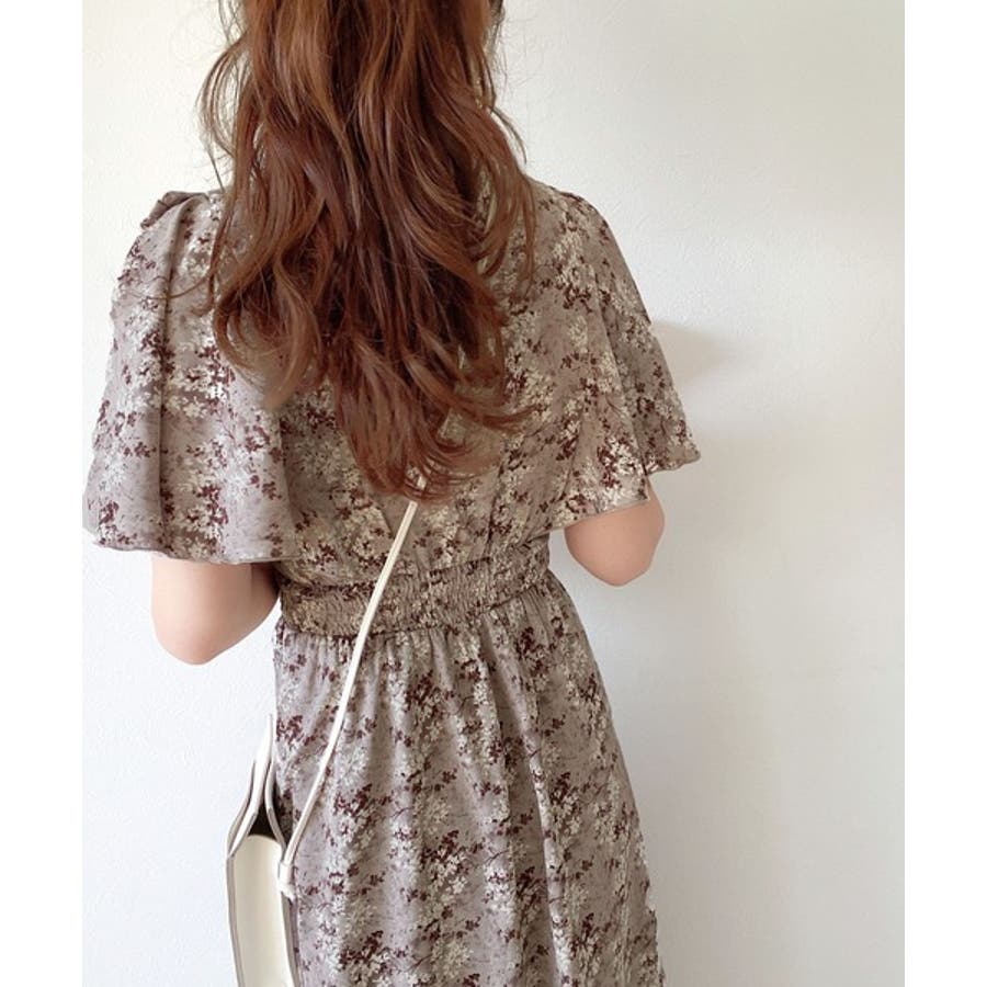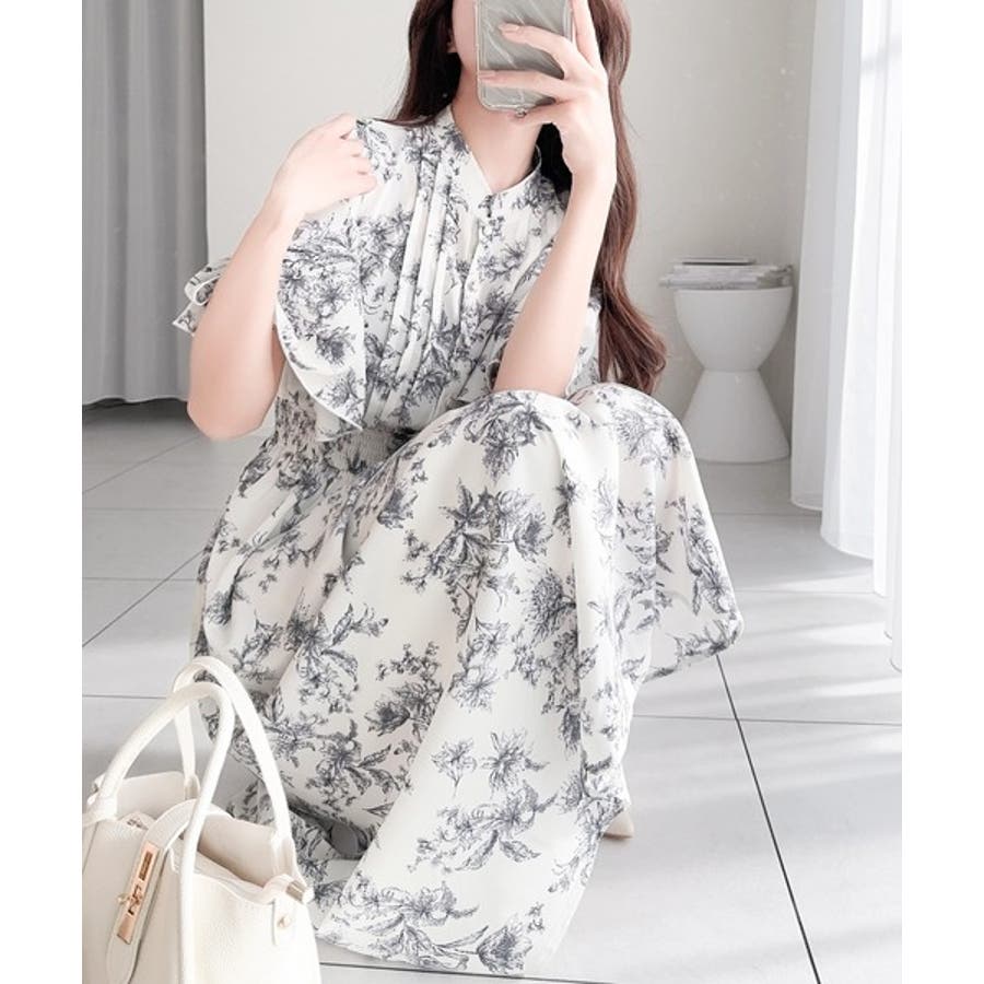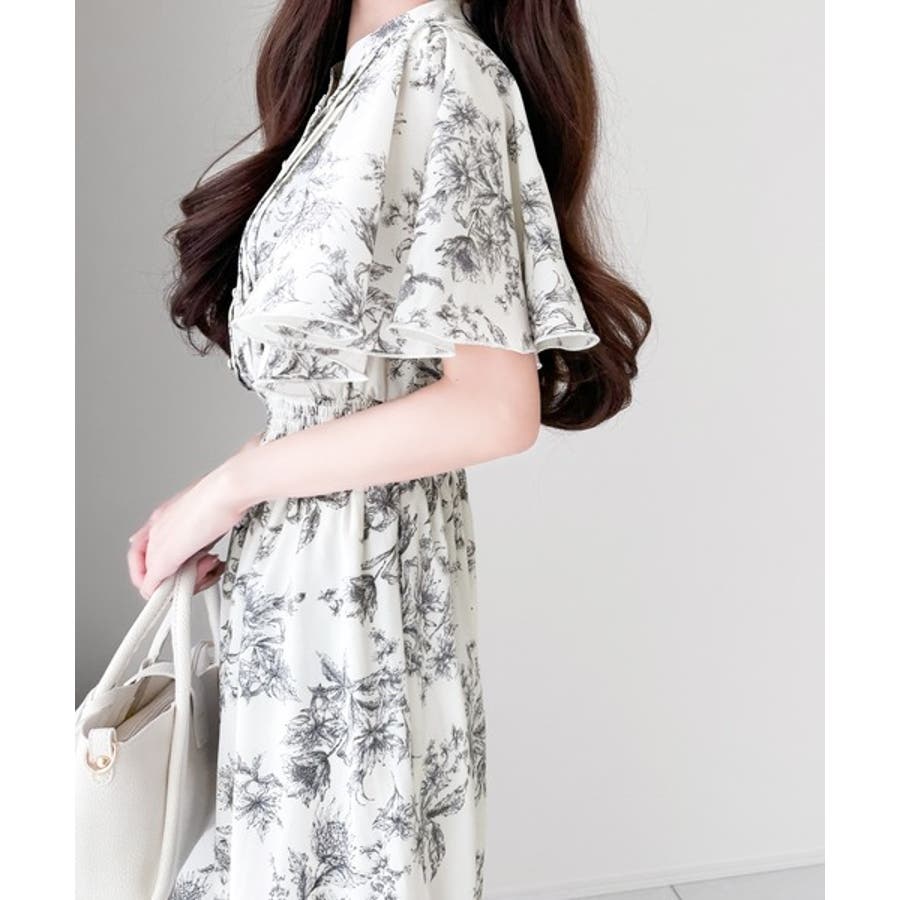 【オフホワイト】【mily bilet】大人ガーリー。花柄フレア袖ワンピース