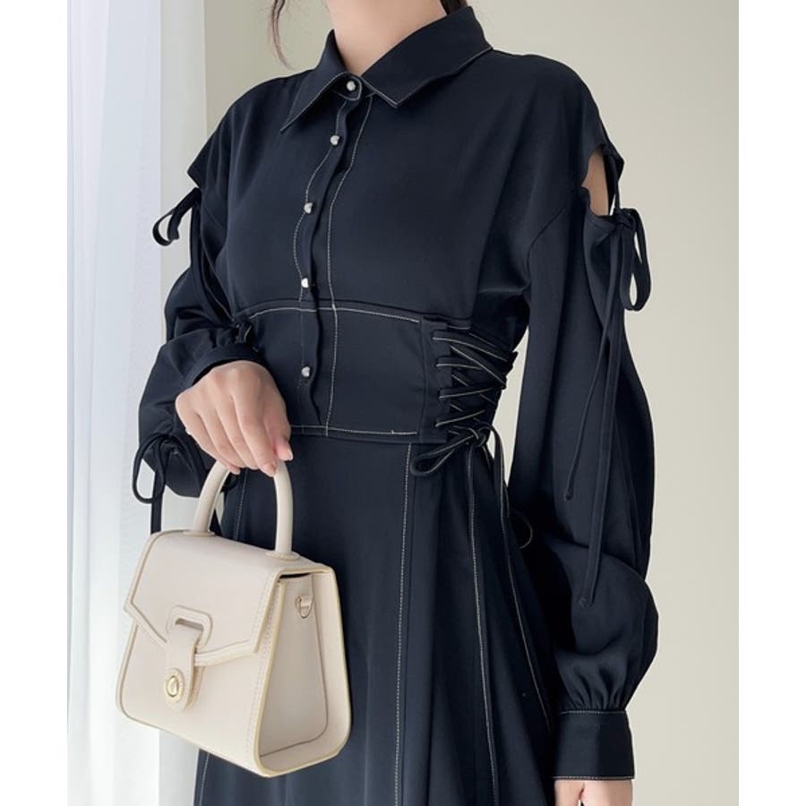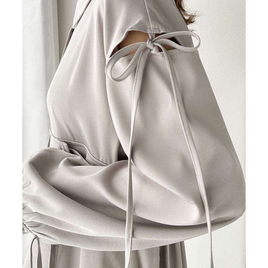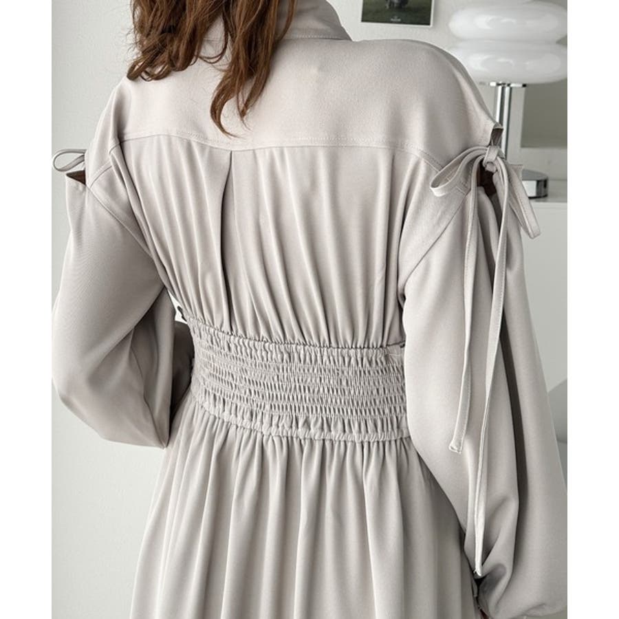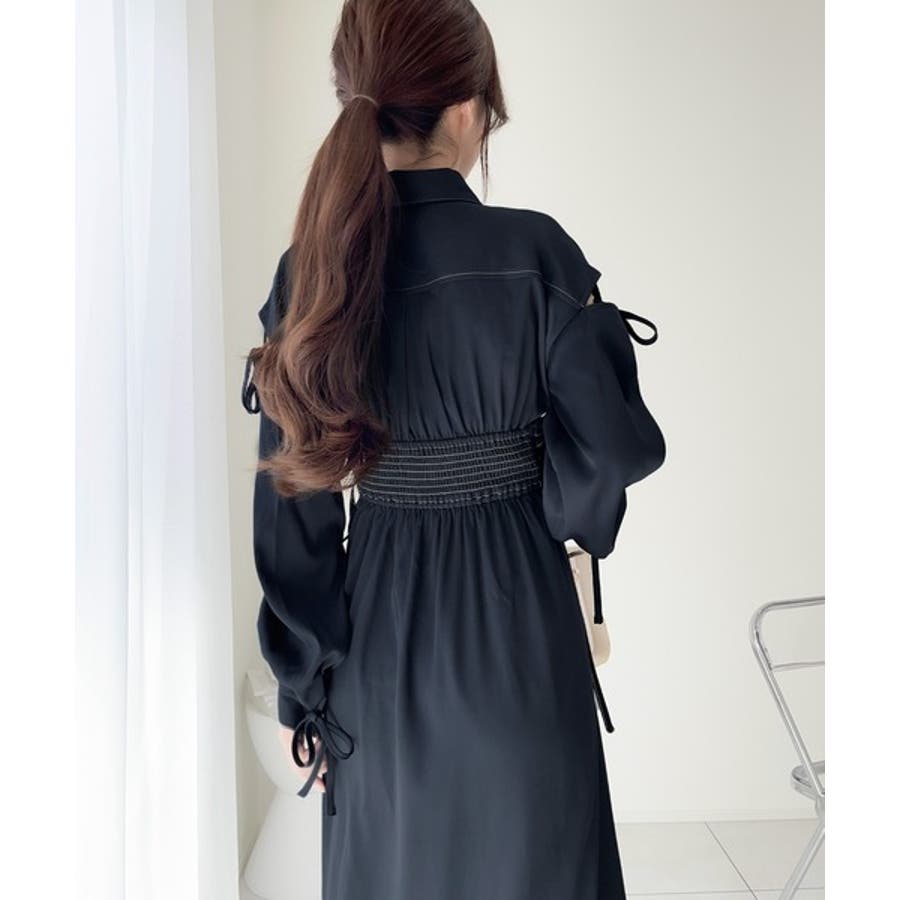 ショルダーと袖口、ウエストの3か所のリボンと艶めくパールボタンでレディライクな印象もたっぷり。