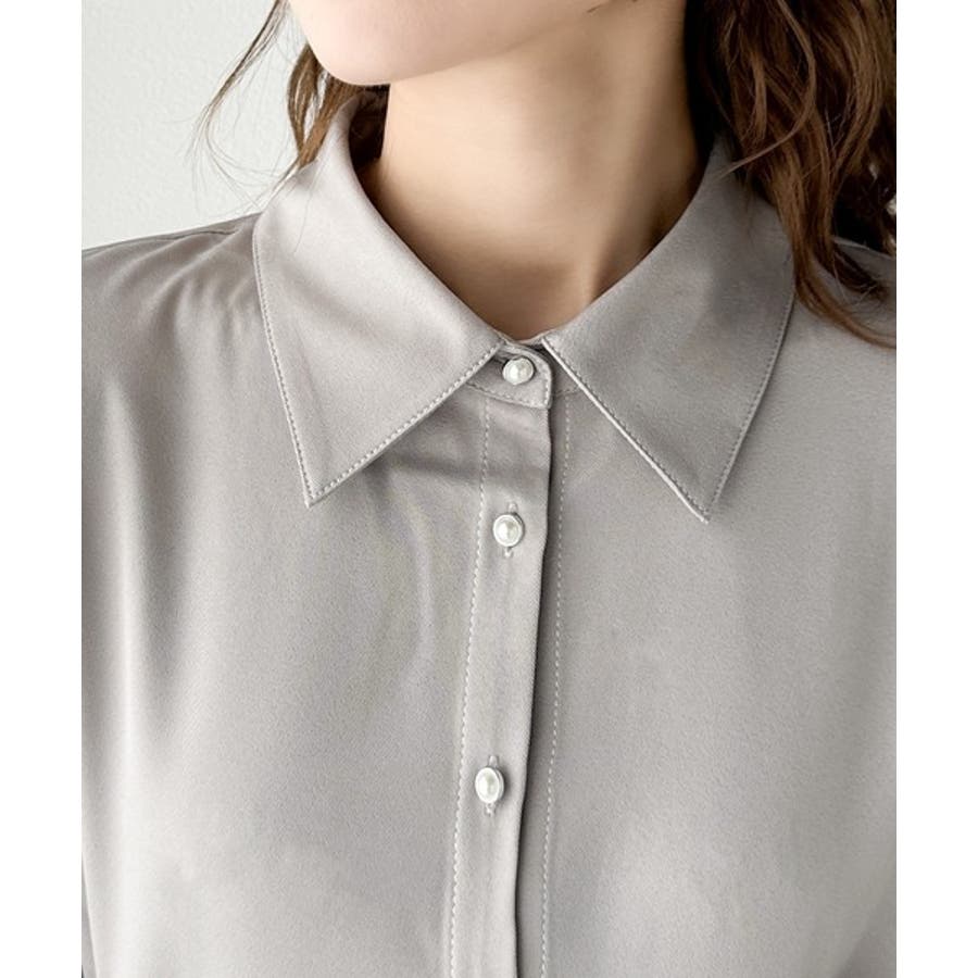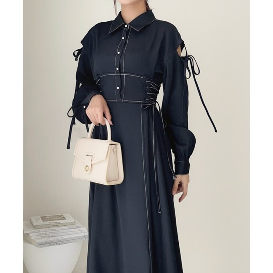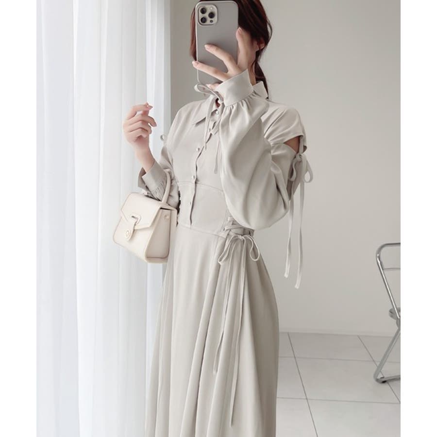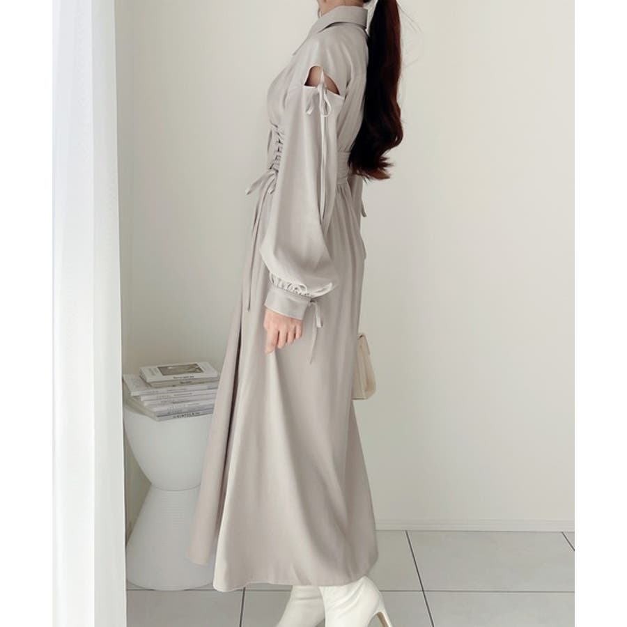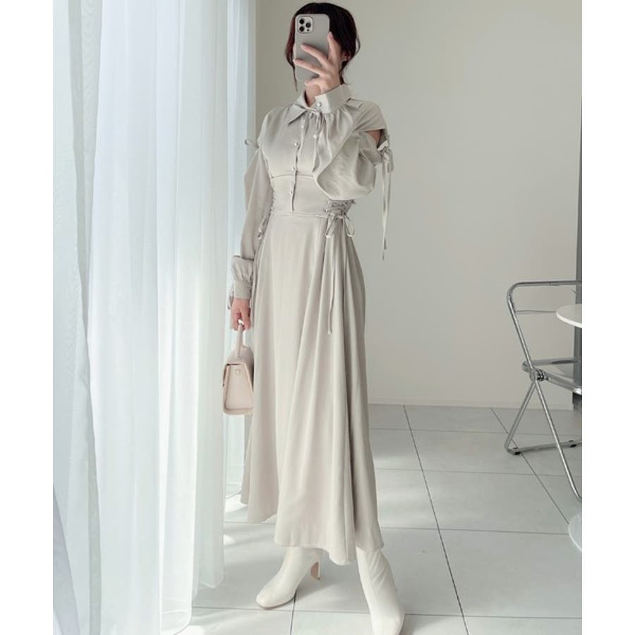 ショルダーと袖口、ウエストの3か所のリボンと艶めくパールボタンでレディライクな印象もたっぷり。