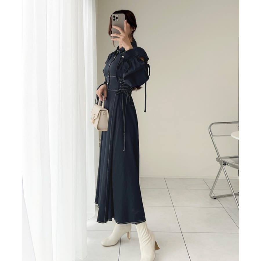 袖のカットデザインが抜け感を出し、サイドのレースアップでスタイルアップ効果アップも。