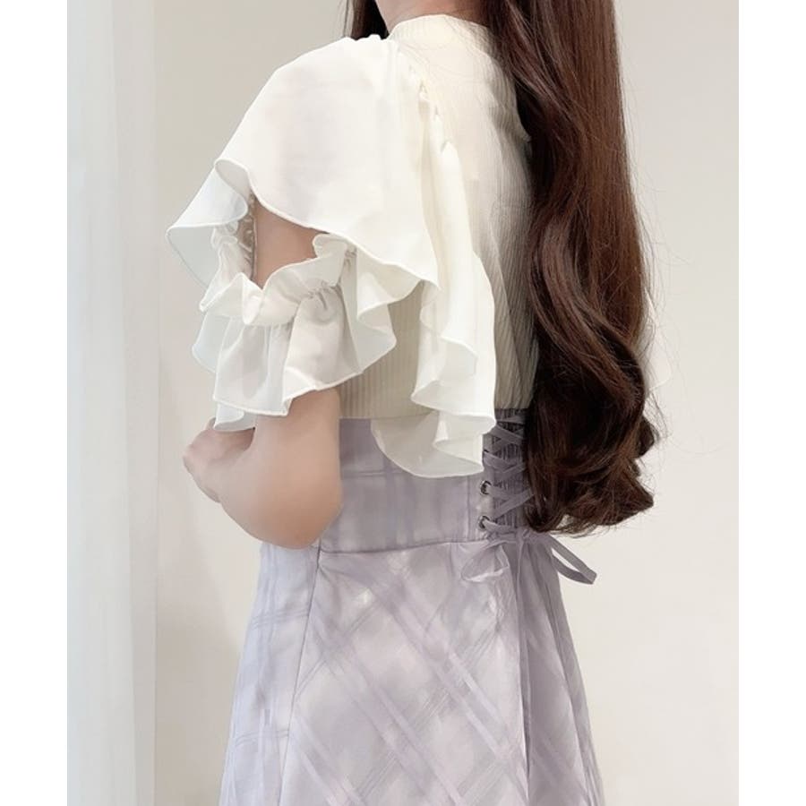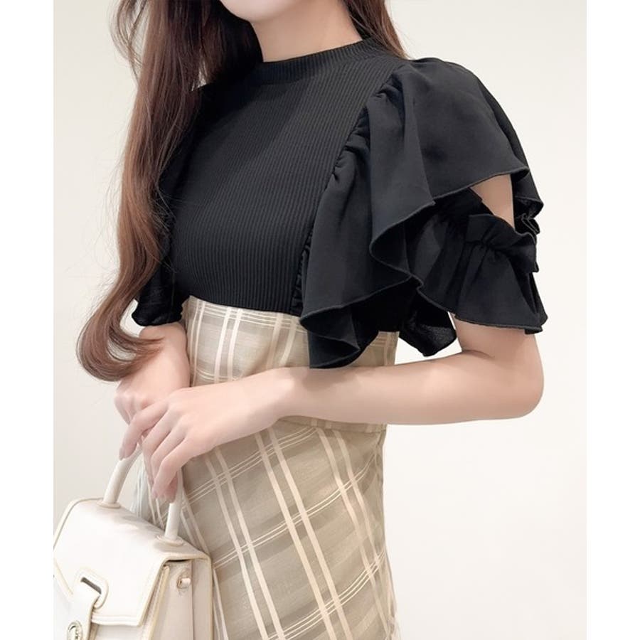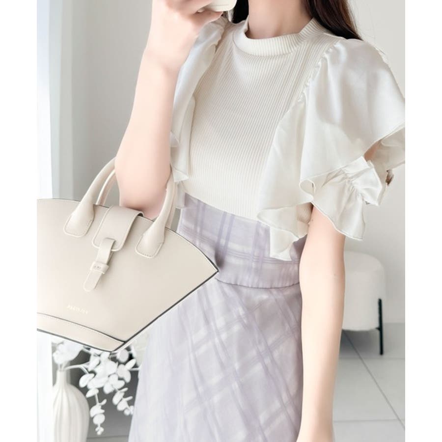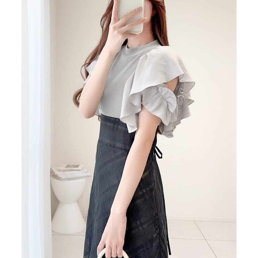 上身頃はリブニット素材×フリル袖の切り替えでメリハリのあるルックスに。