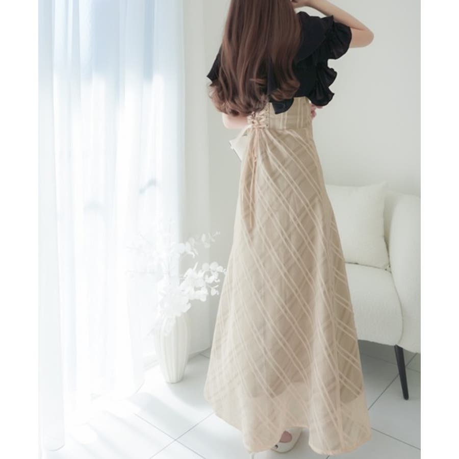 バックには編み上げシャーリングでフィット&フレア感を自然に演出しています。