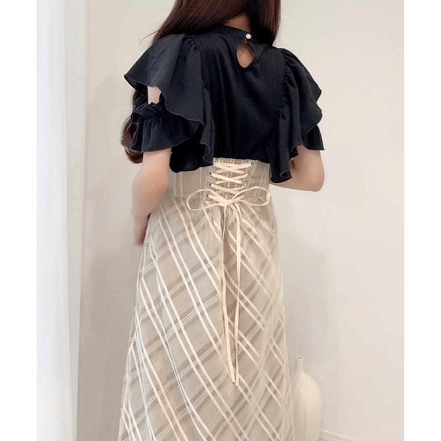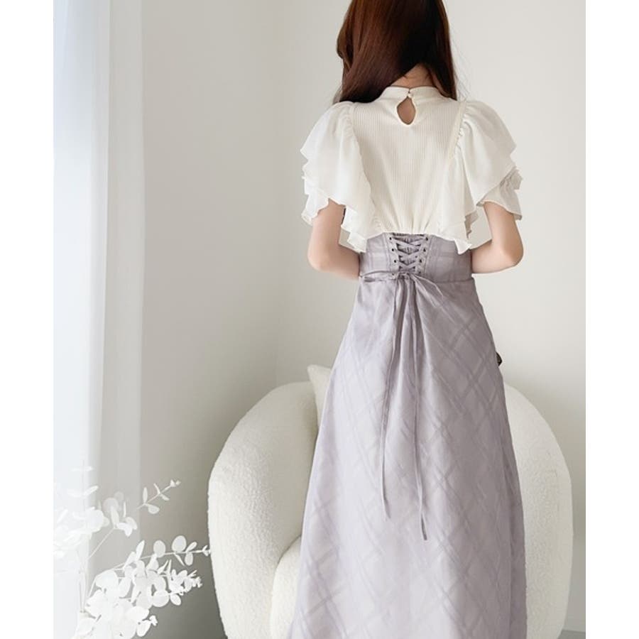 1枚で着映えする。ダブルフリル袖チェックレースドッキングワンピース