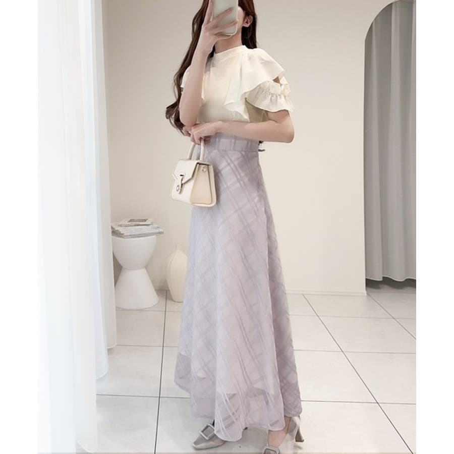 スカートは清涼感のあるシアー素材、裏地をサテンの配色にして質感を出しています。