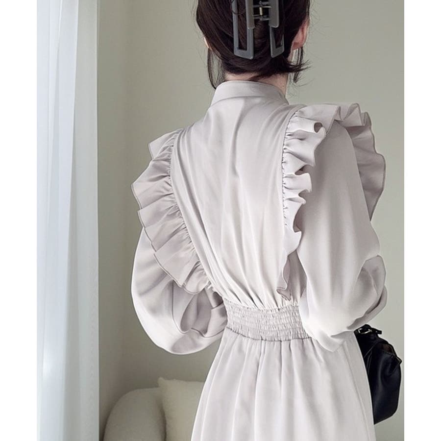 肩からウエストにかけてのフリルデザインは、