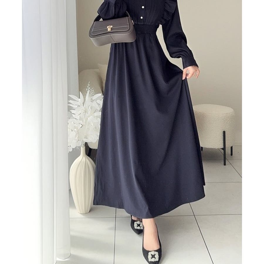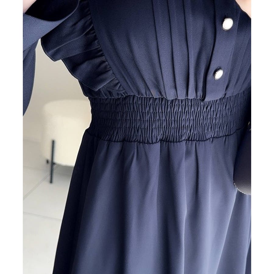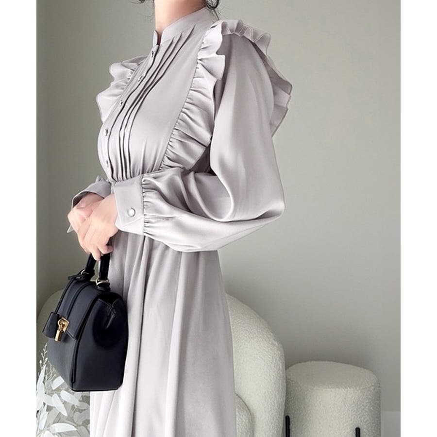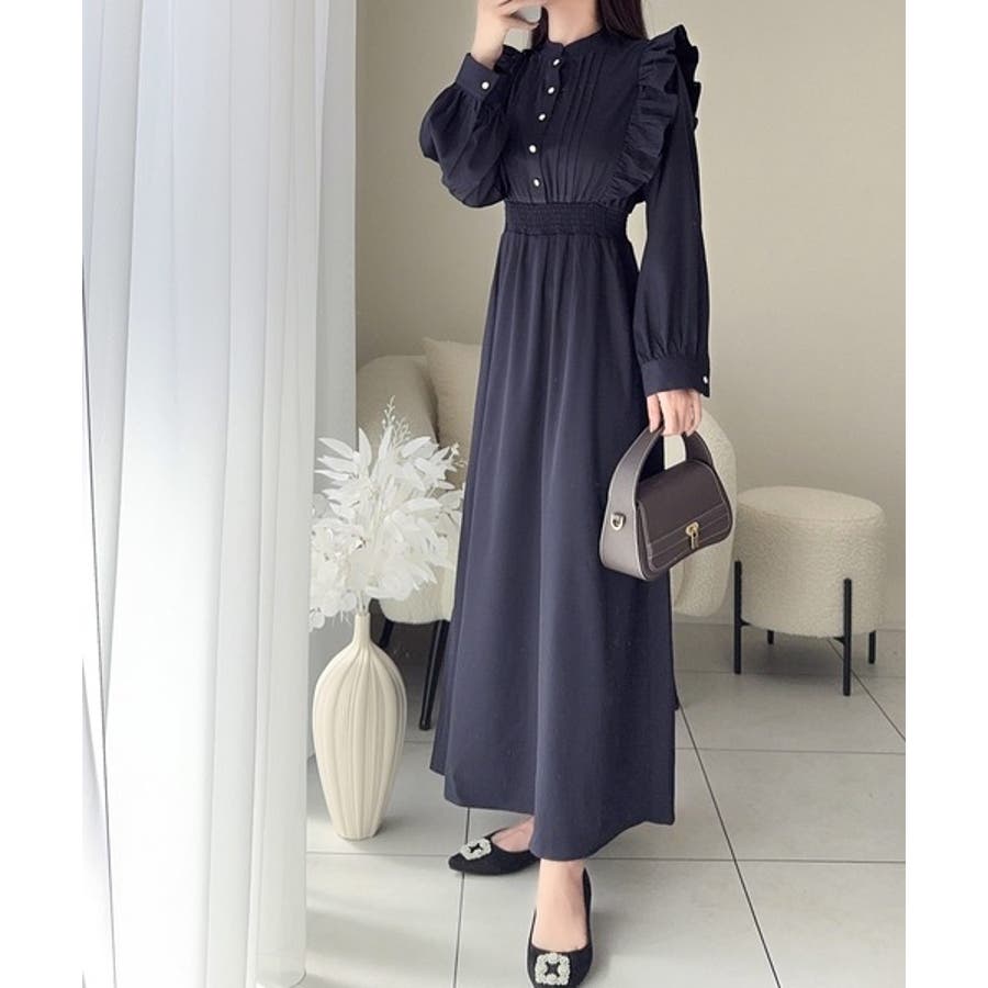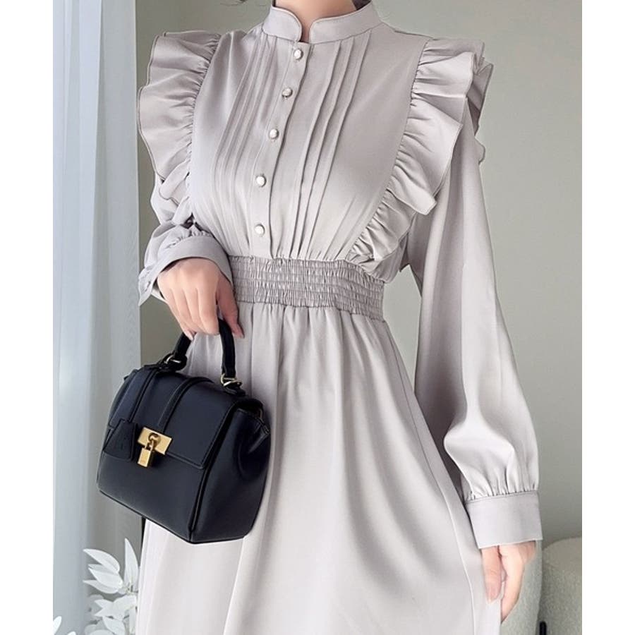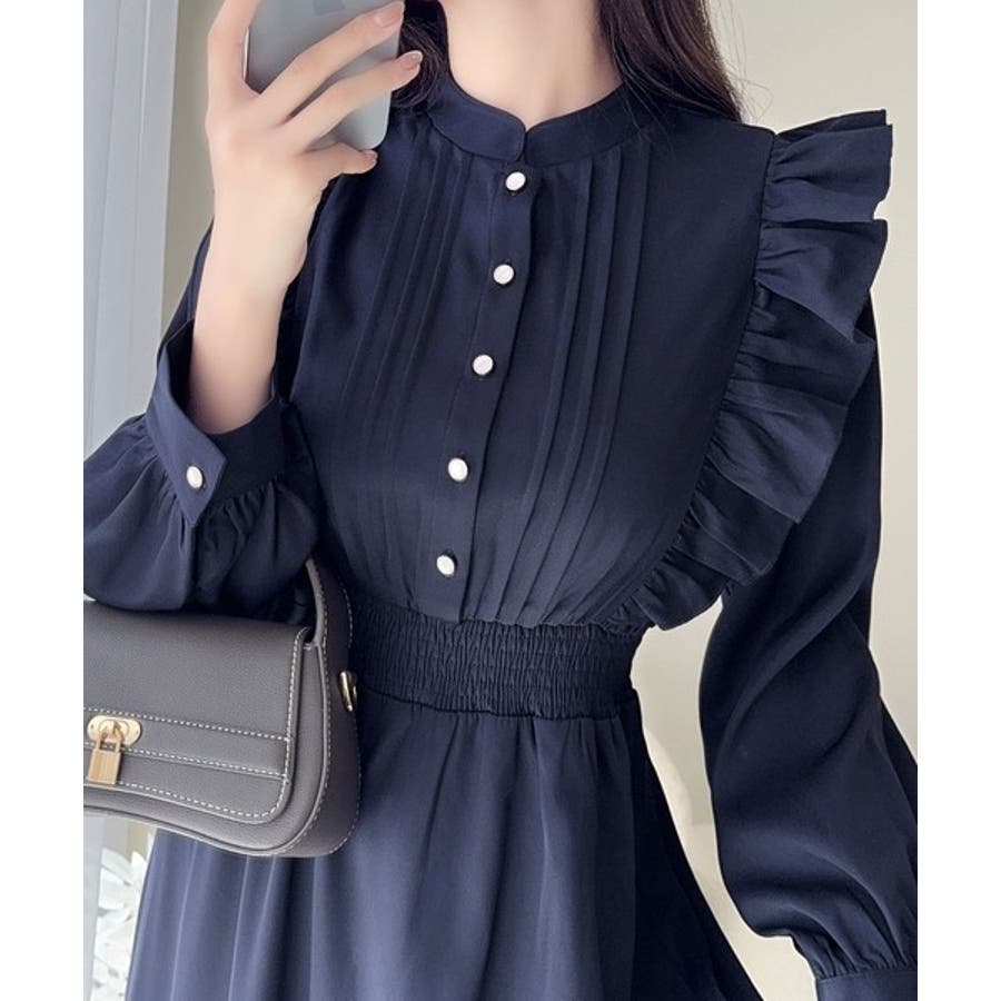 スタンドカラーでフロントピンタックデザインのワンピース。