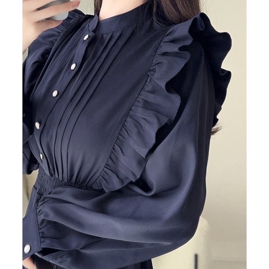 スタンドカラーで首元すっきりで大きなサイドフリルで小顔効果と、