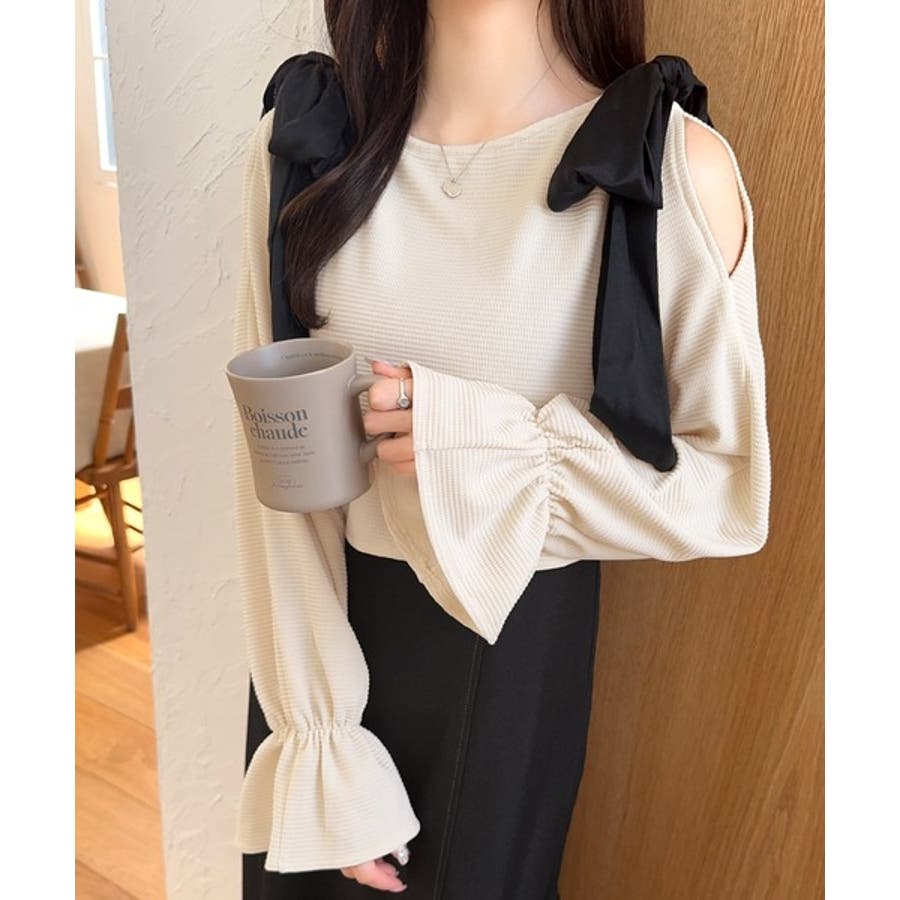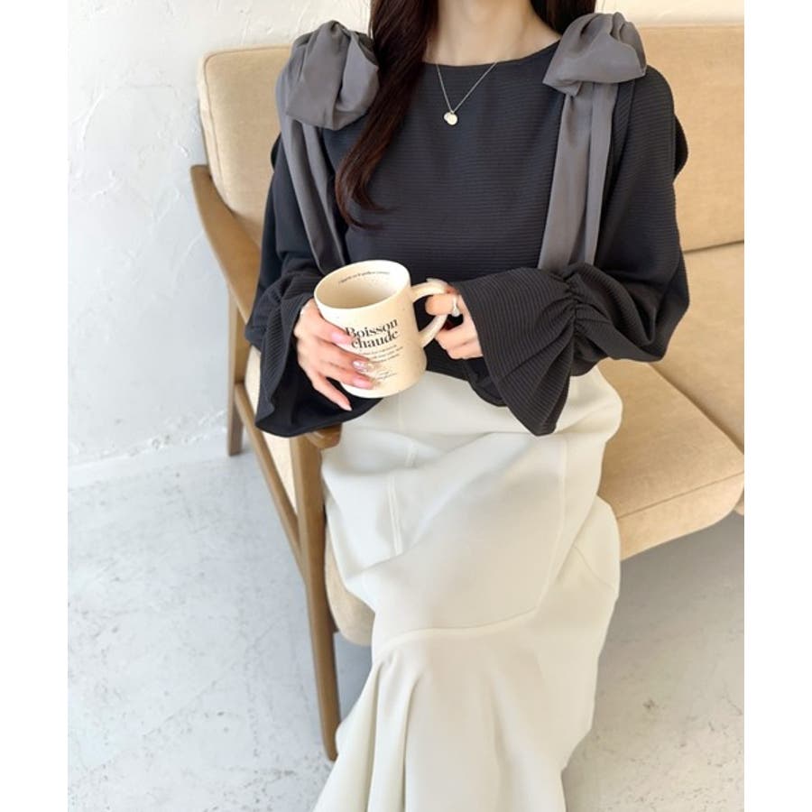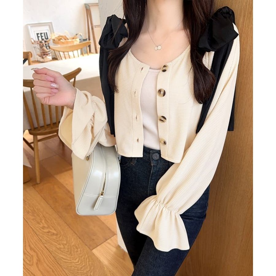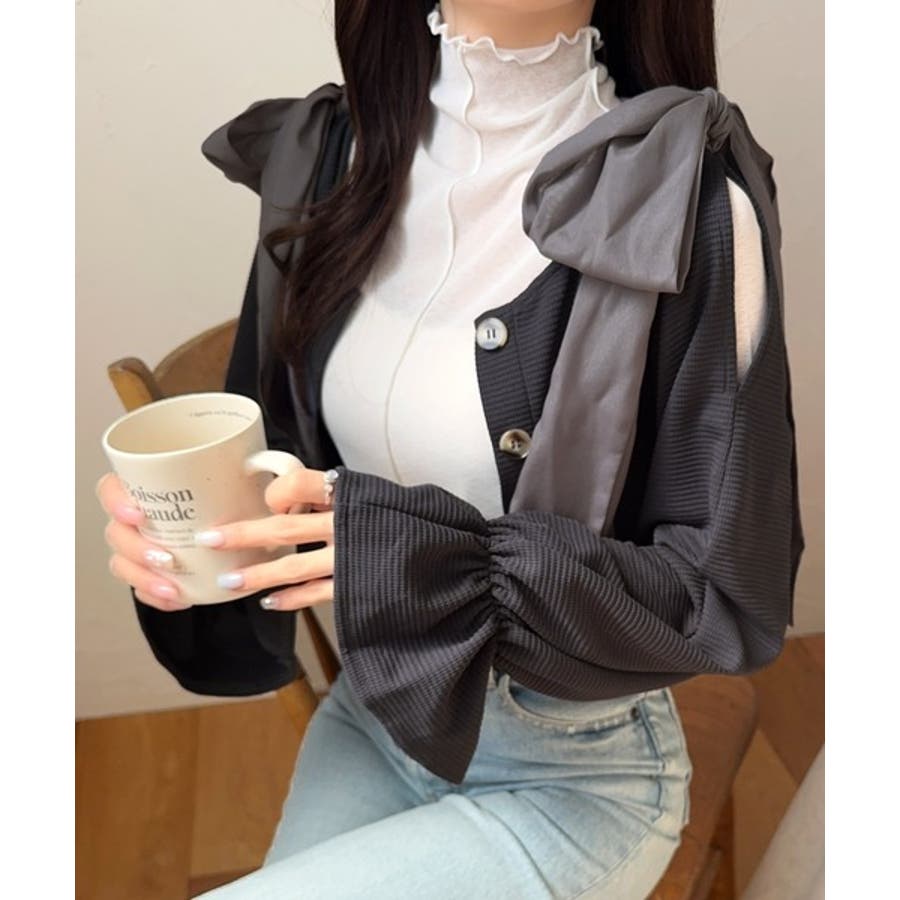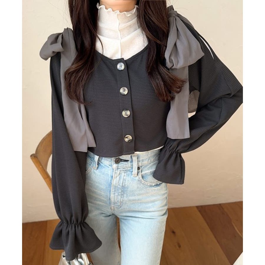 大きい肩リボンが特徴のカーディガンはスカートに合わせて