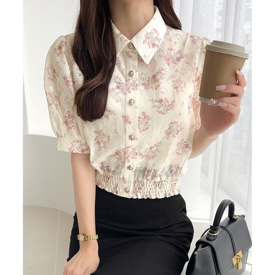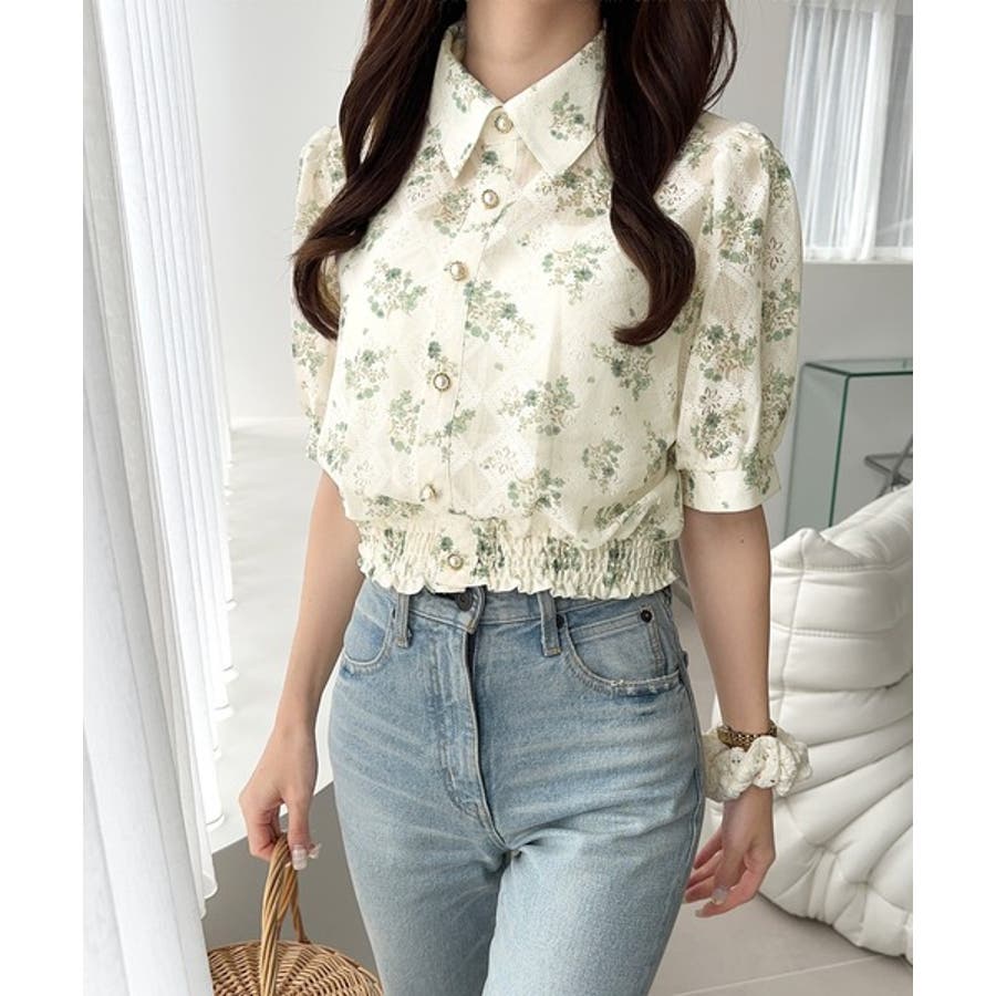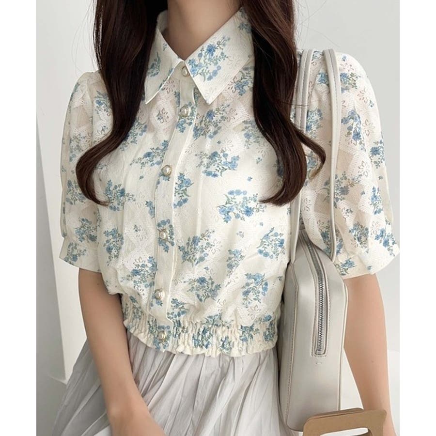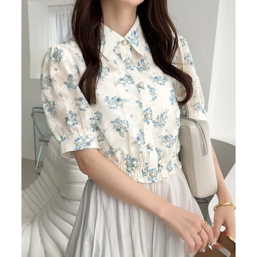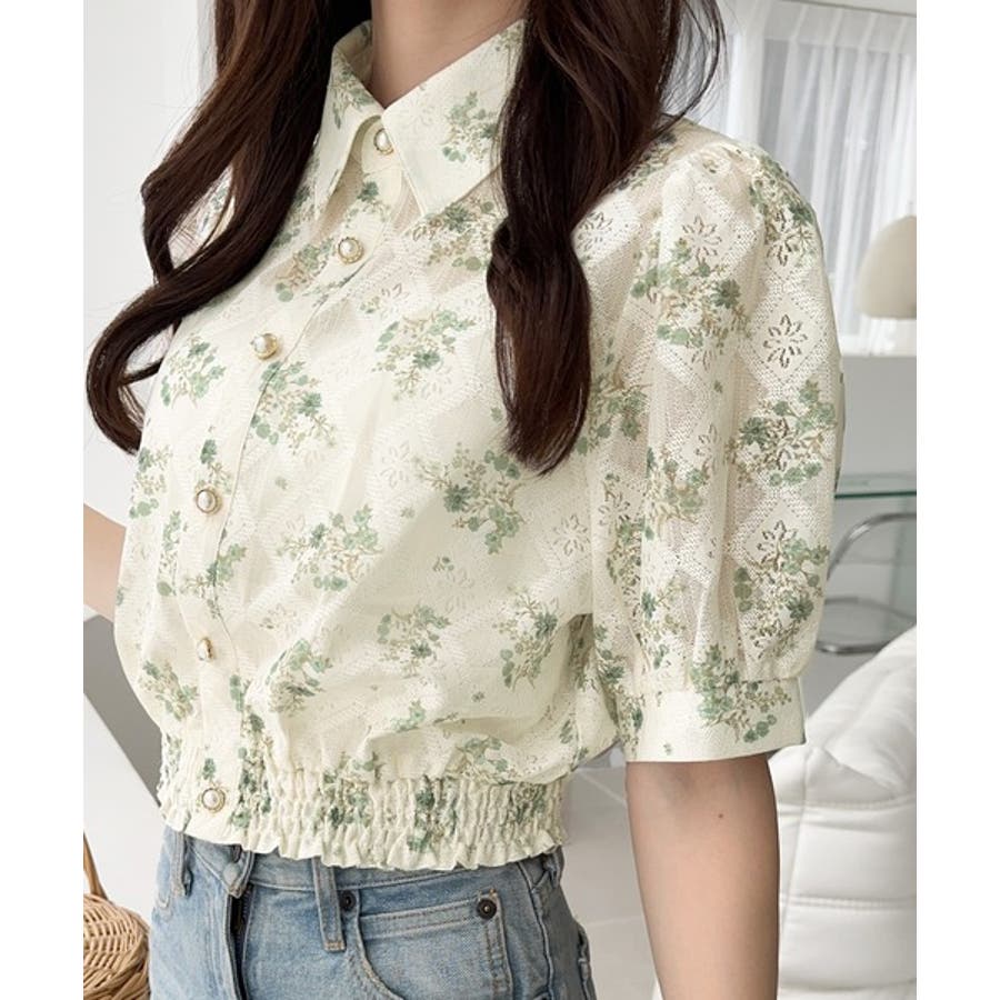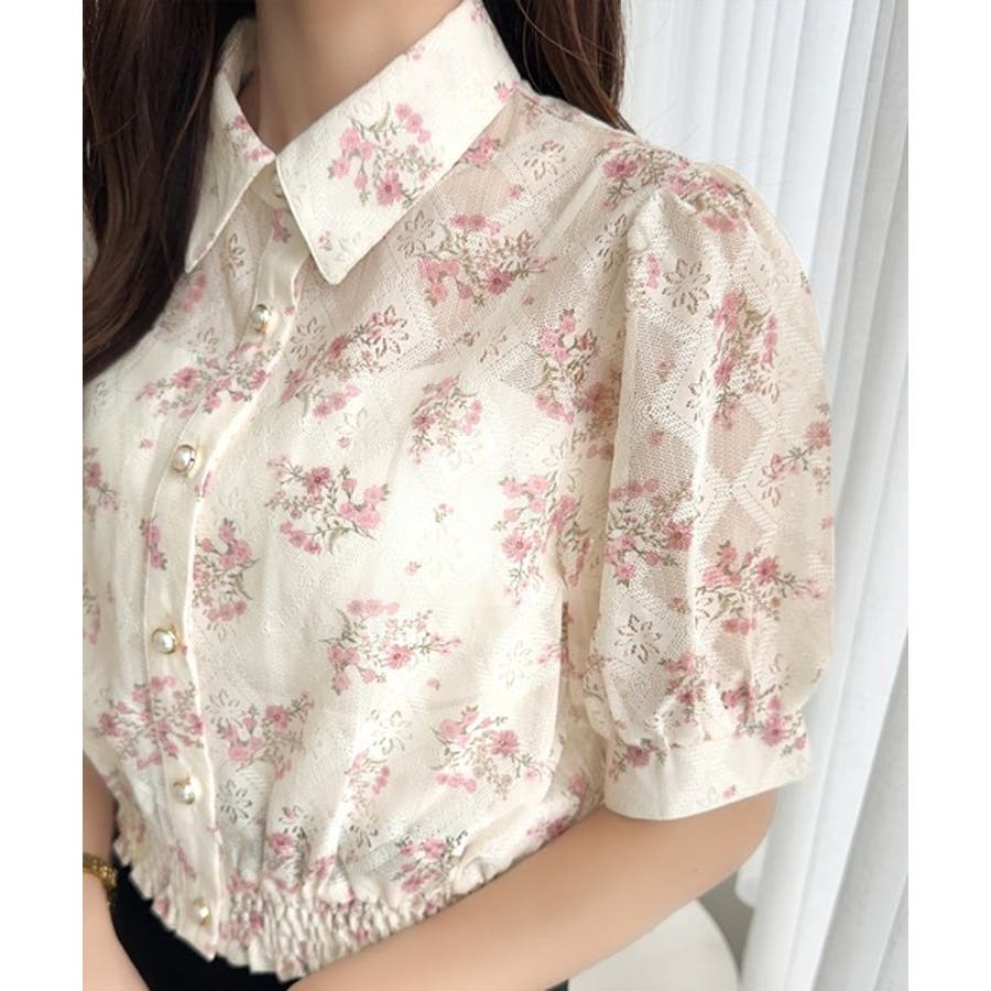 スタイルアップ効果抜群♪花柄シアーレースショート丈ブラウス