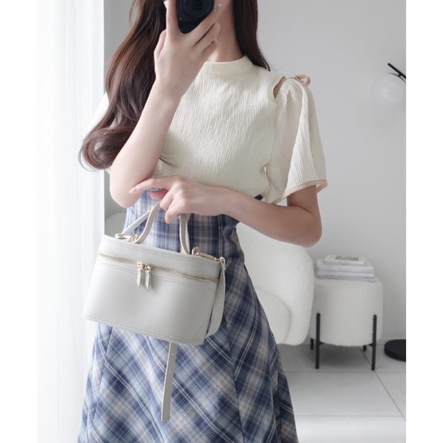 ふんわり感のあるトップスに後ろリボンで簡単にウエストマークできるスタイルアップデザイン。