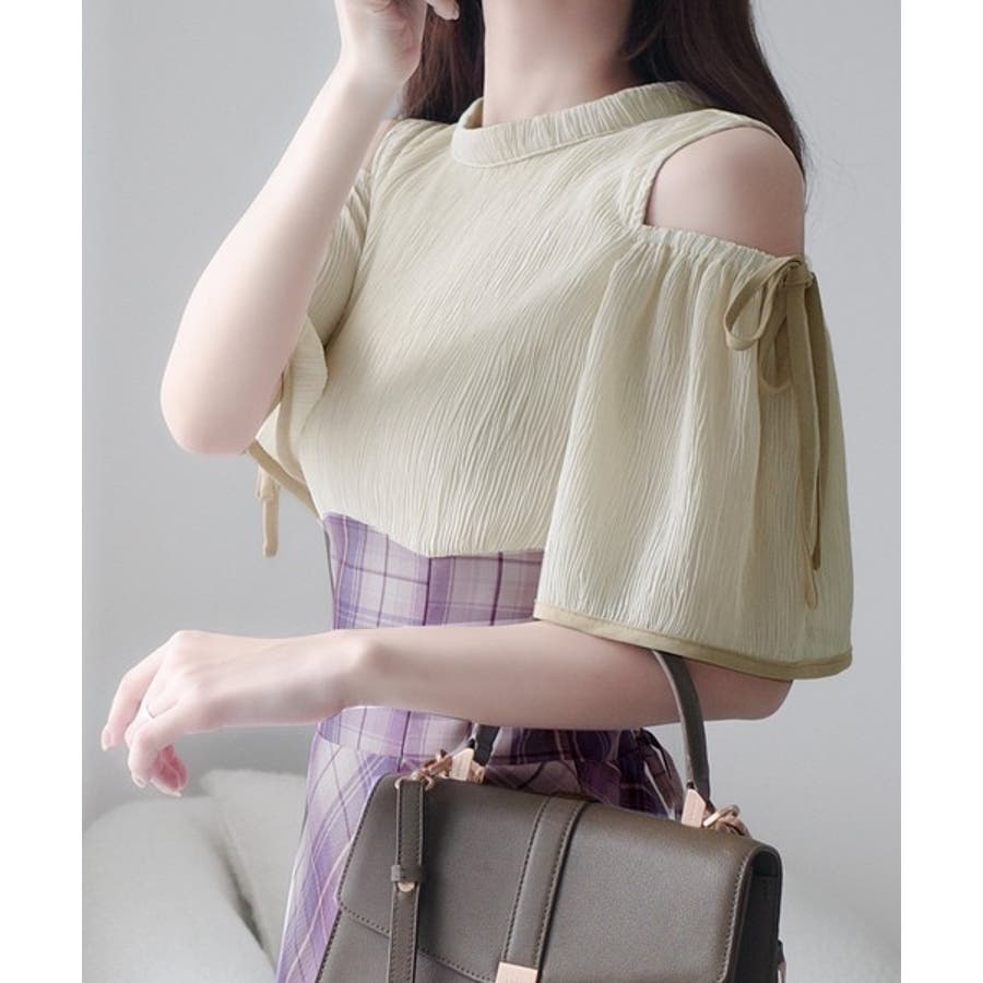 リボンデザインの肩開きのフレアースリーブがフェミニン!