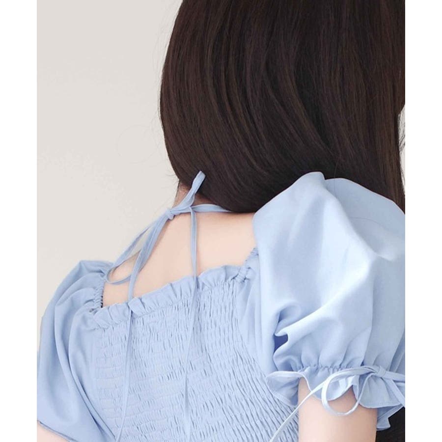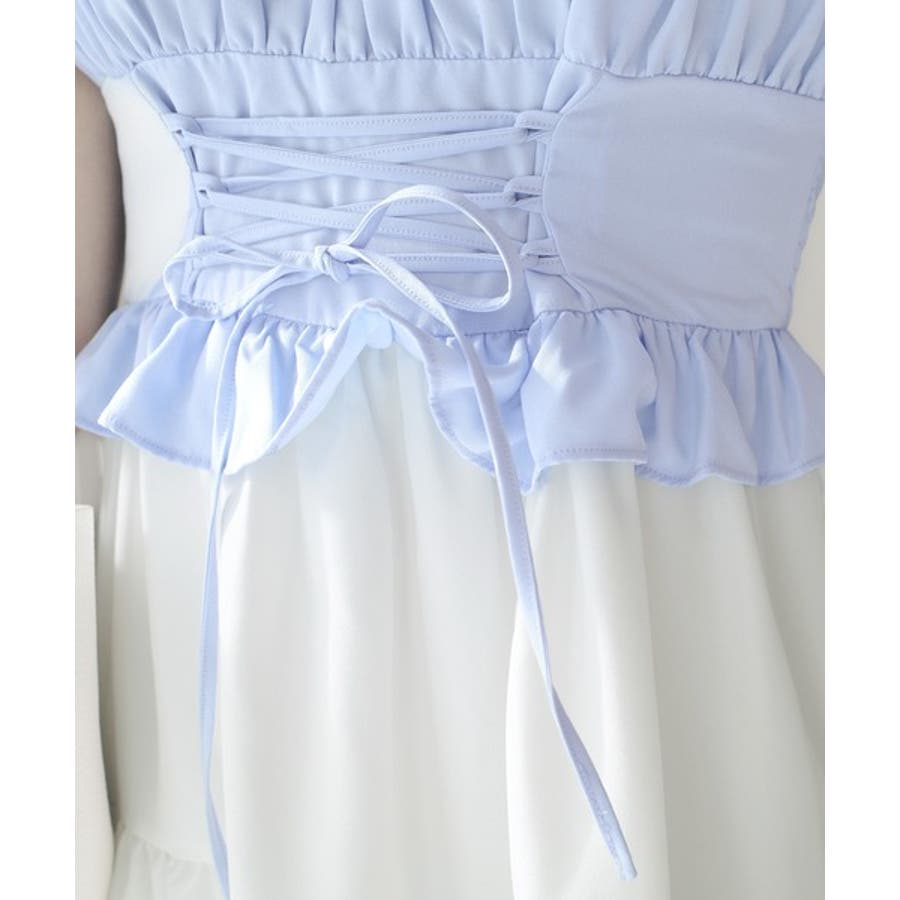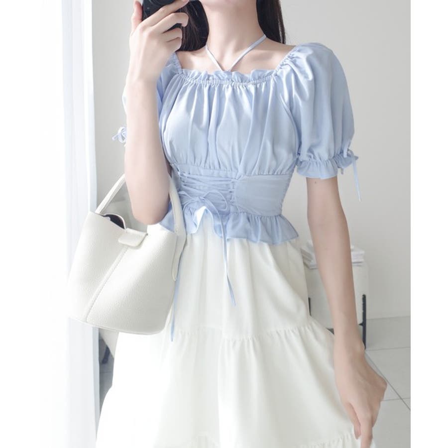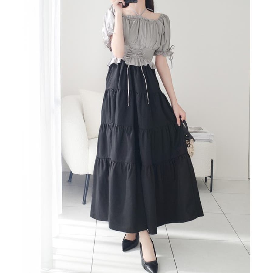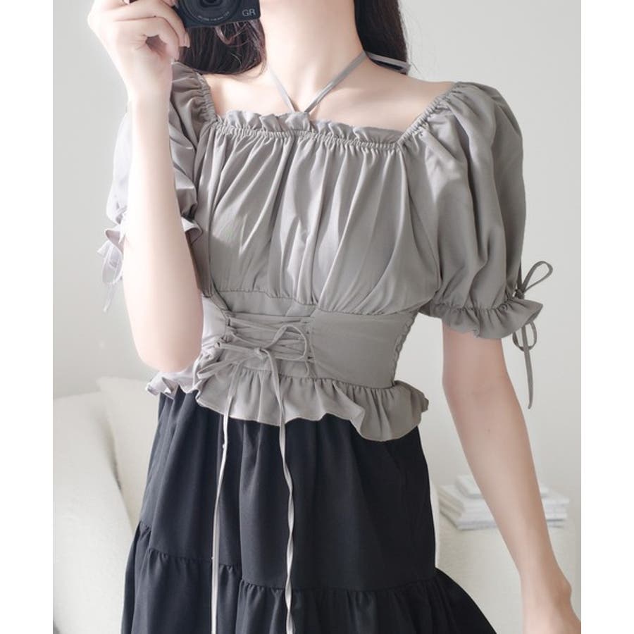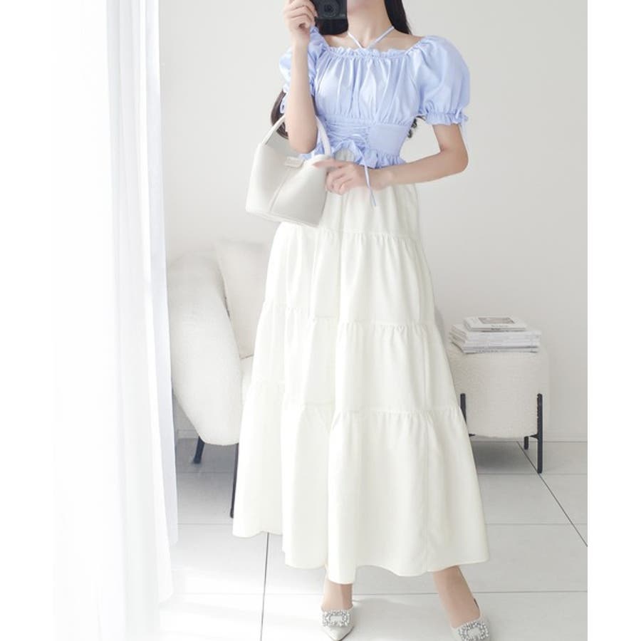 リボン編み上げ仕様とバックシャーリング仕様で、トップスは程よいフィット感です。
