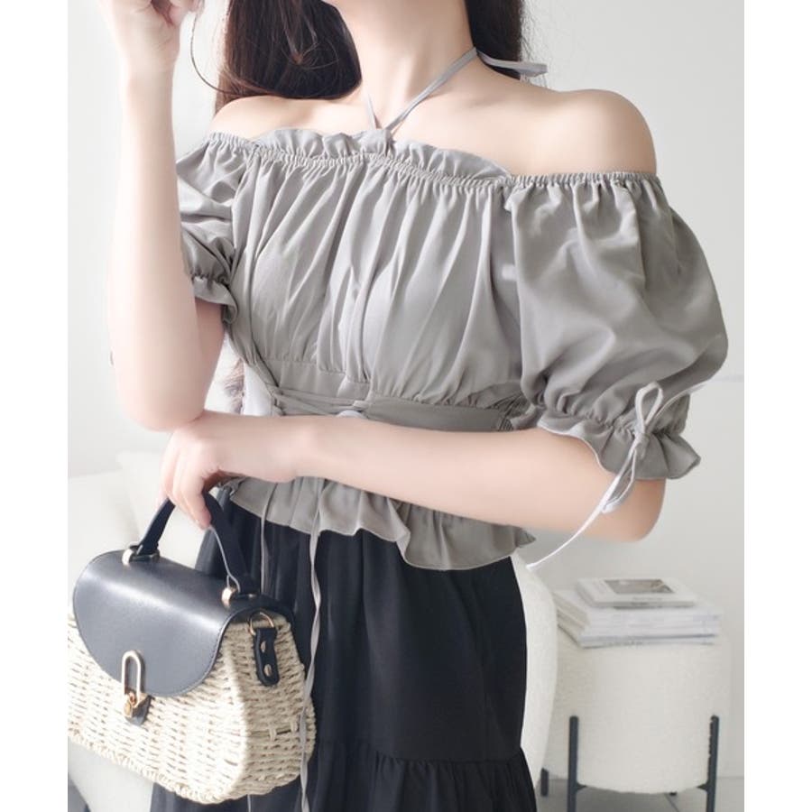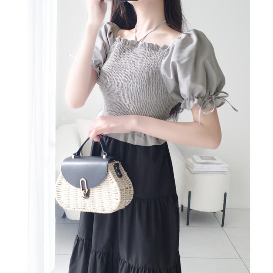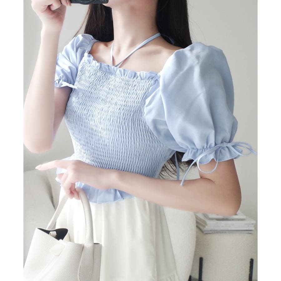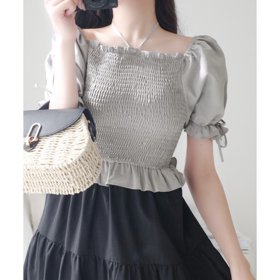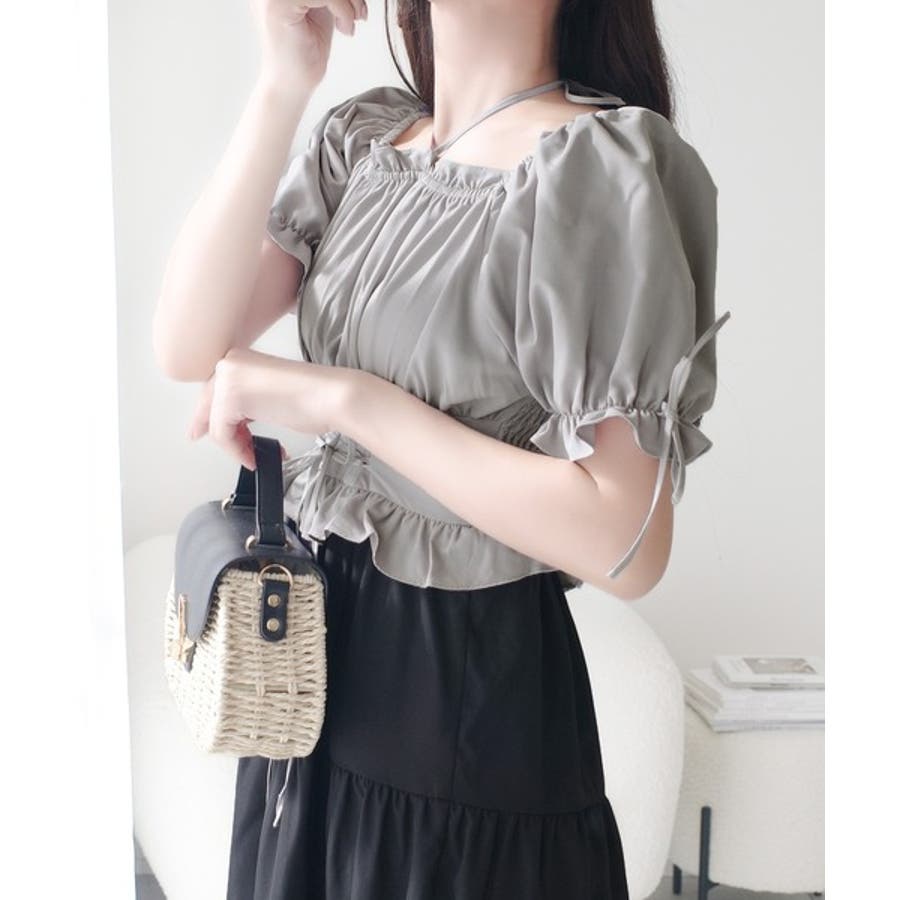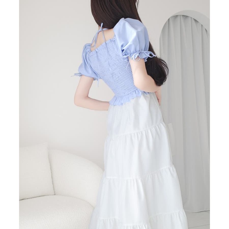 リボン編み上げ仕様とバックシャーリング仕様で、トップスは程よいフィット感です。
