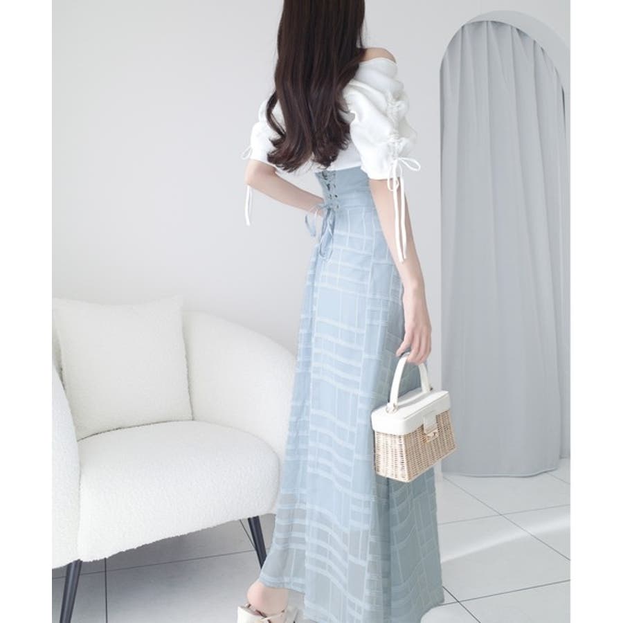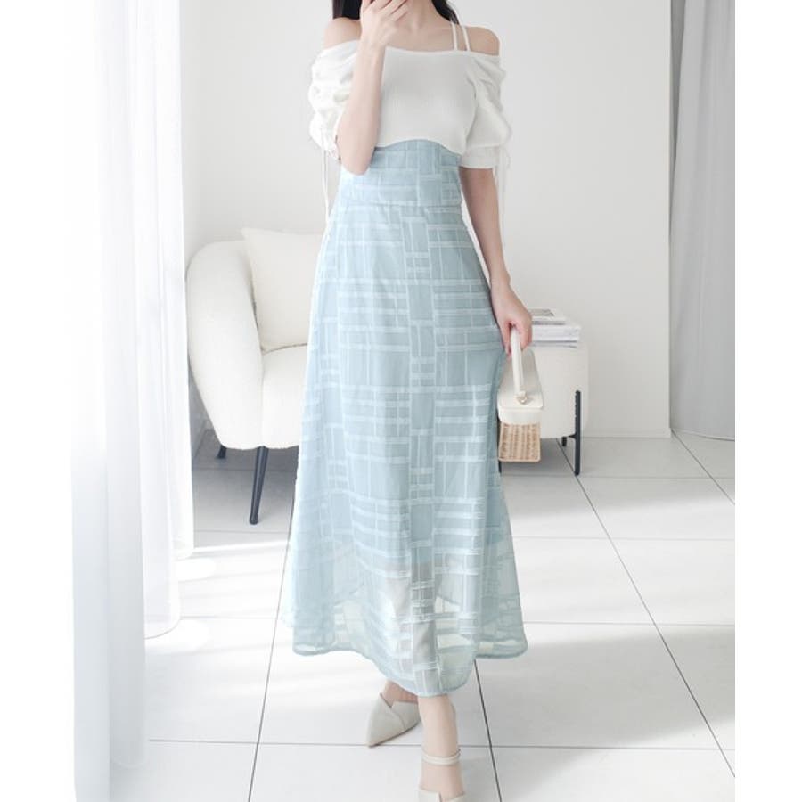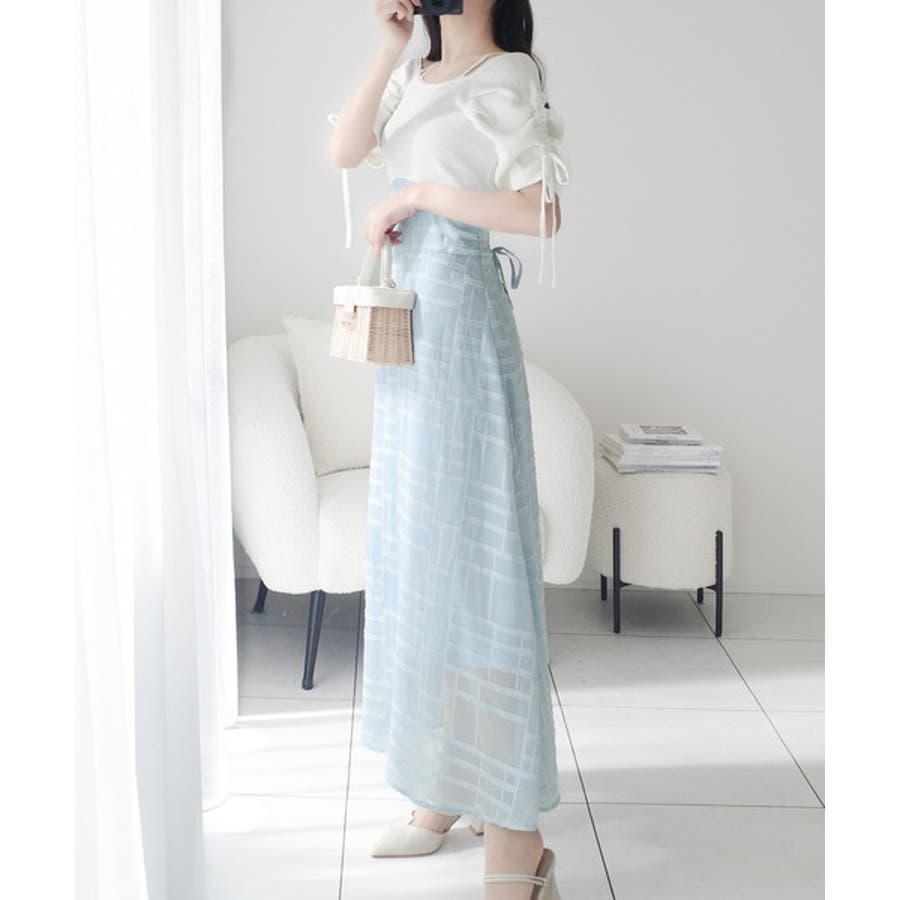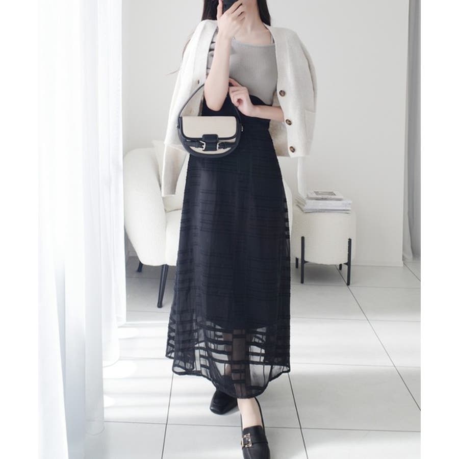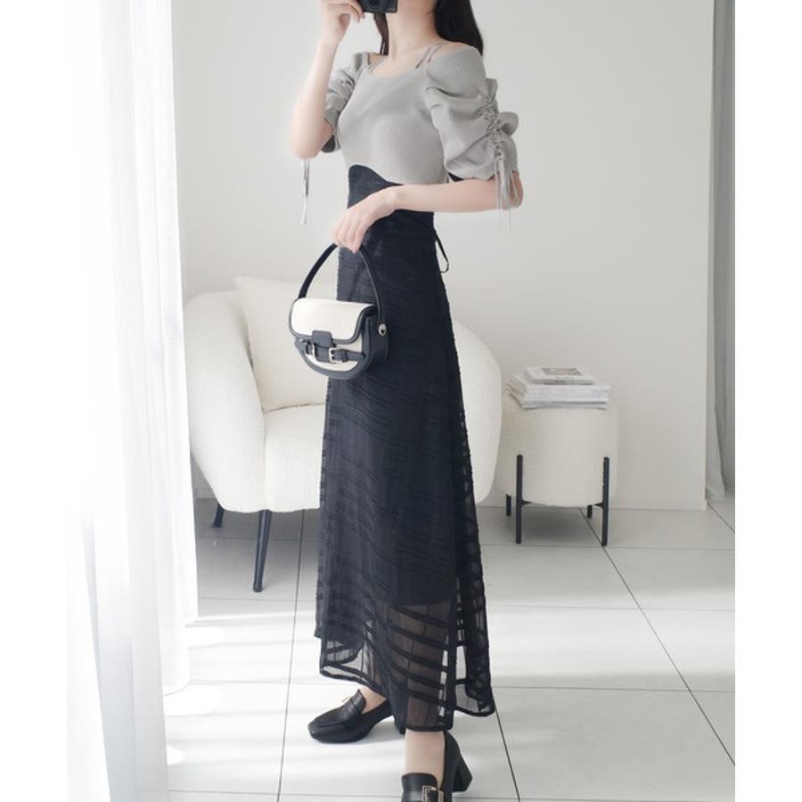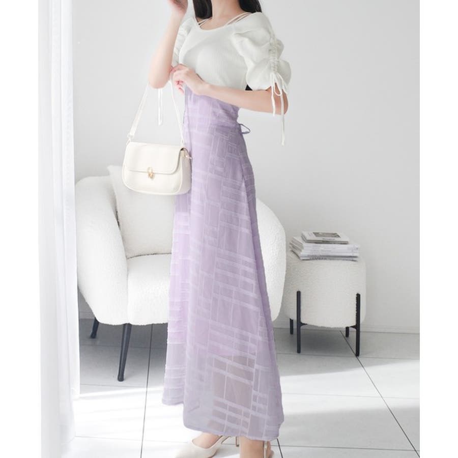 マキシ丈スカートの縦長シルエットでスタイルアップデザイン。