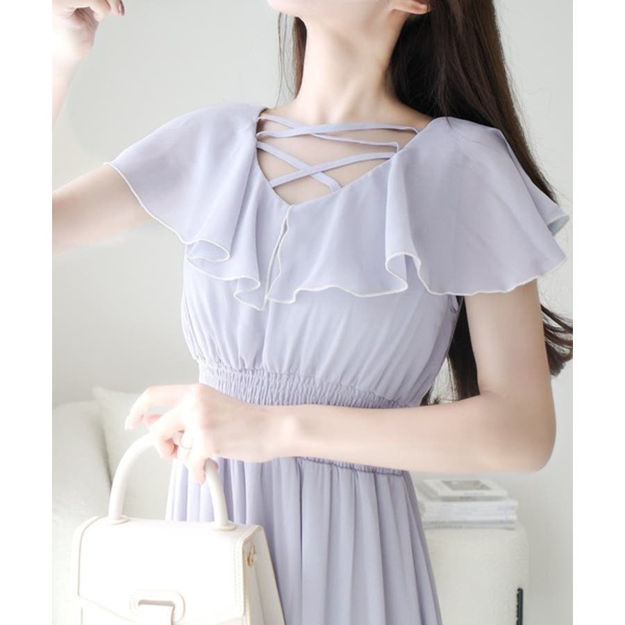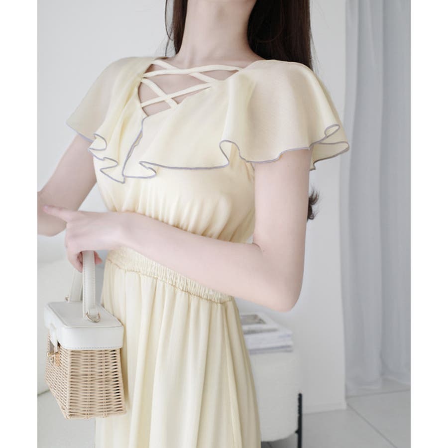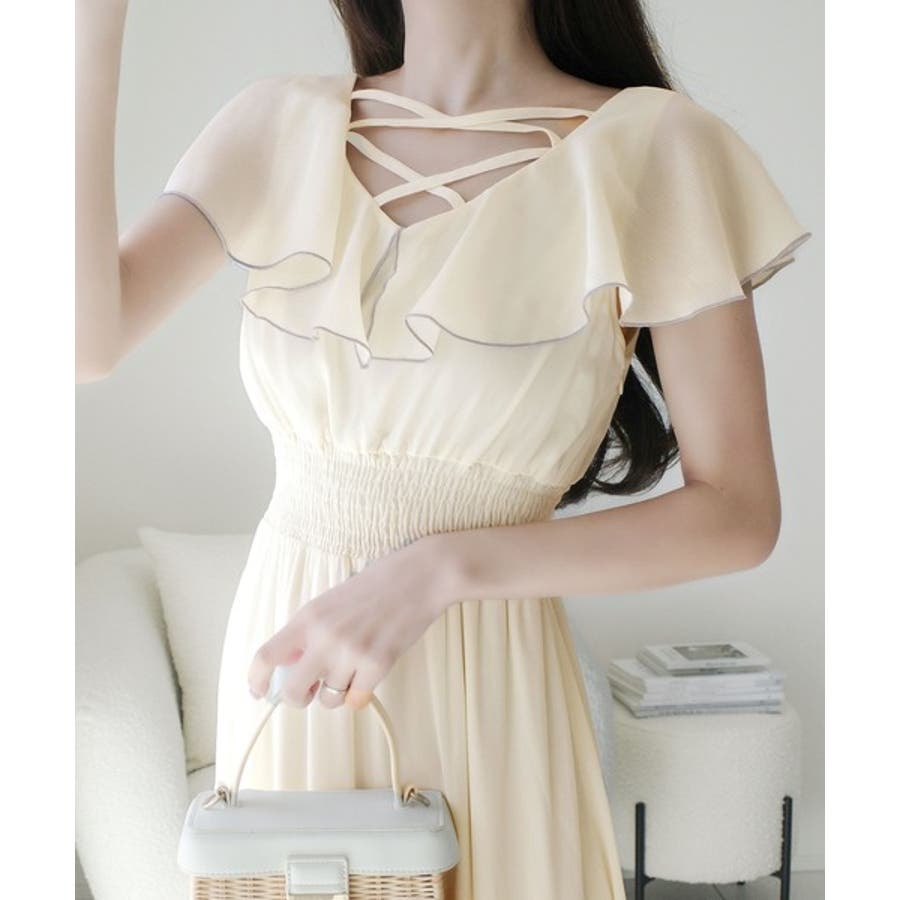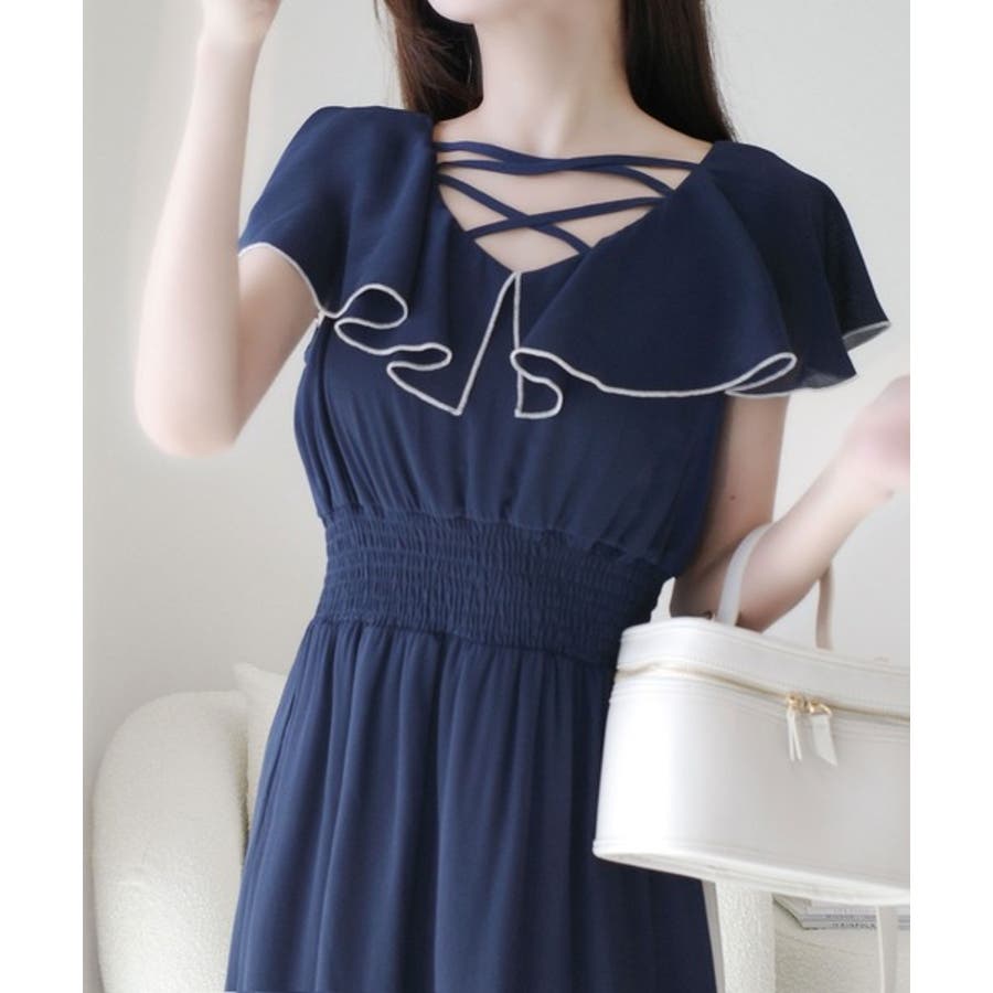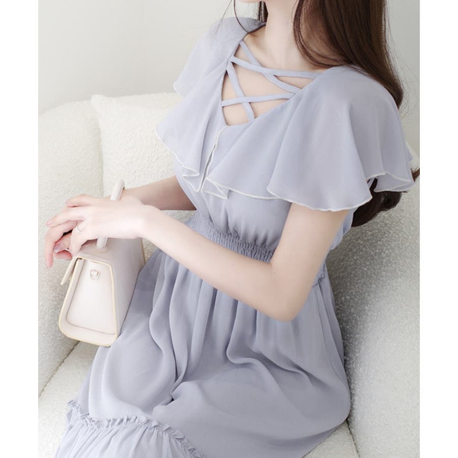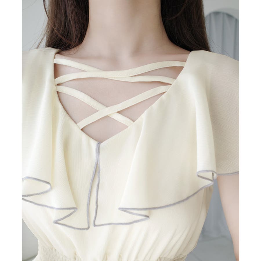 【mily bilet】今季上品に大活躍♪クロスデザイン楊柳使いフリル襟ワンピー…