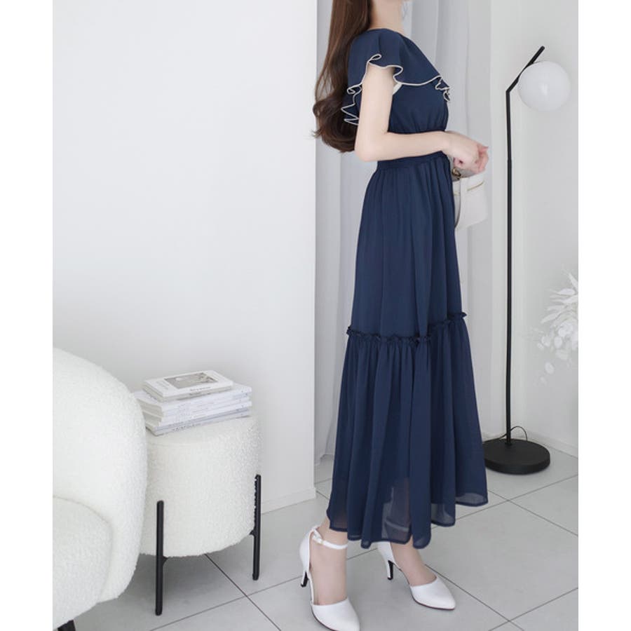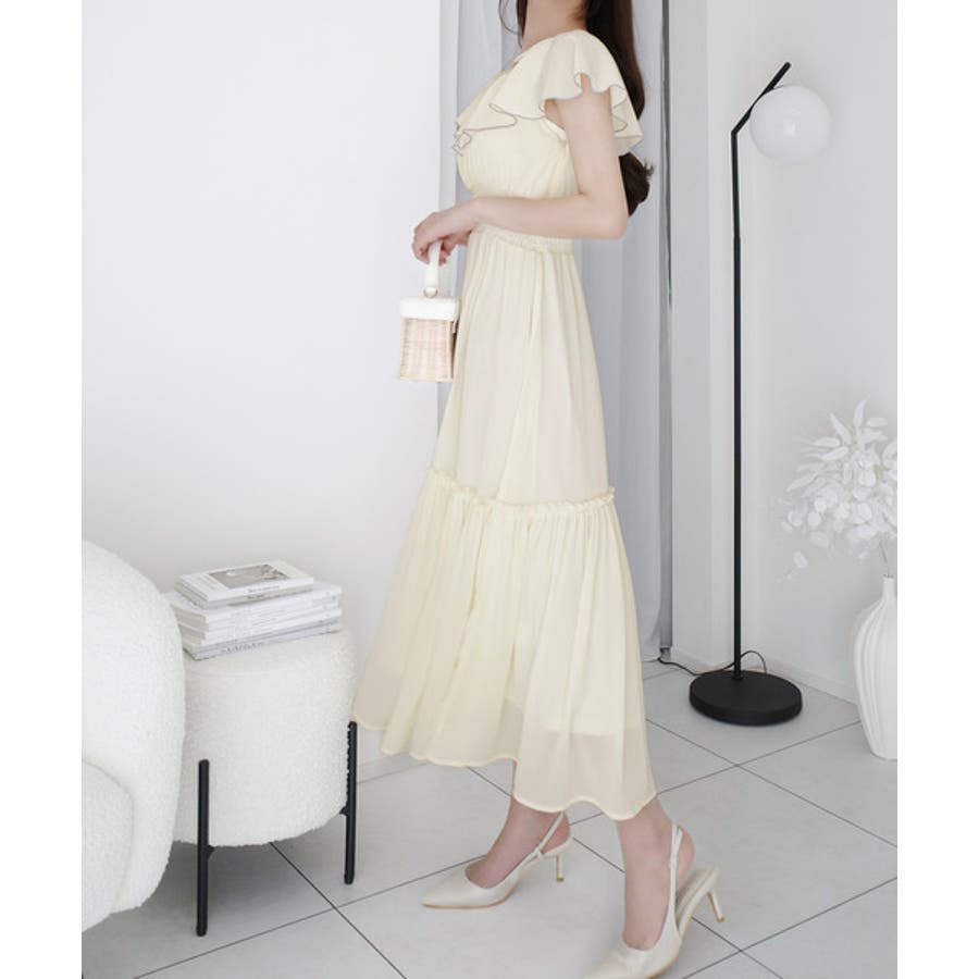 大きく開いた首元がすっきり見えて大きなフリルが小顔効果と、