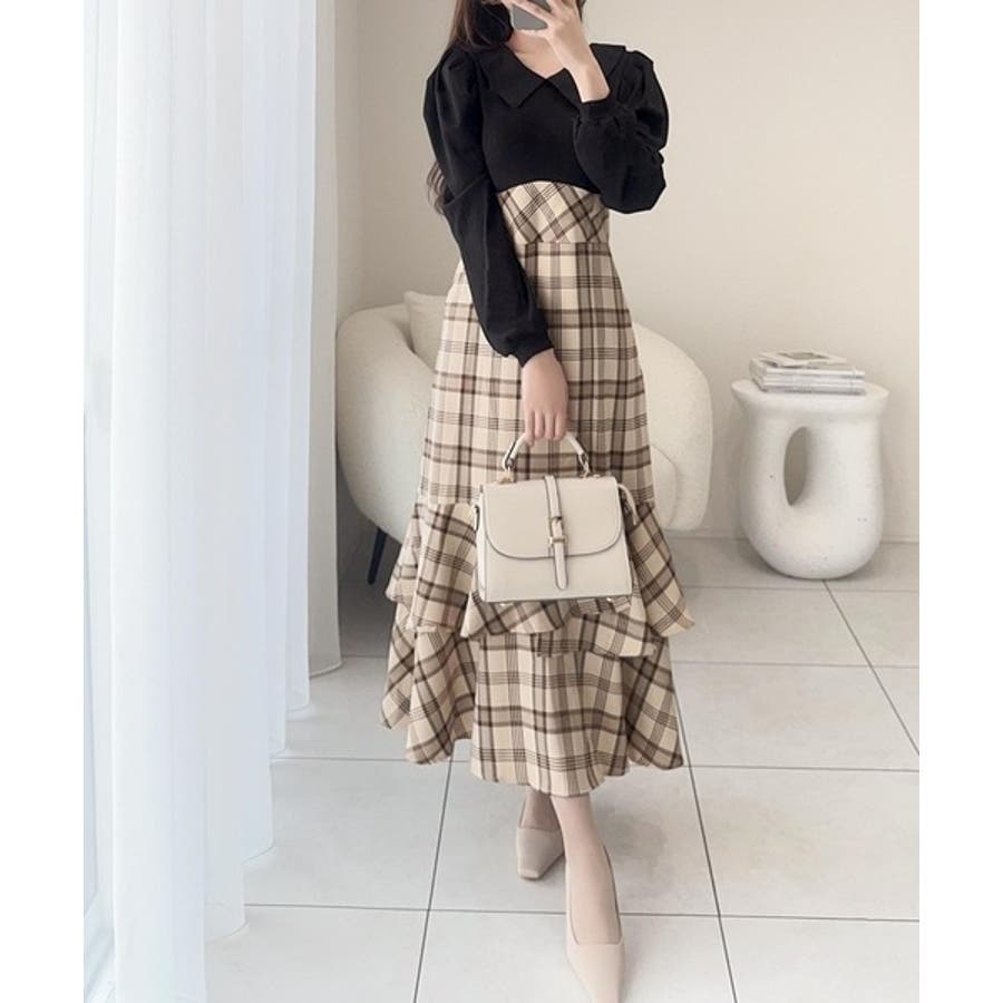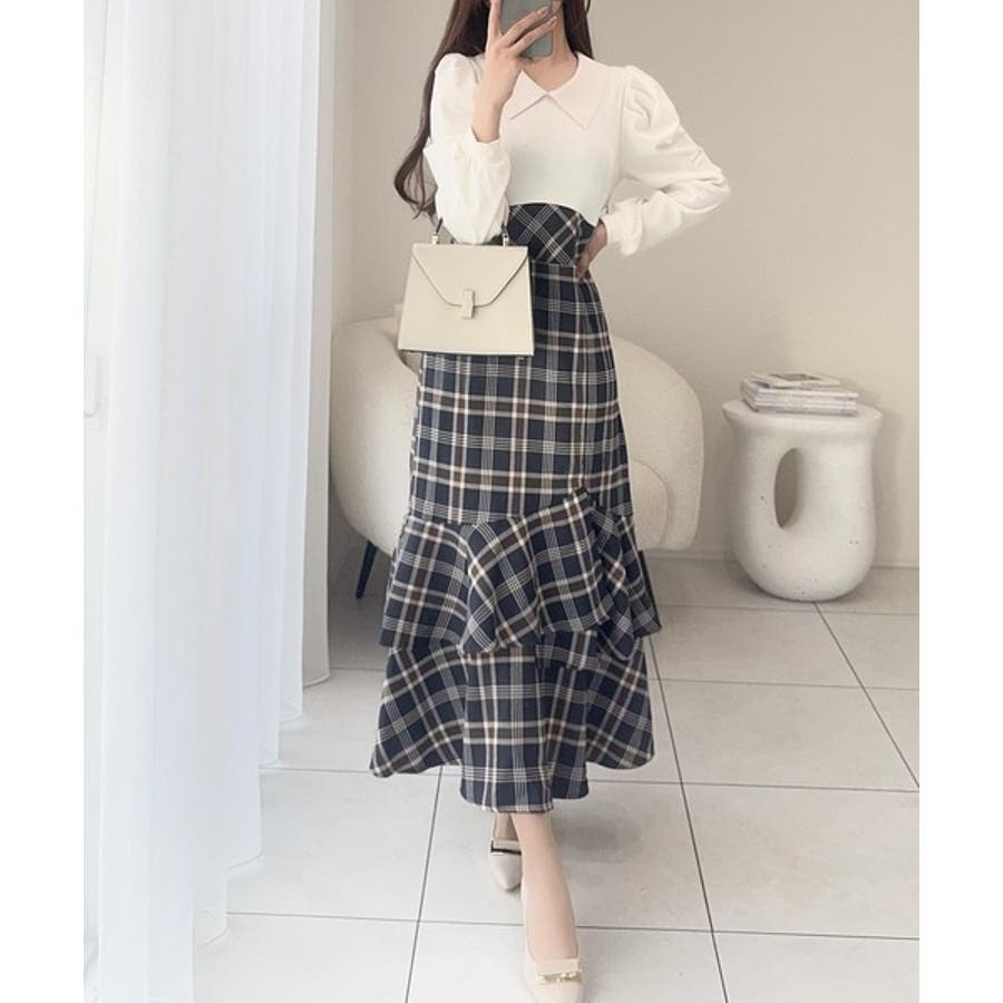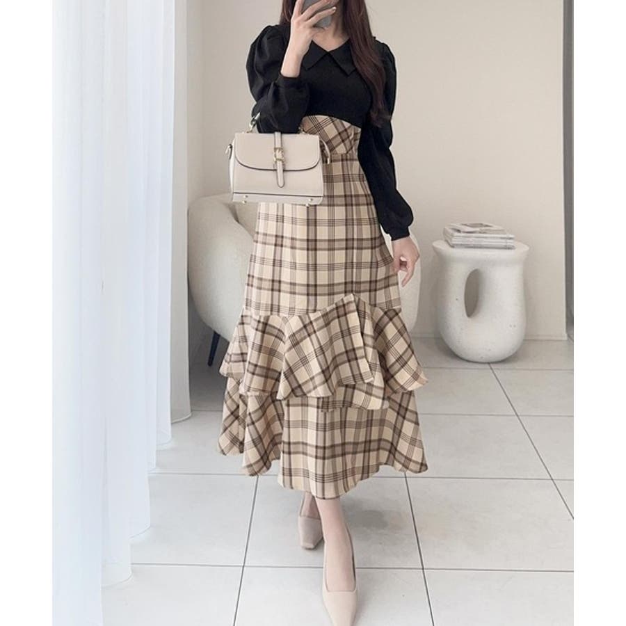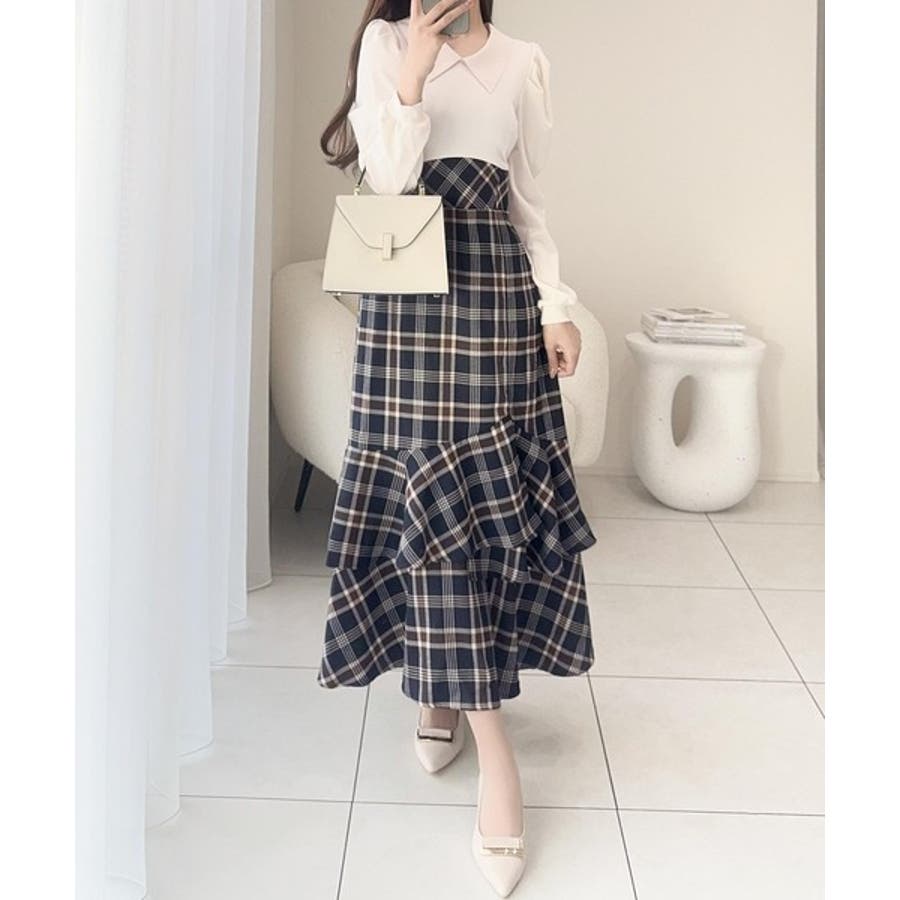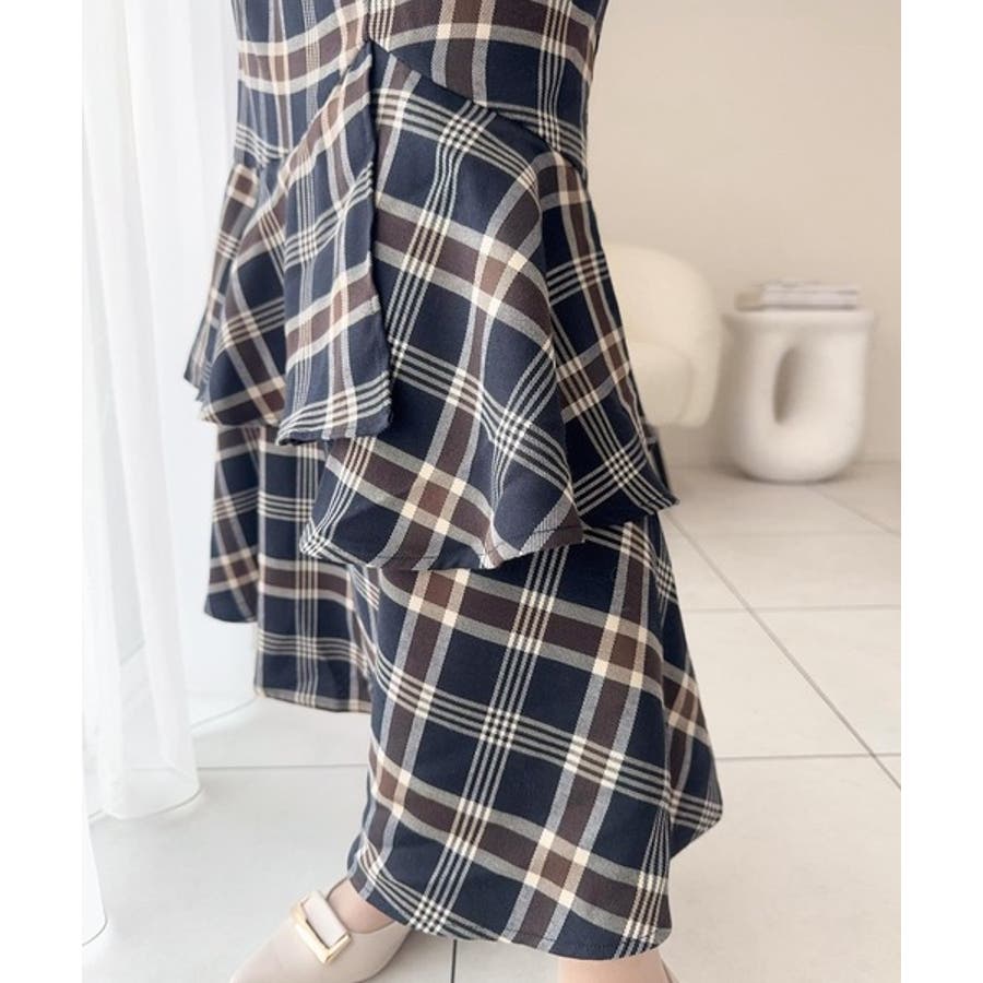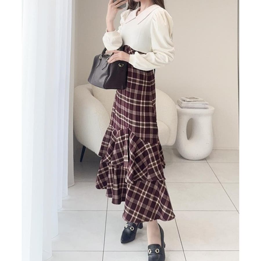 愛され要素がぎゅっと盛り♪シャツ襟チェックアシメフリルドッキングロングワンピース…