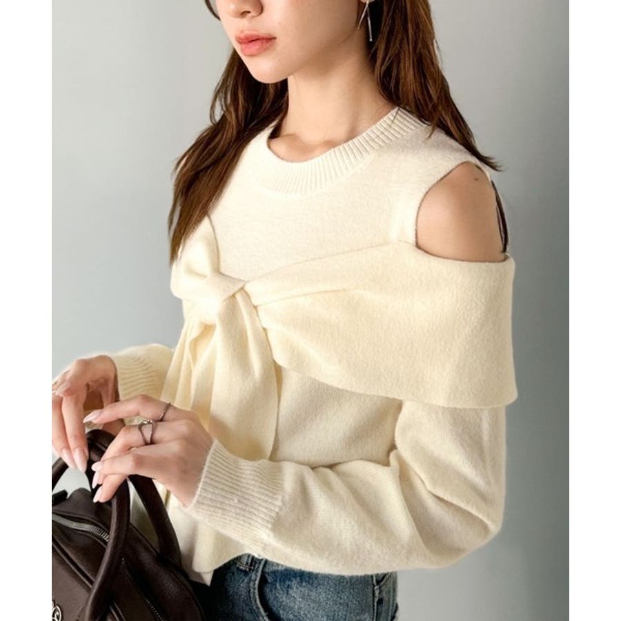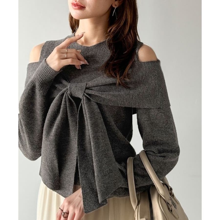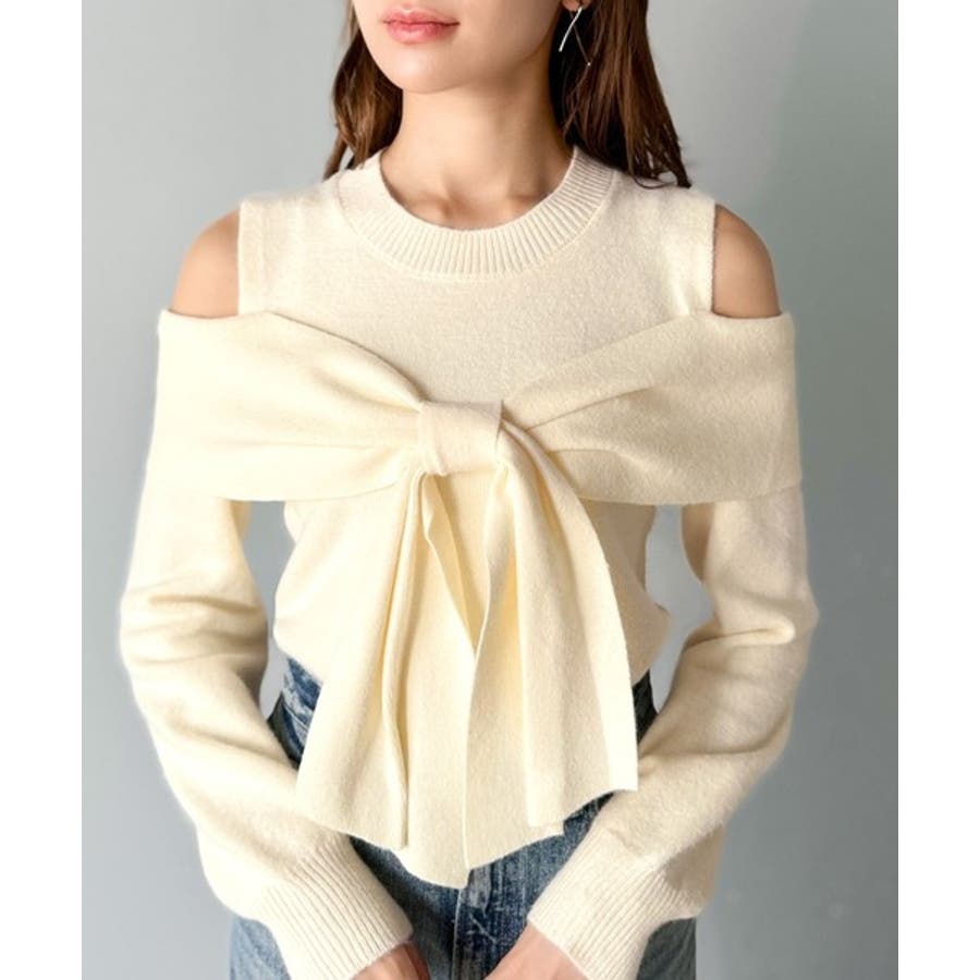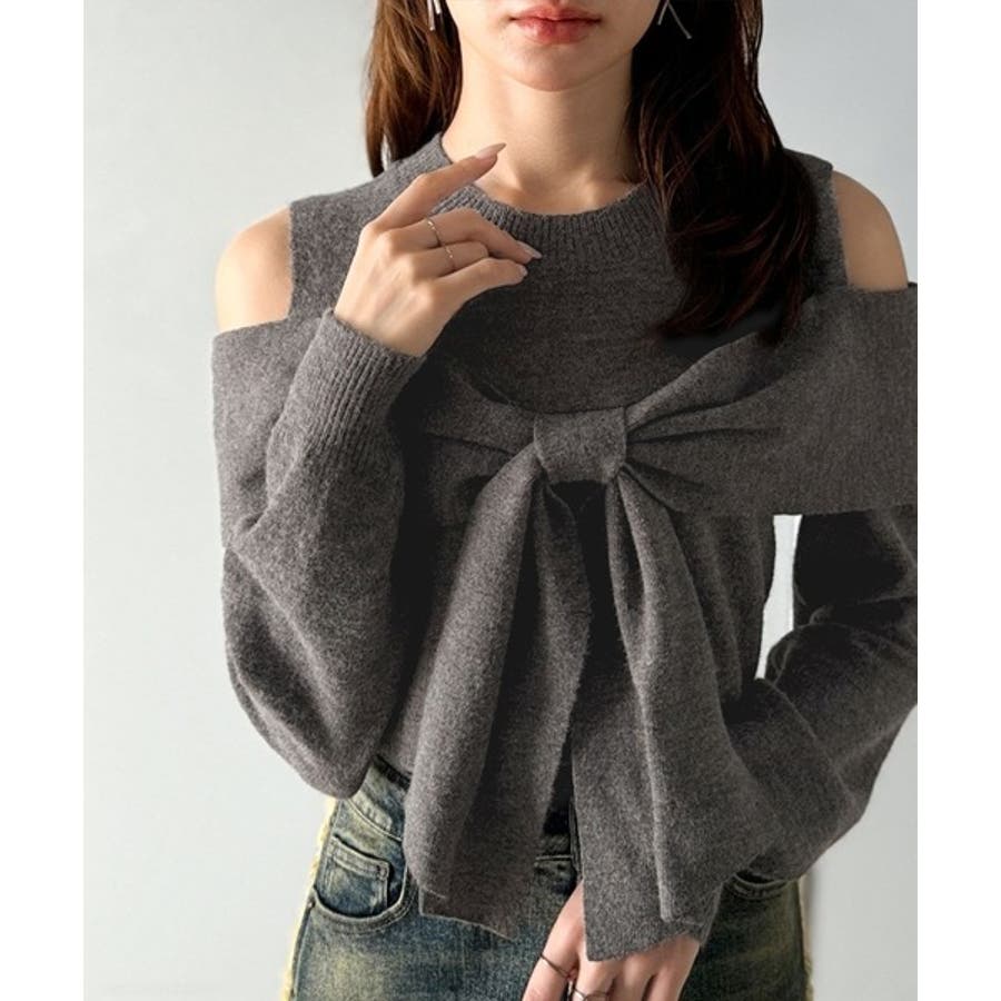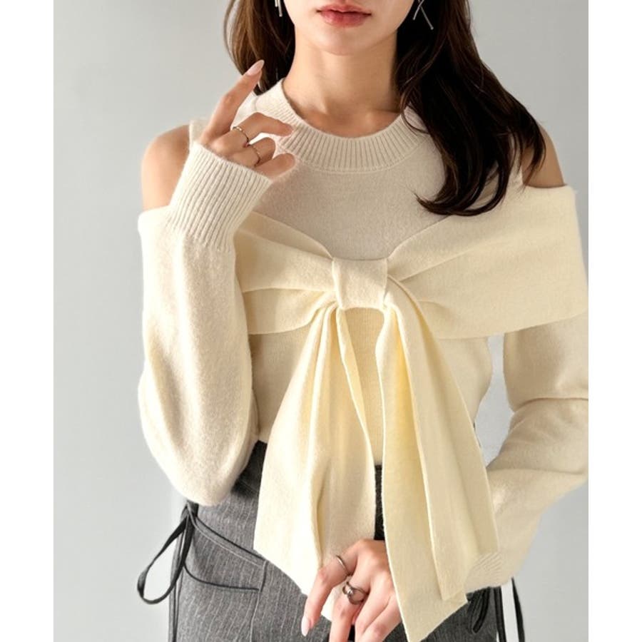 立体的なリボンが胸元を飾るガーリーなニット。