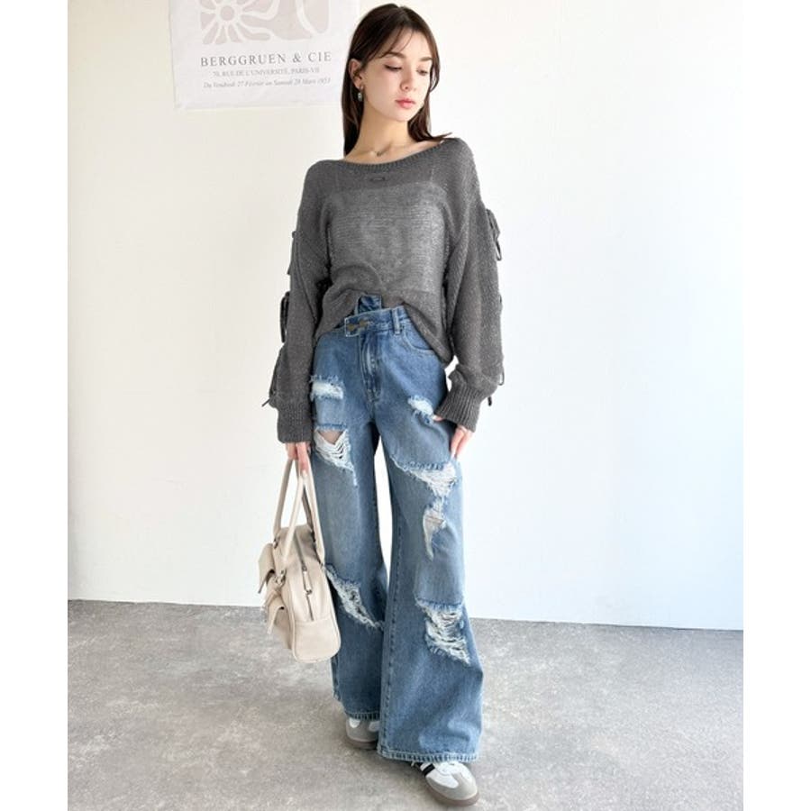 ざっくり編みのニットや、ダメージデニムなどいつものコーディネートに