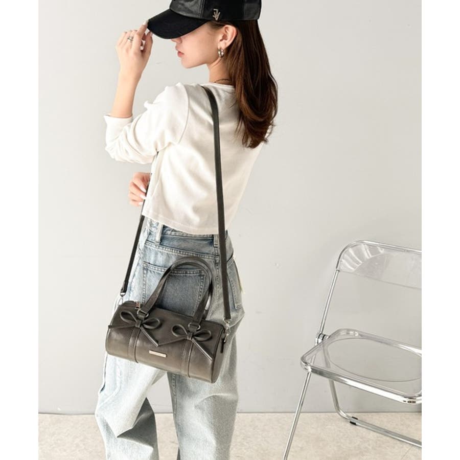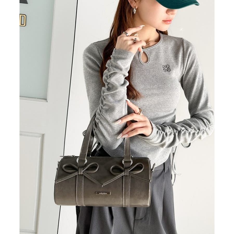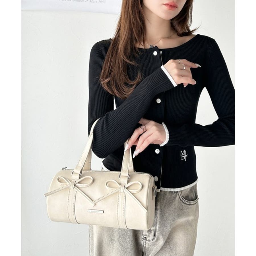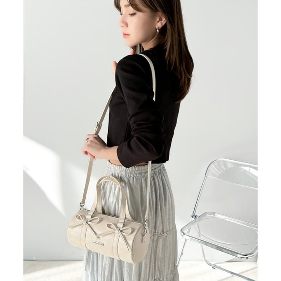 トレンドのリボンモチーフの筒形ショルダーバッグ。
