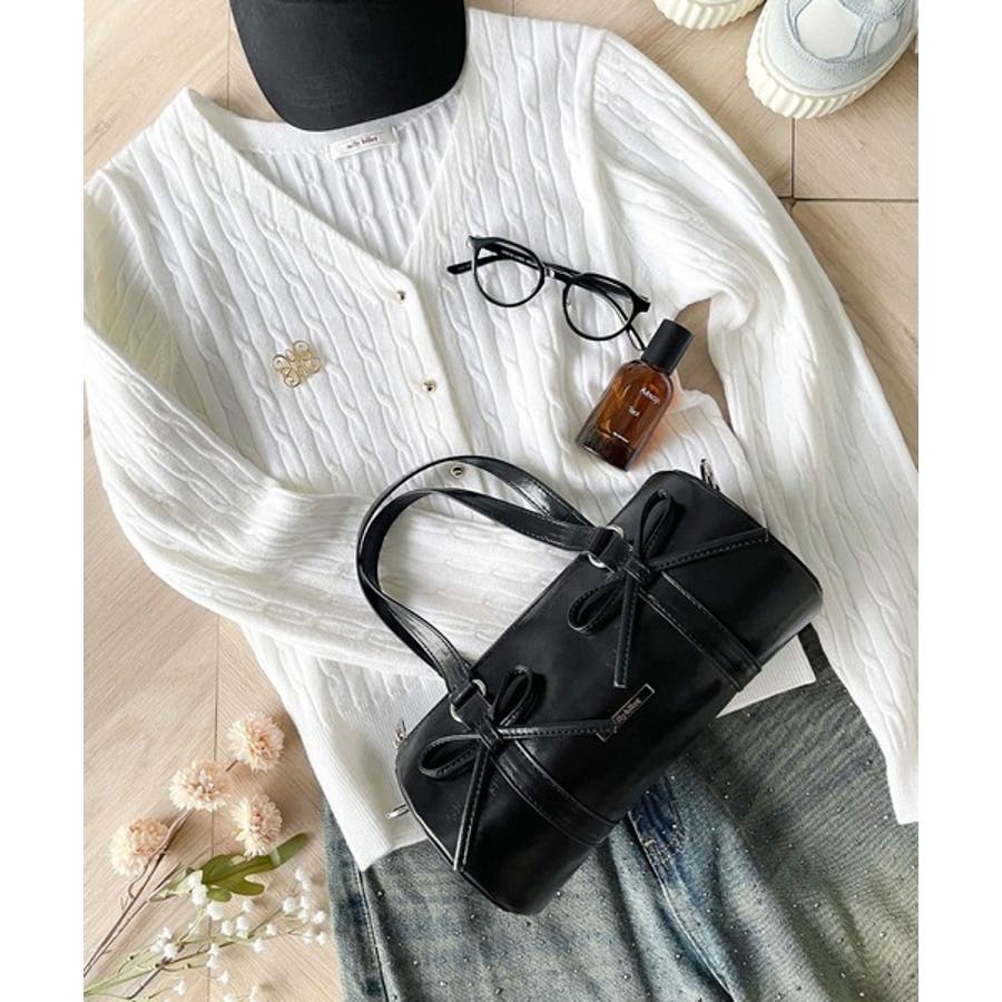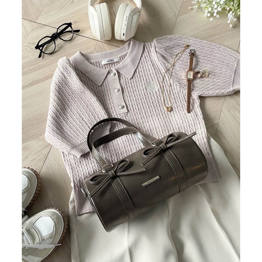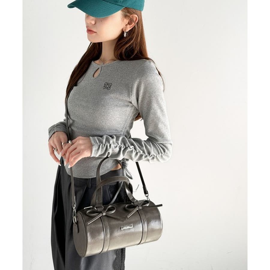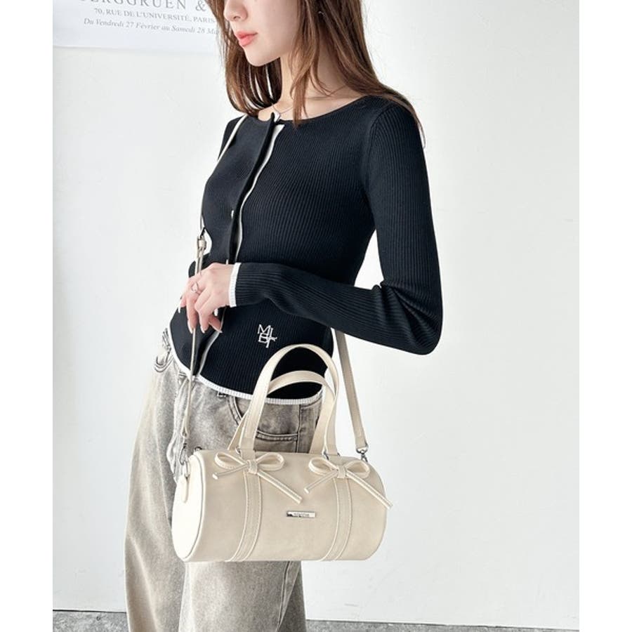 トレンドのリボンモチーフの筒形ショルダーバッグ。
