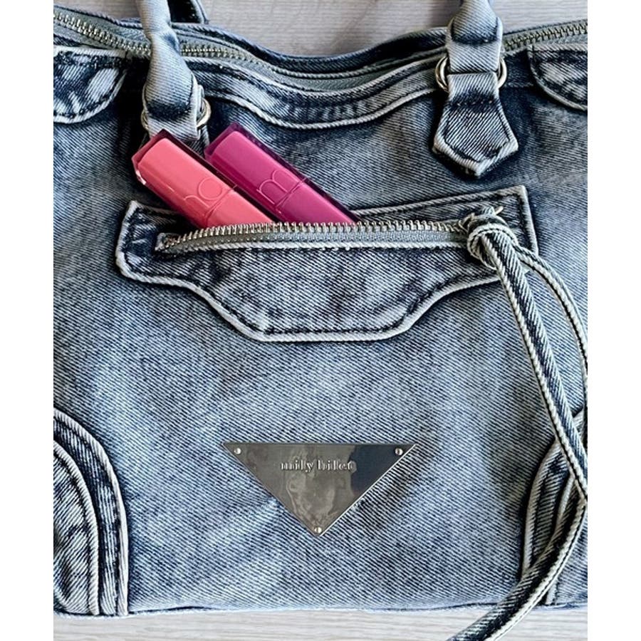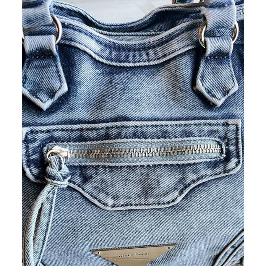 オリジナルメタルプレートが輝くデニムバッグ。