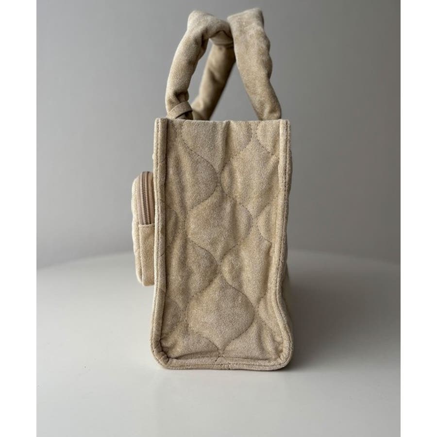 スウェードライク生地のスクエアバッグで、ふわふわもちもちの持ち手が気持ちいい。