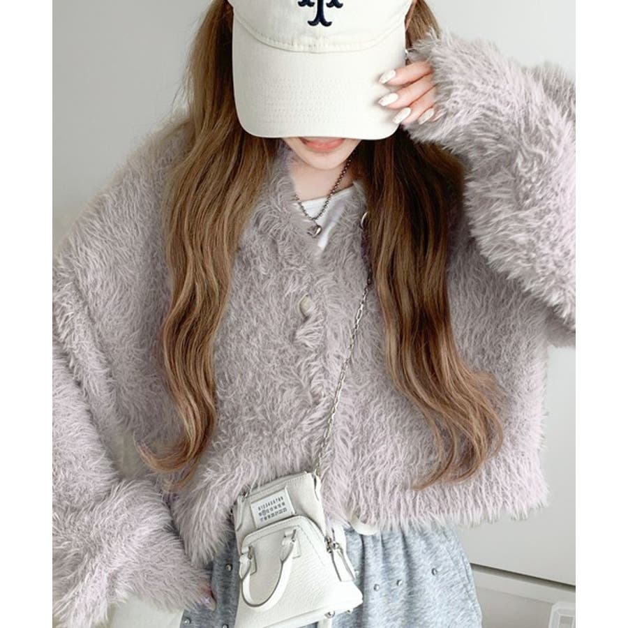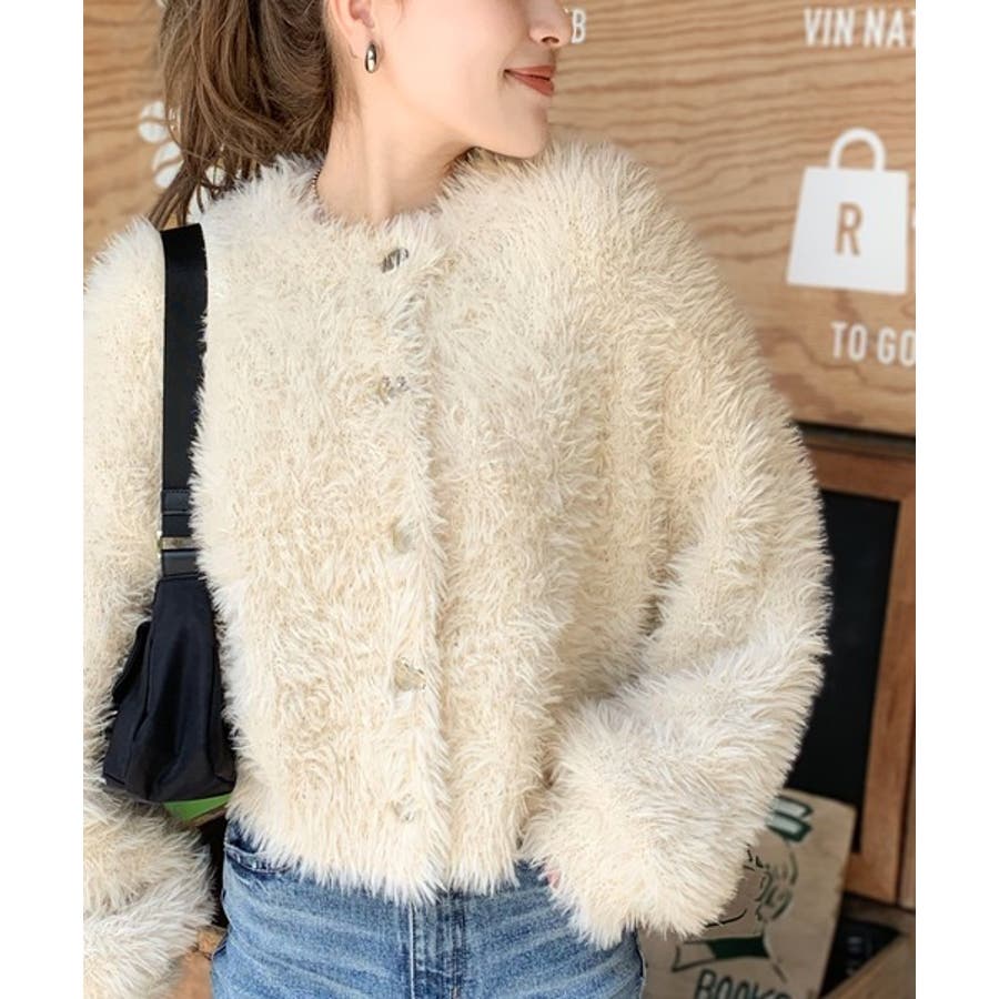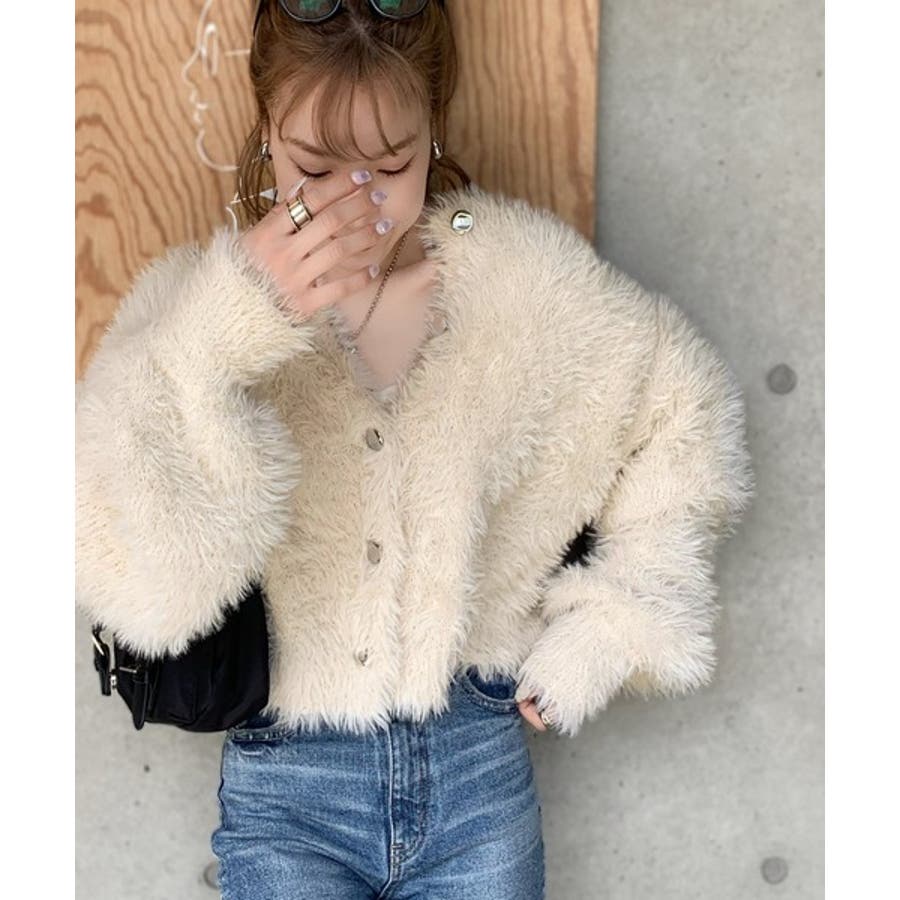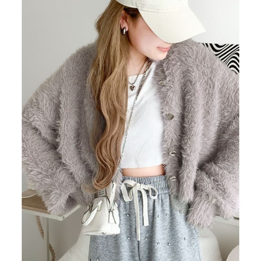 シャギー素材とシルバーボタンが目を惹くカーディガン。
