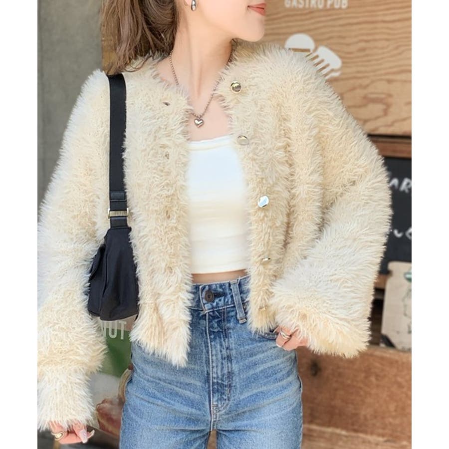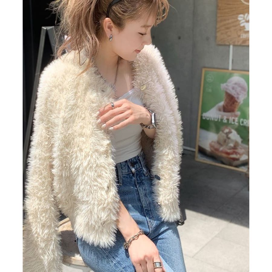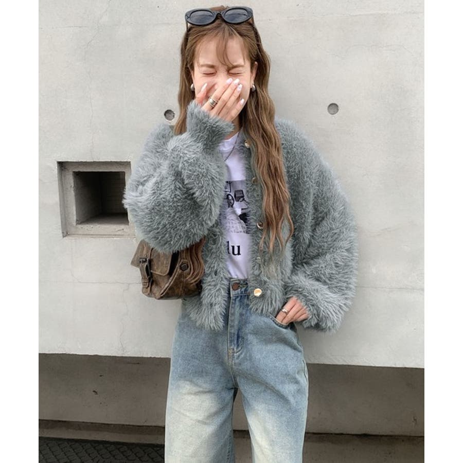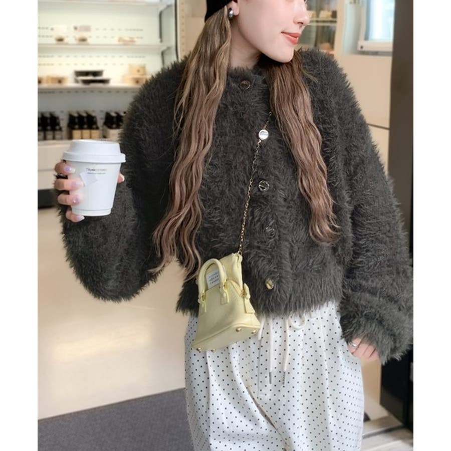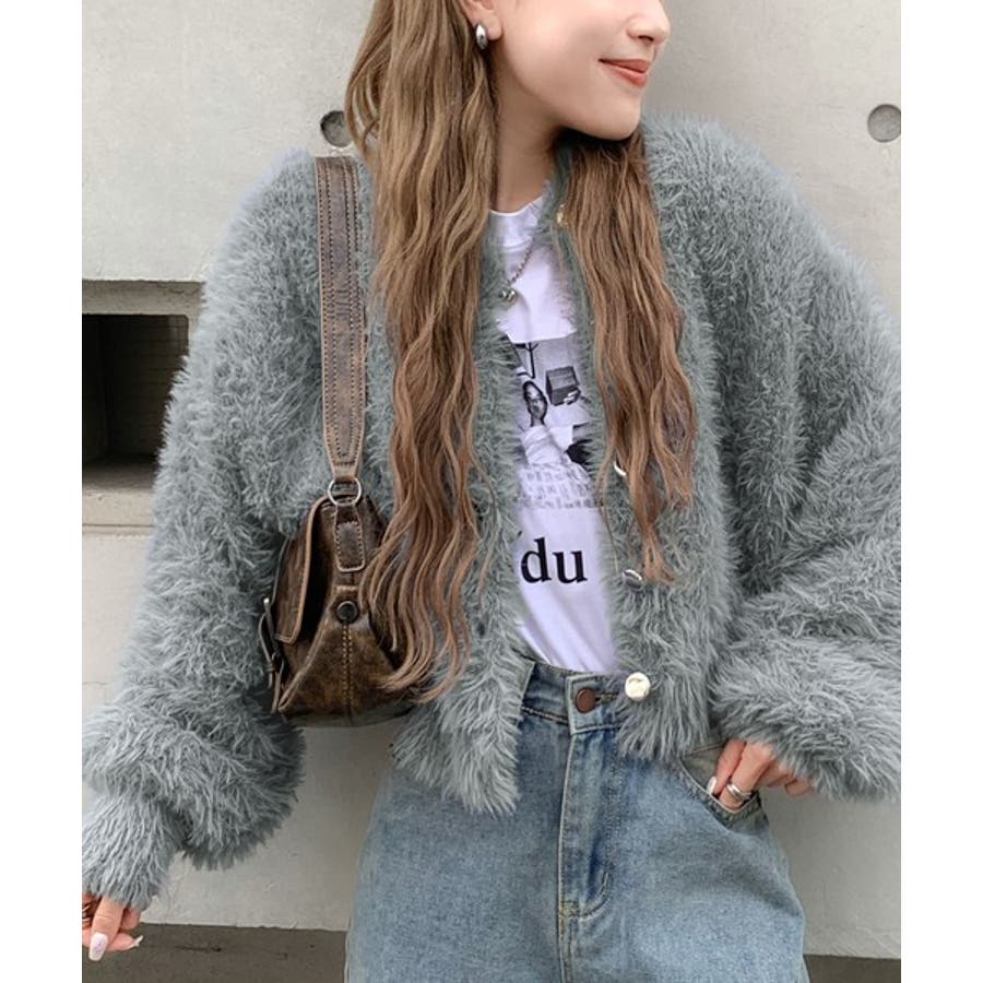 シャギー素材とシルバーボタンが目を惹くカーディガン。