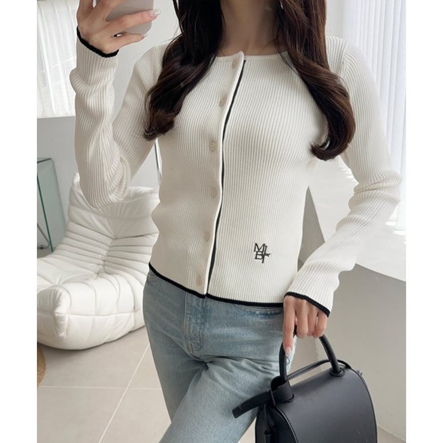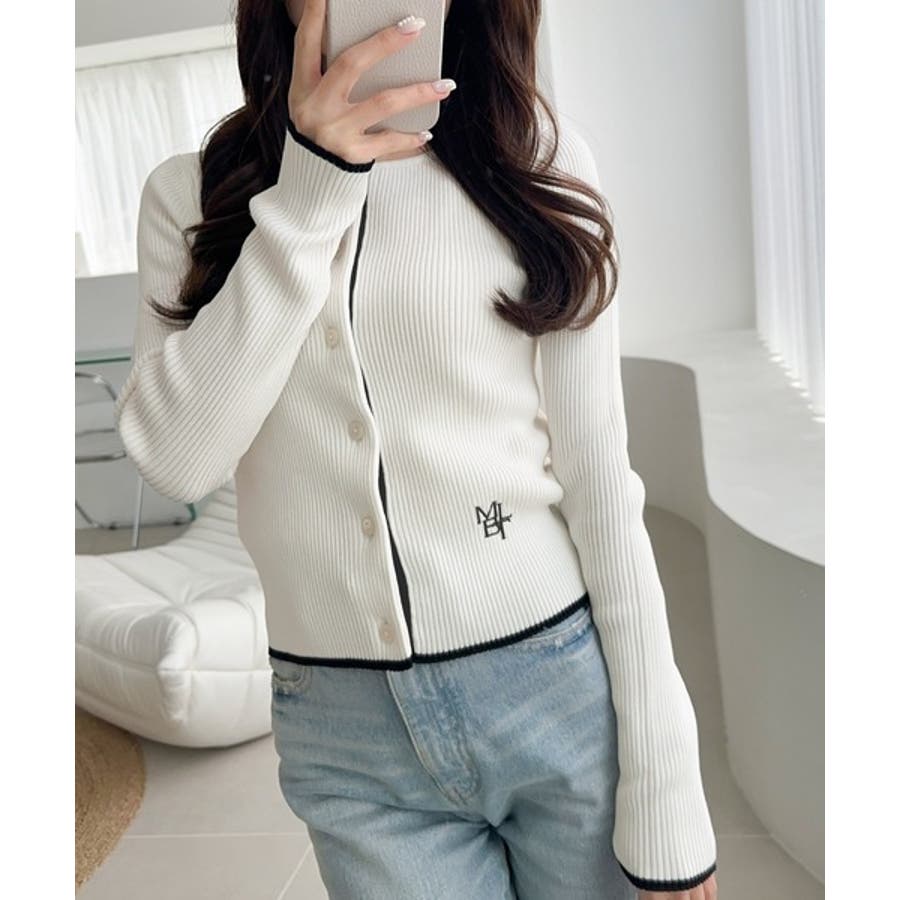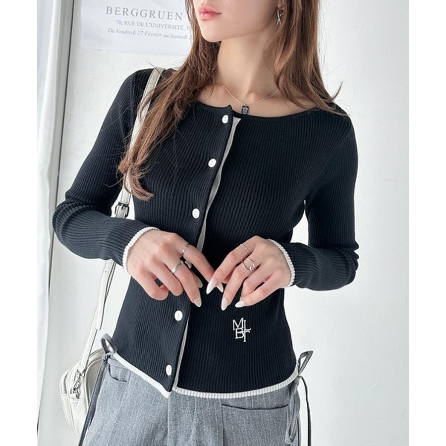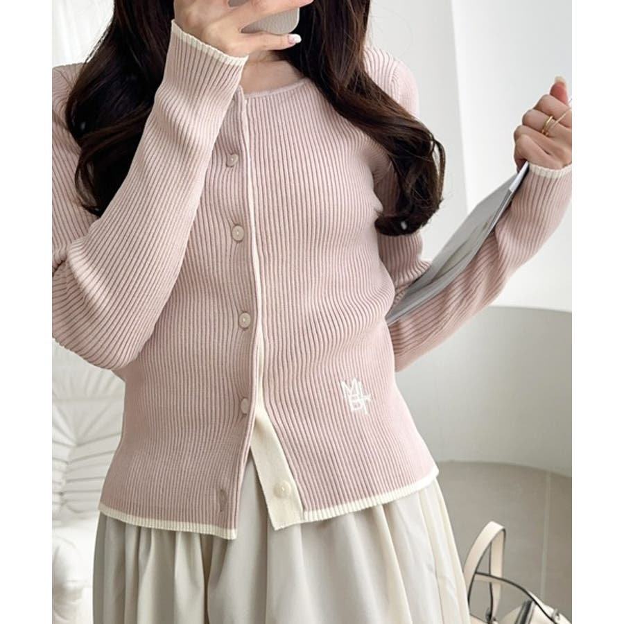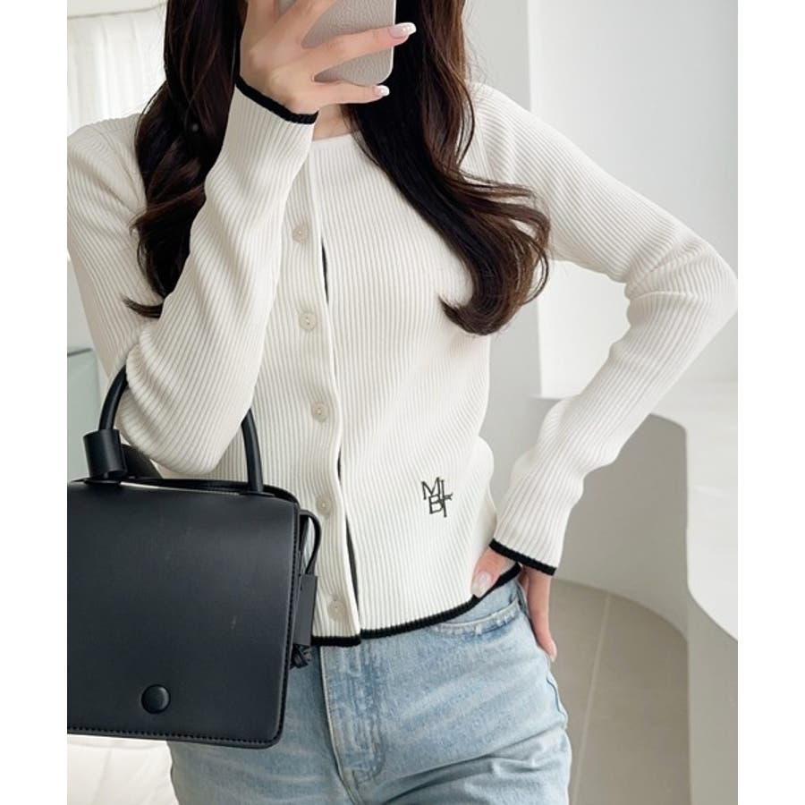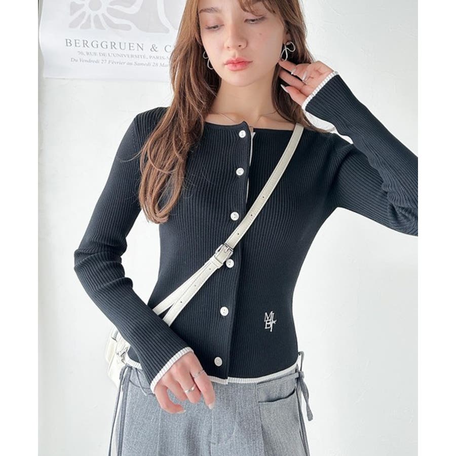 【mily bilet】女性らしさ漂う。裾配色ロゴ刺繍コンパクトニットカーディガ…