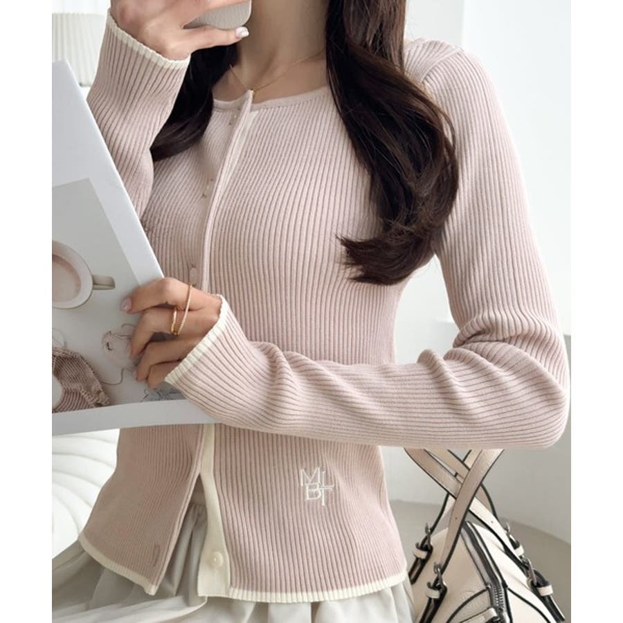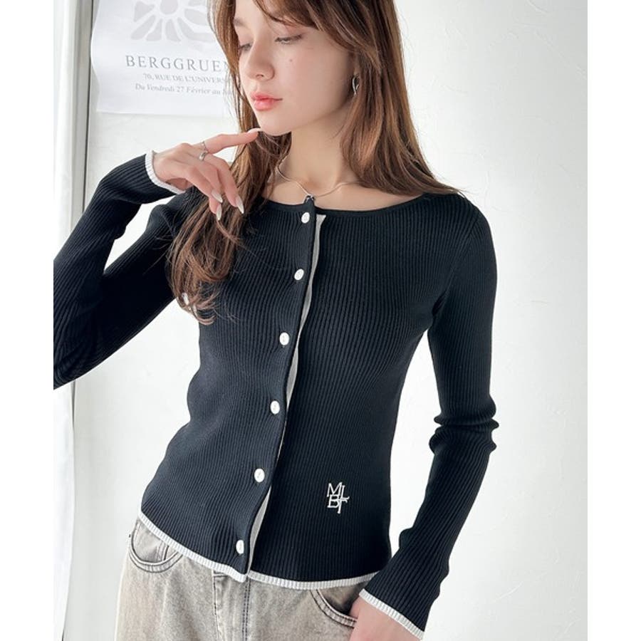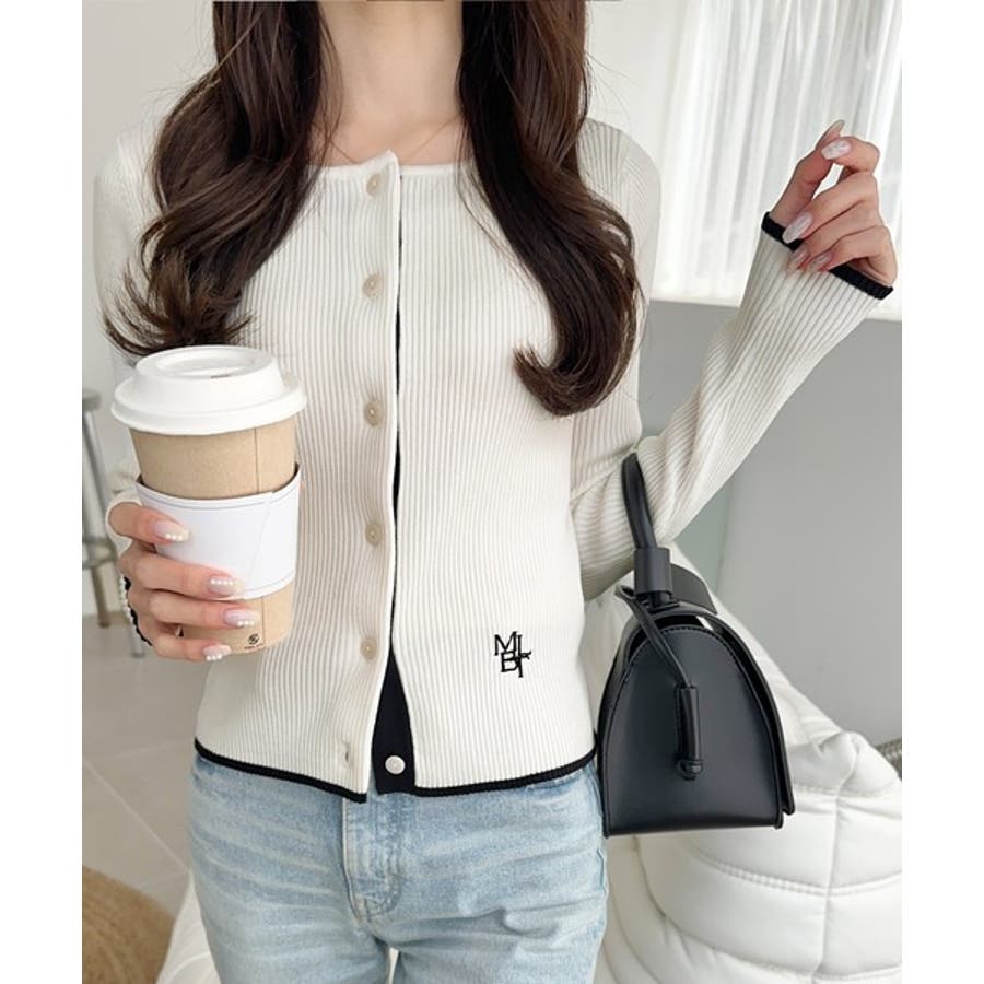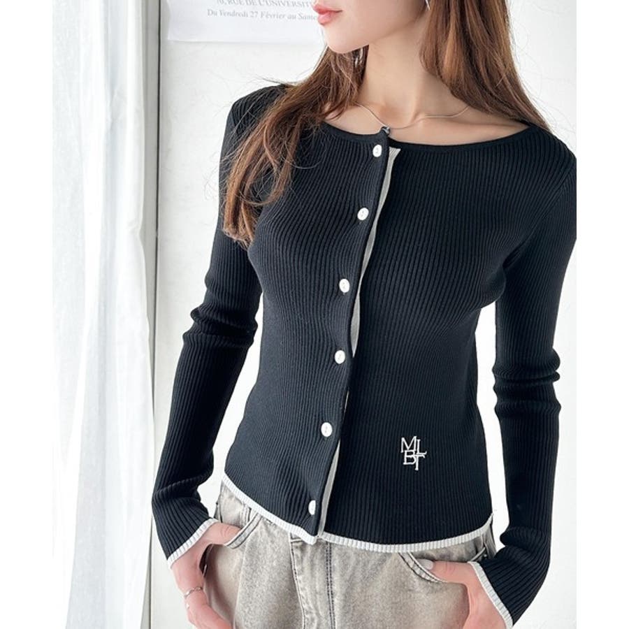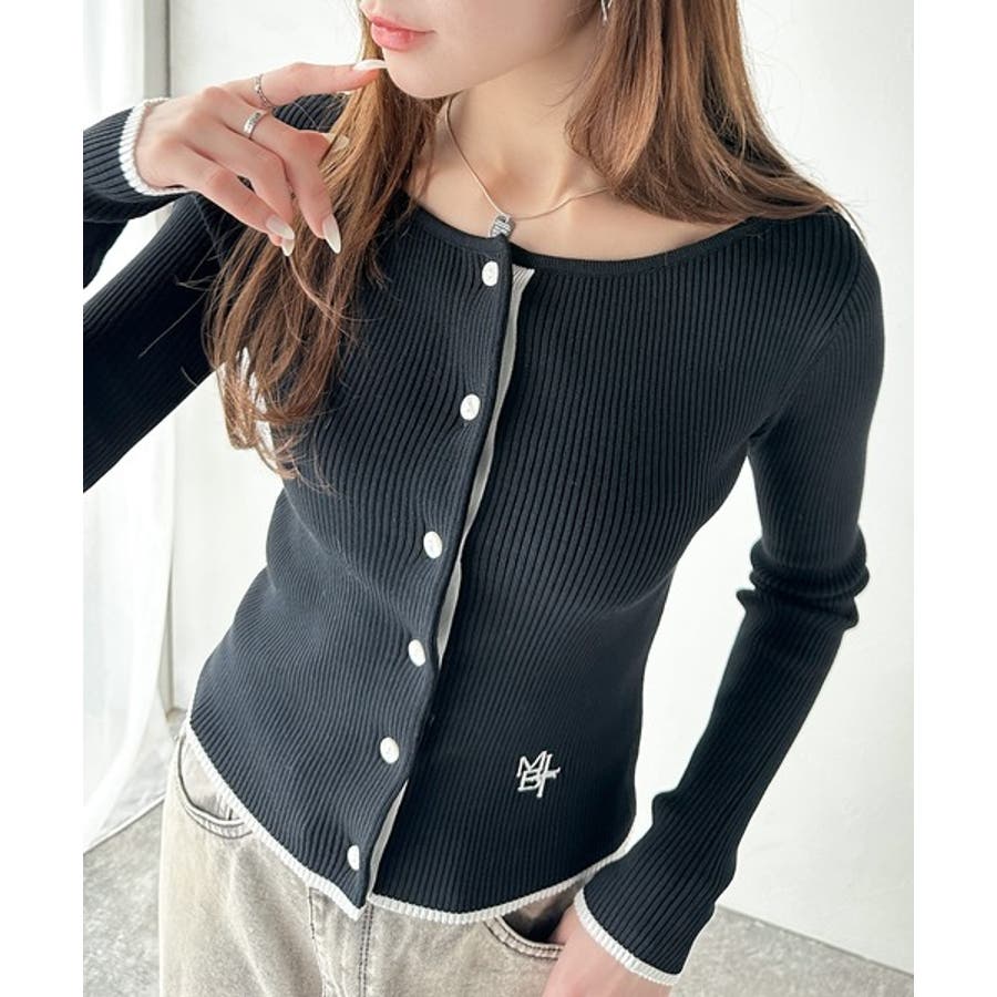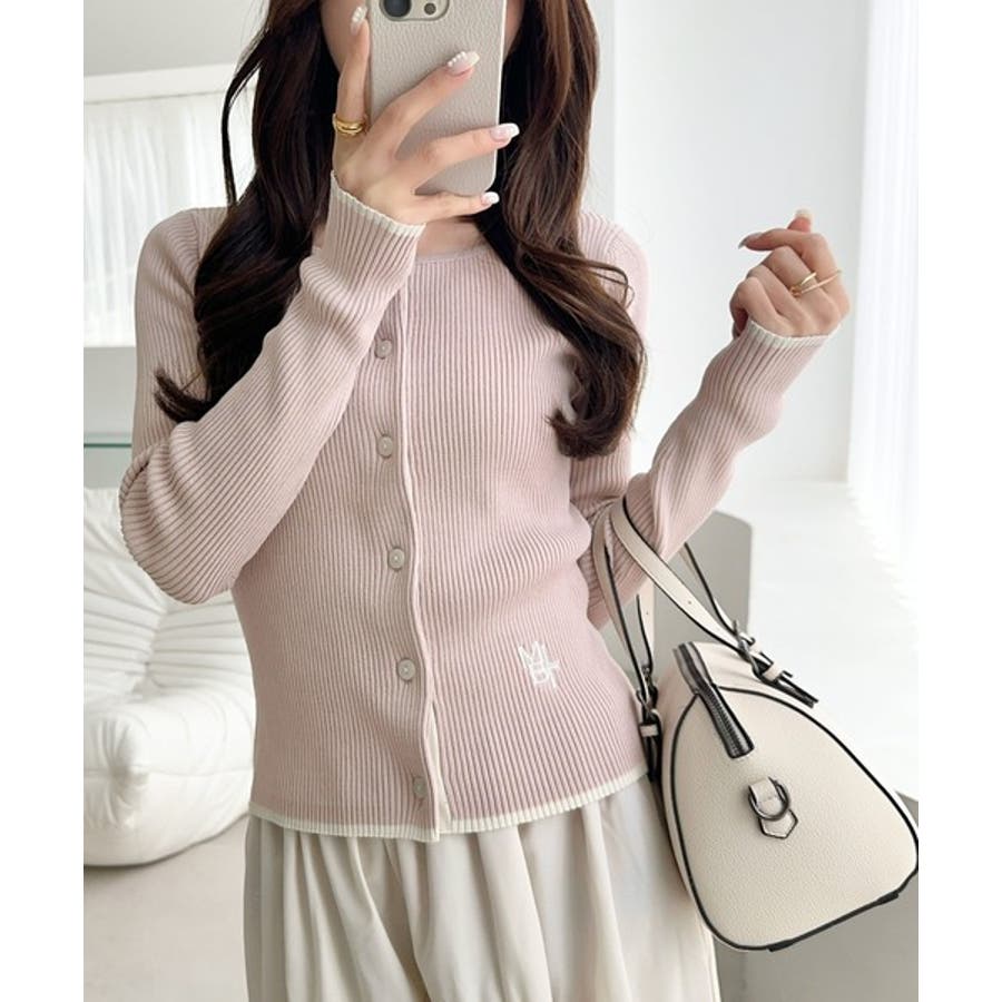 【mily bilet】女性らしさ漂う。裾配色ロゴ刺繍コンパクトニットカーディガ…