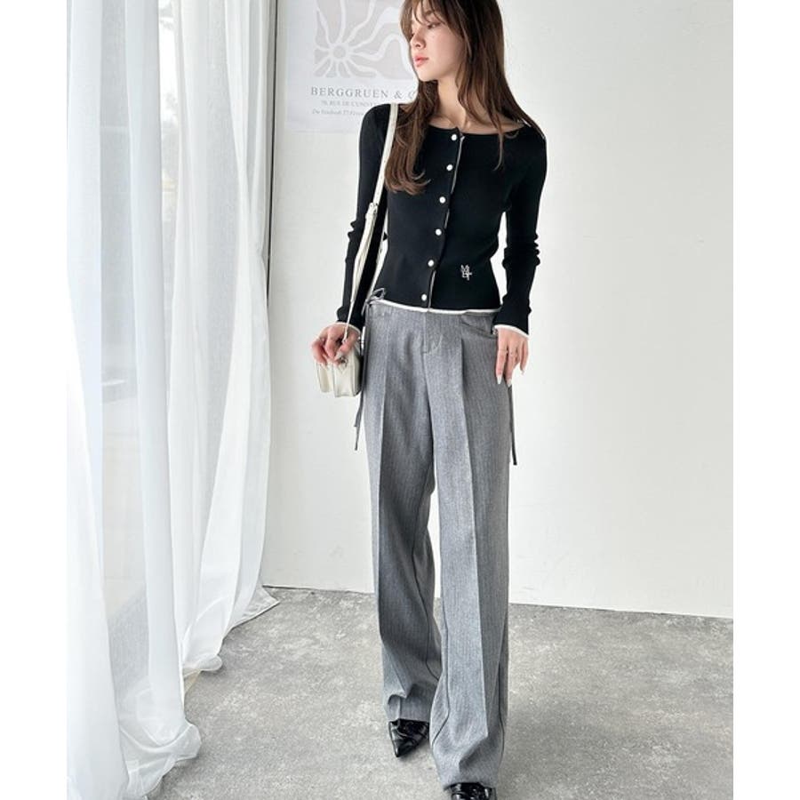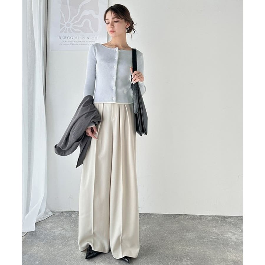裾とボタンの下前立てから見える配色でこなれ感を演出するニットカーディガン。