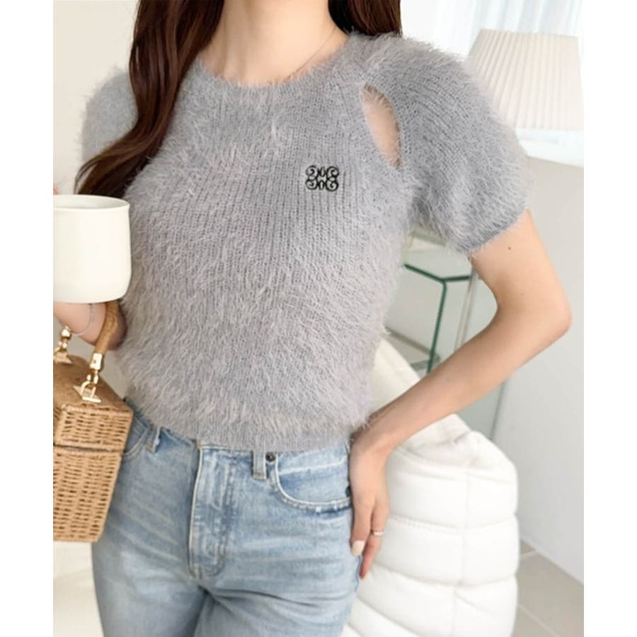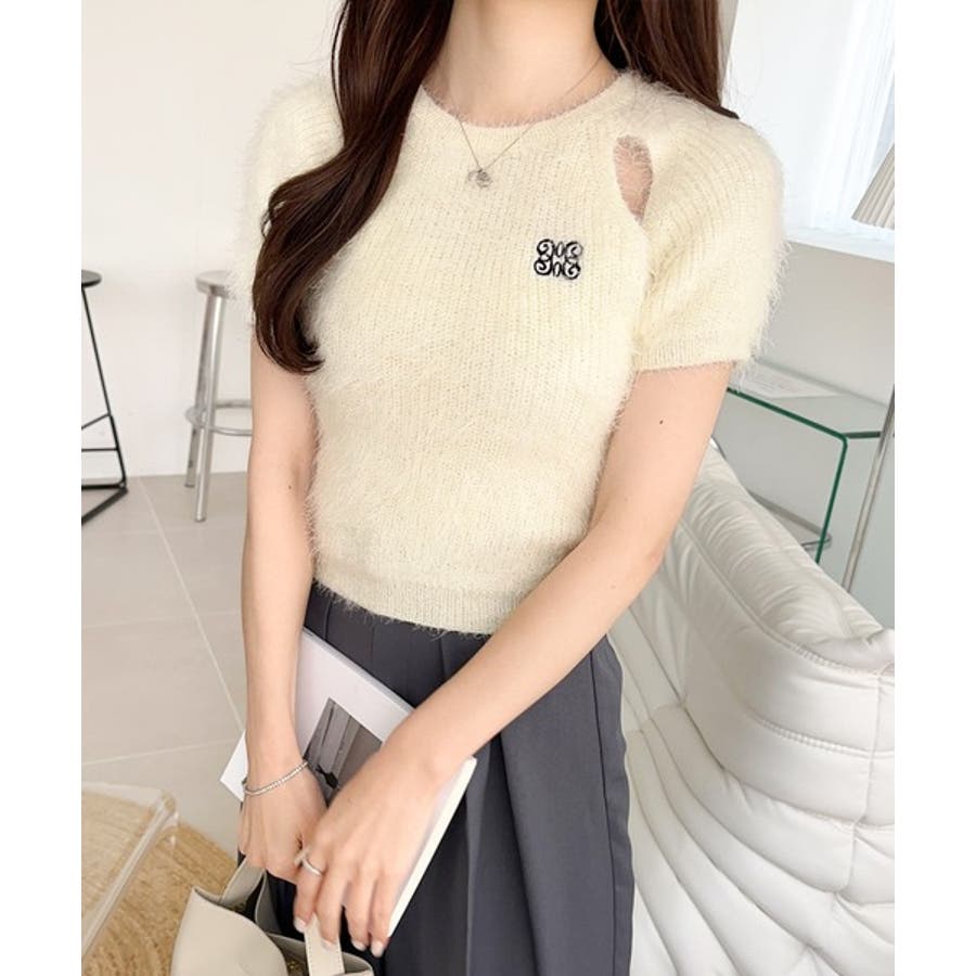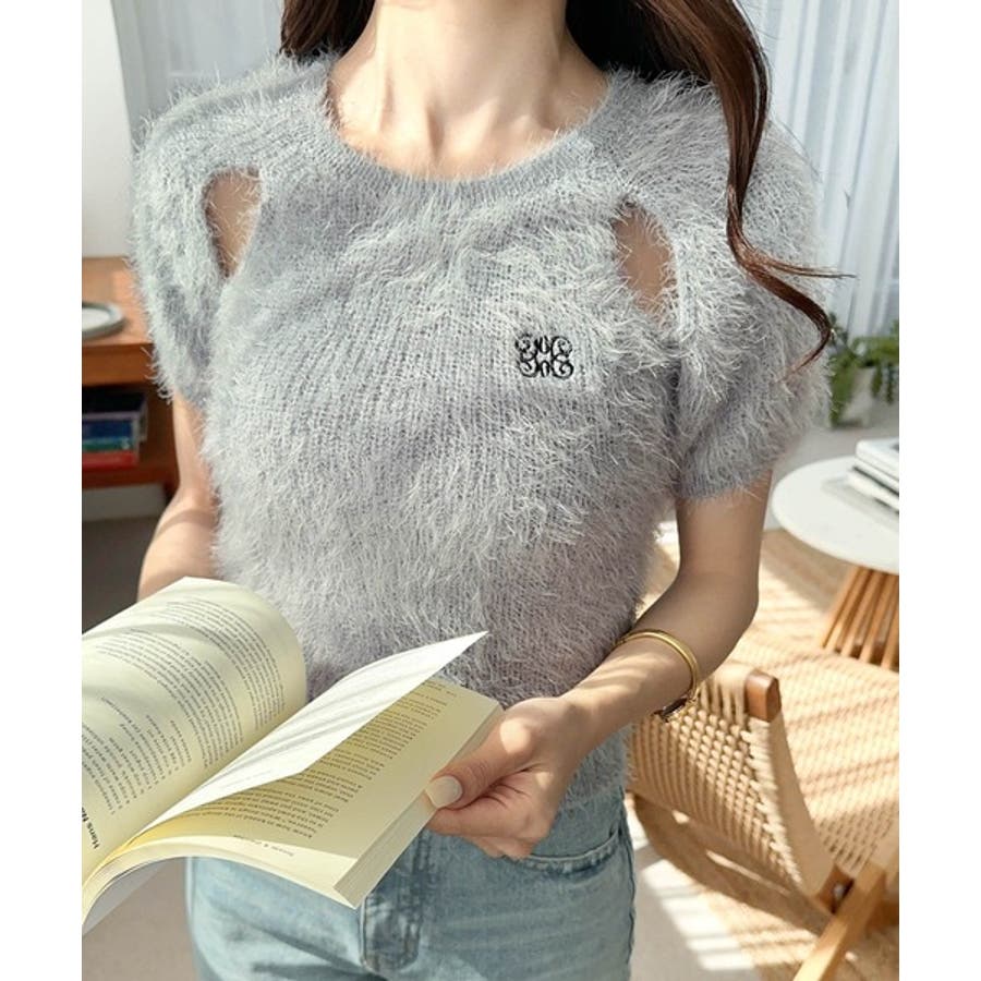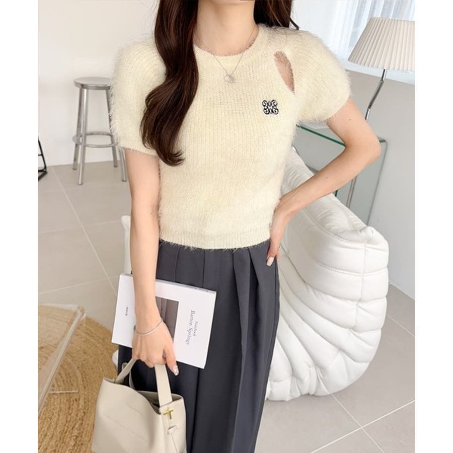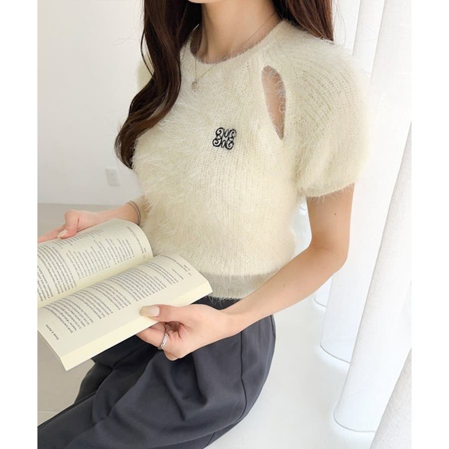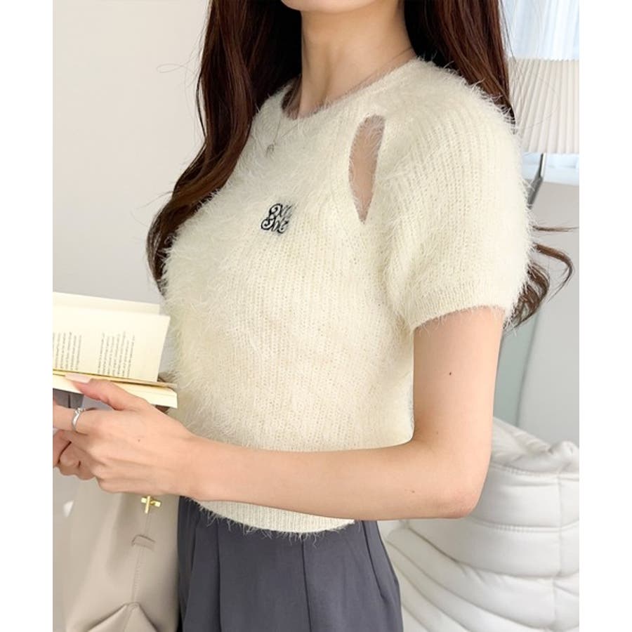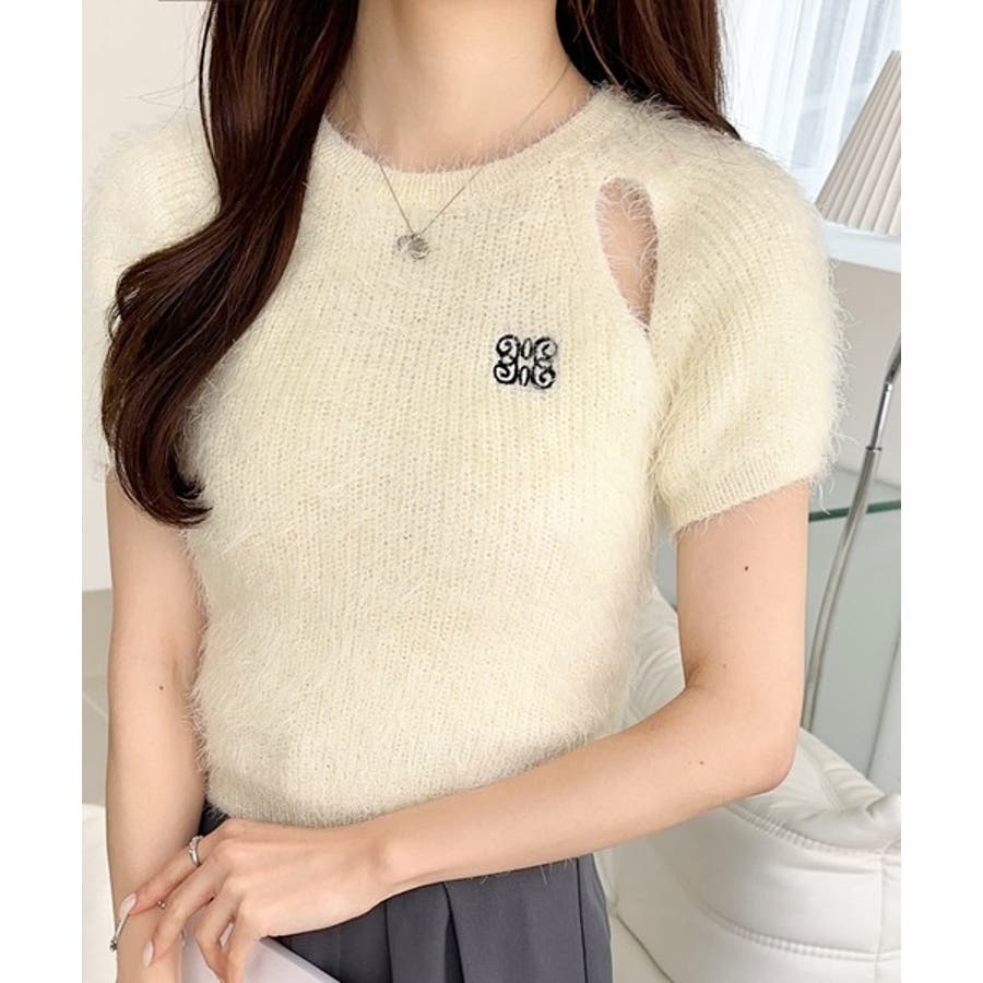 ふんわり大人ガーリーな雰囲気を。胸刺繍肩スリット半袖シャギーニットプルオーバー