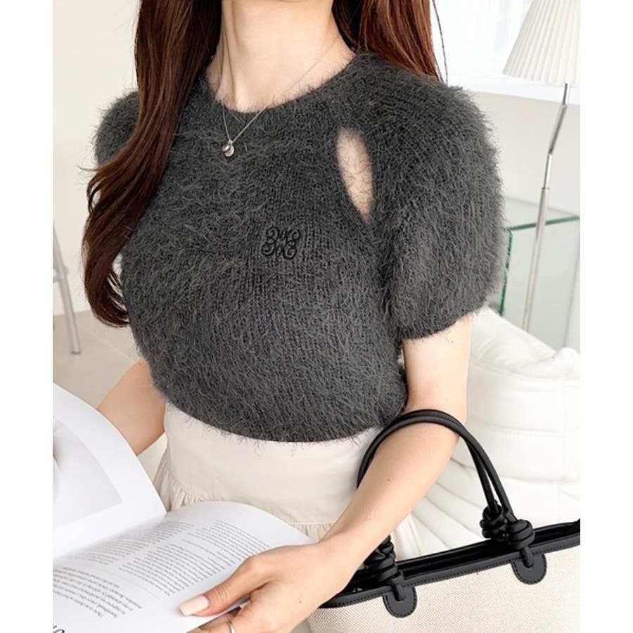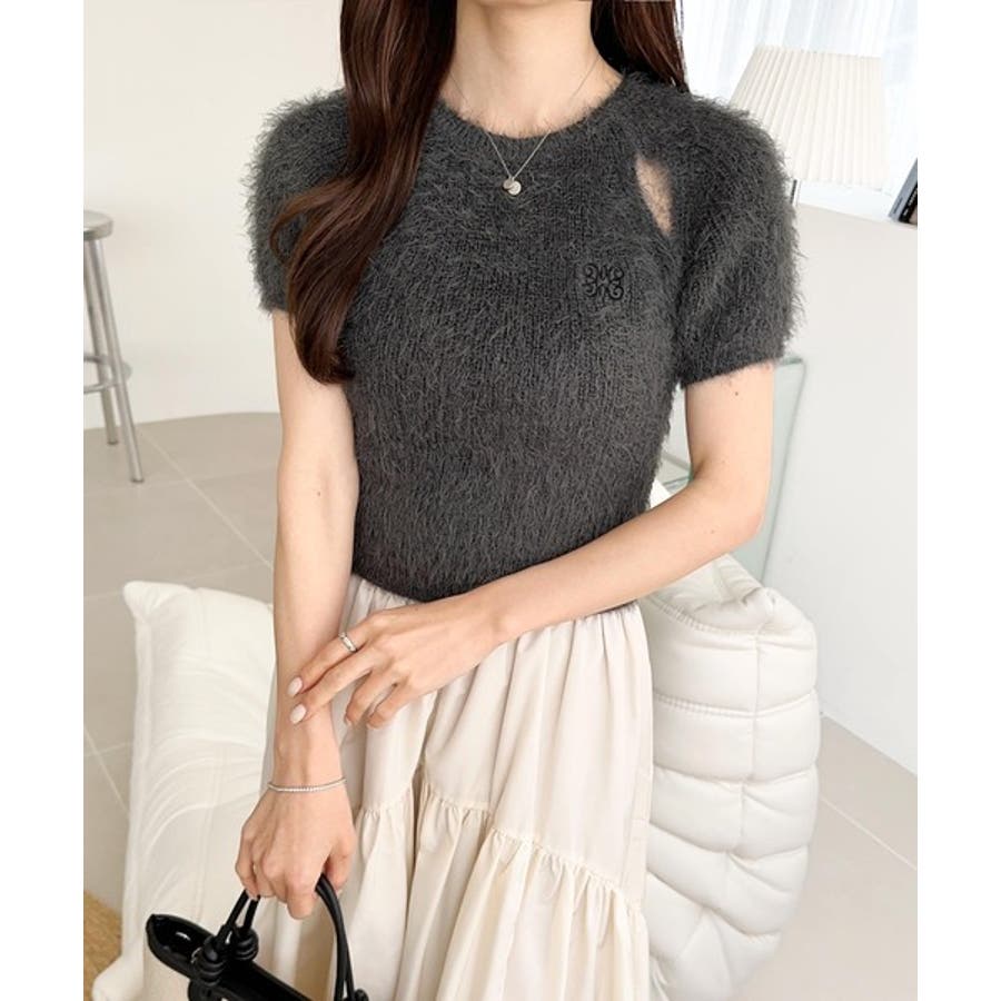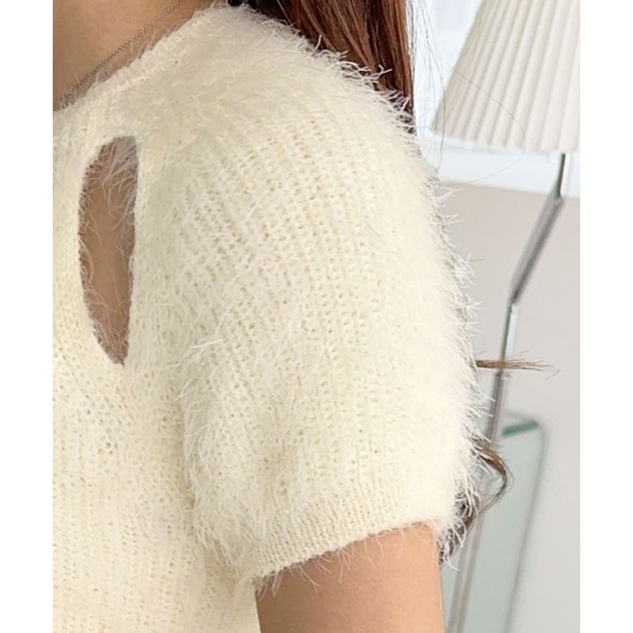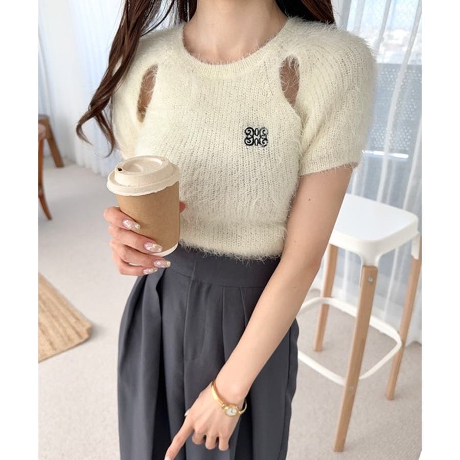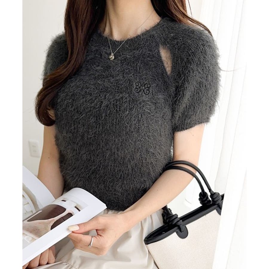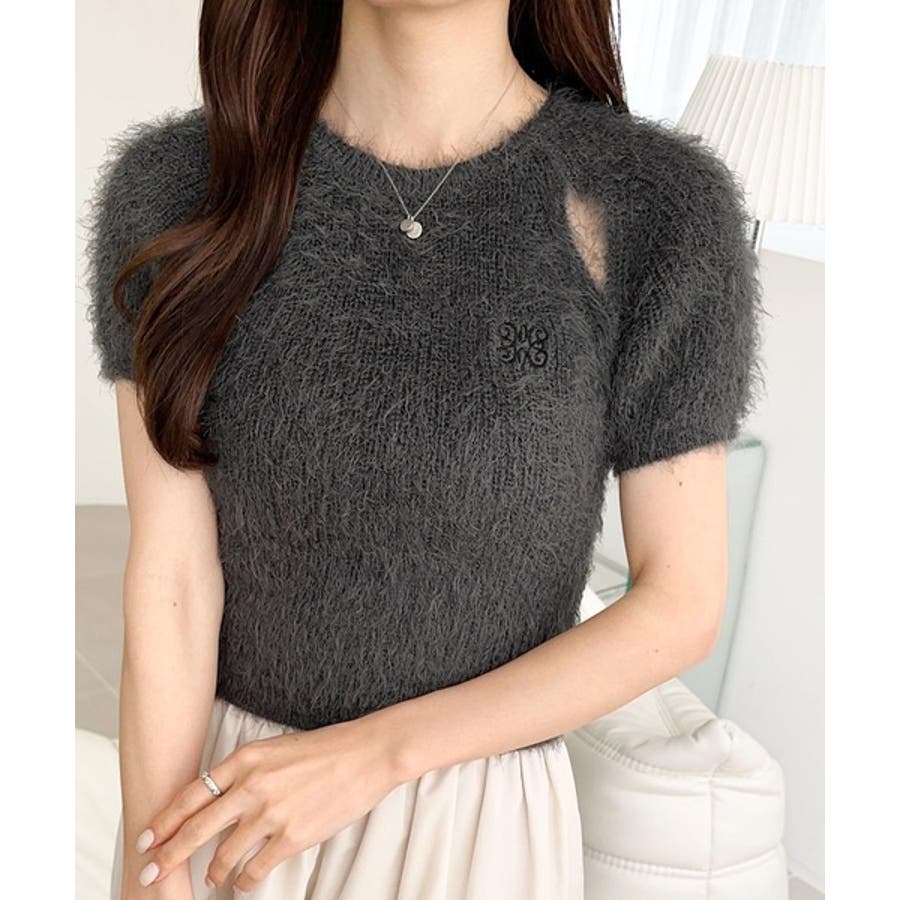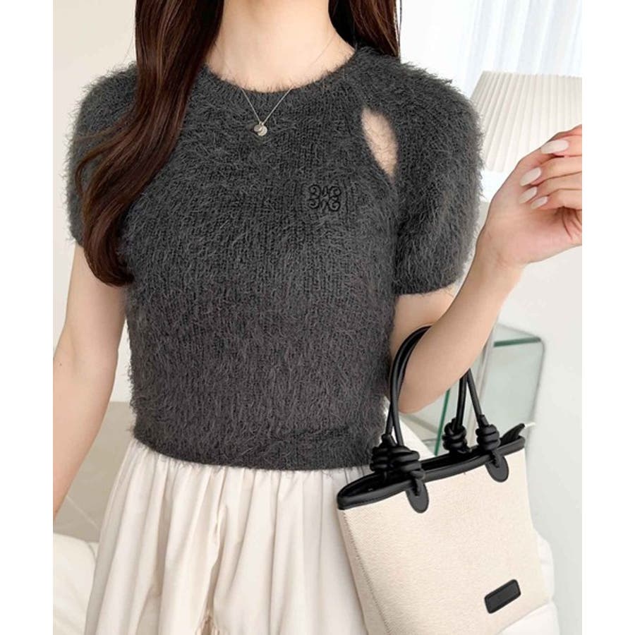 ふんわり大人ガーリーな雰囲気を。胸刺繍肩スリット半袖シャギーニットプルオーバー