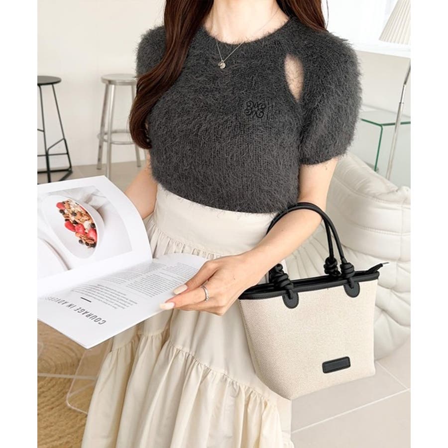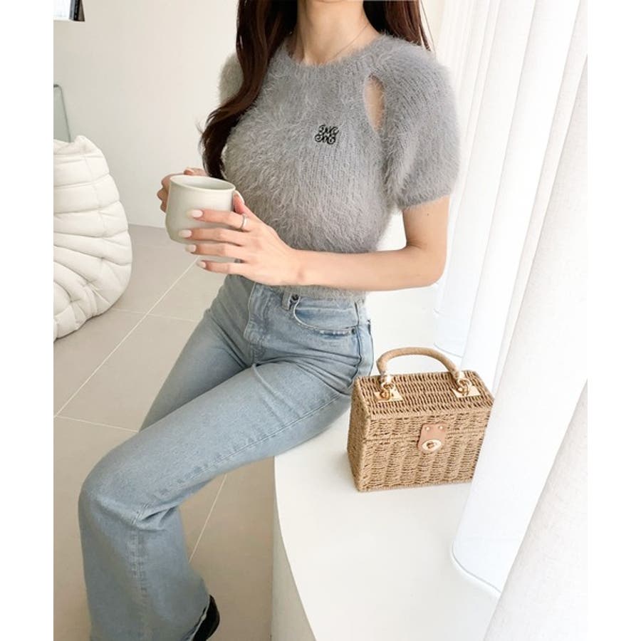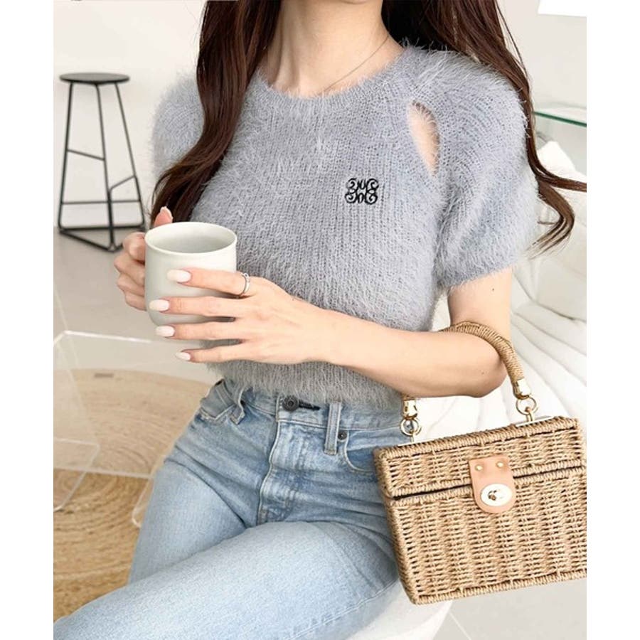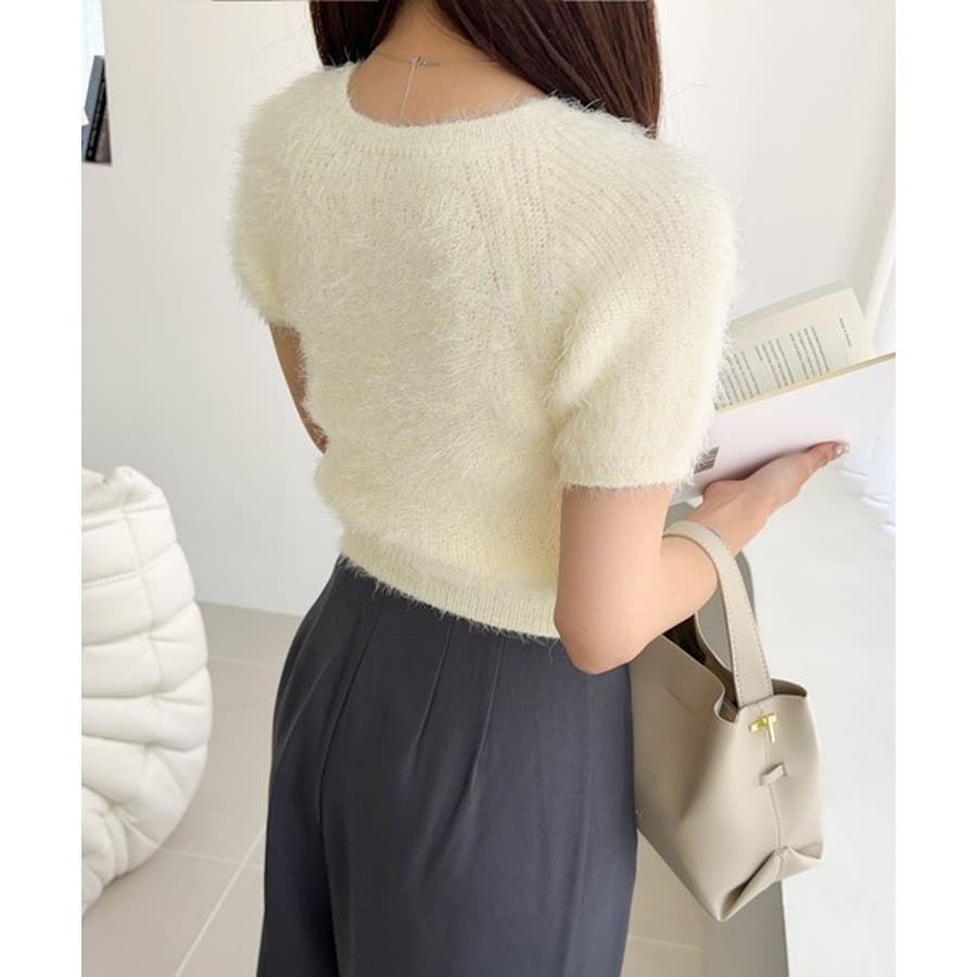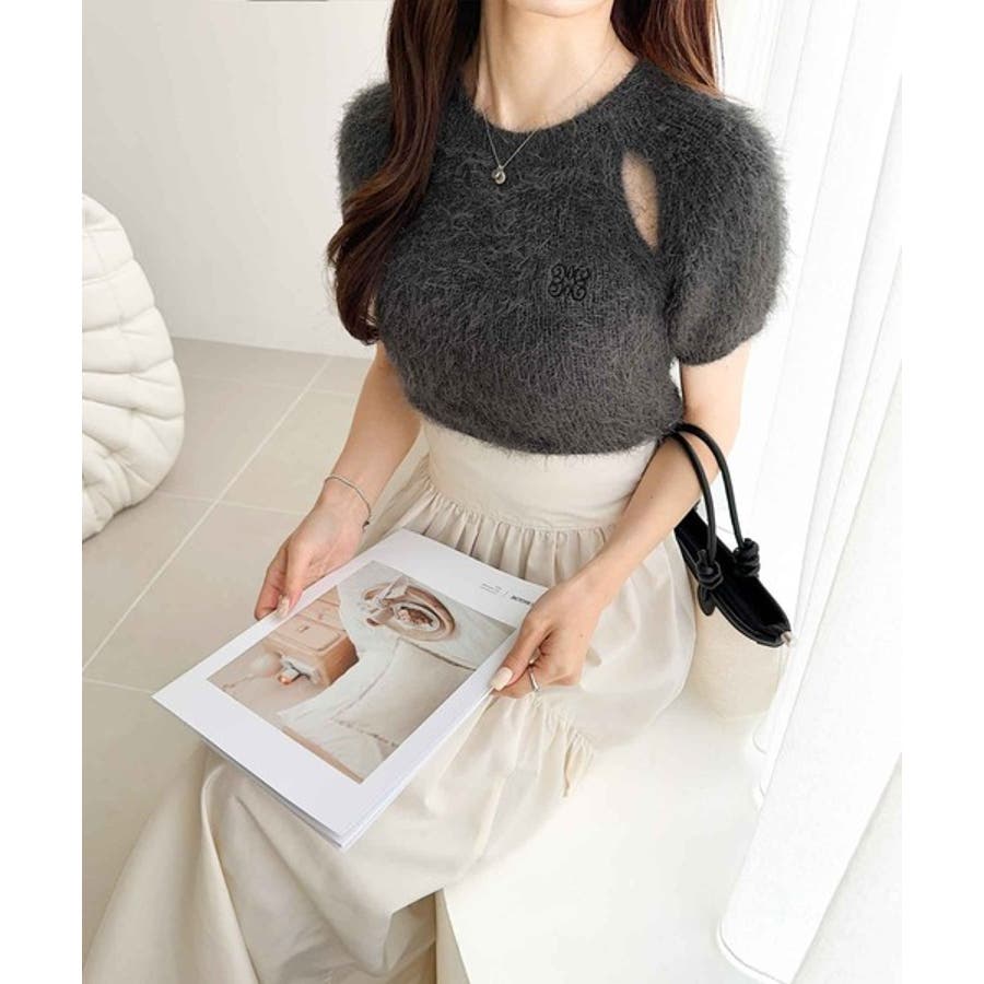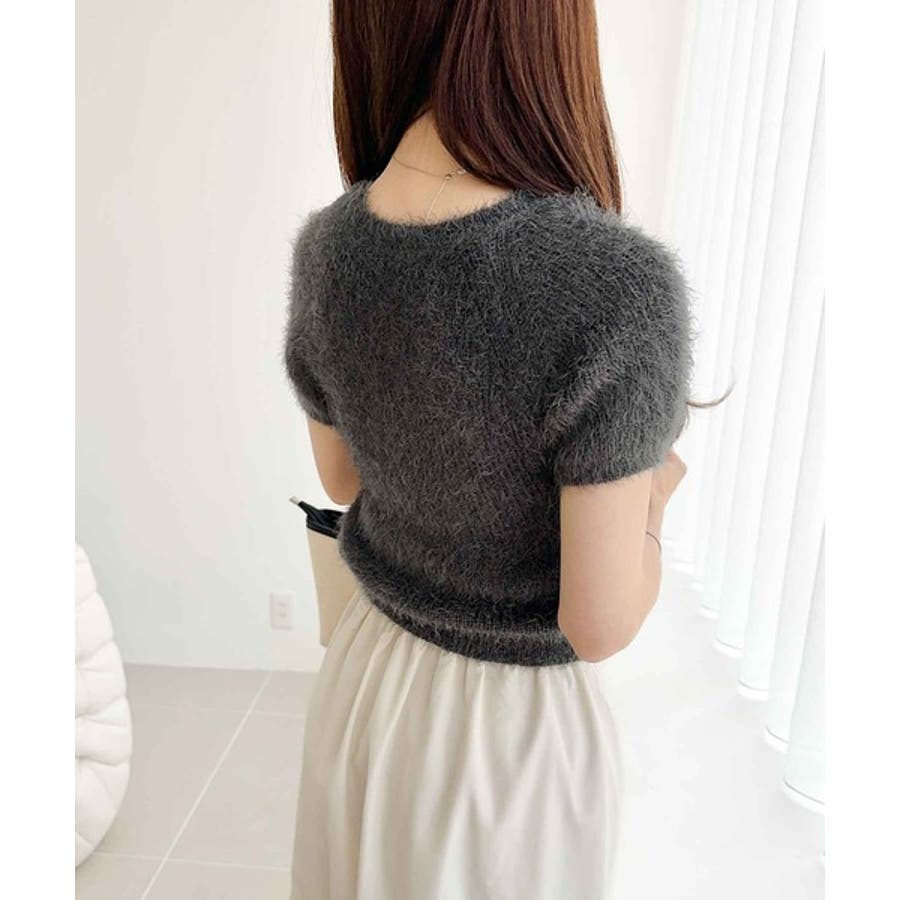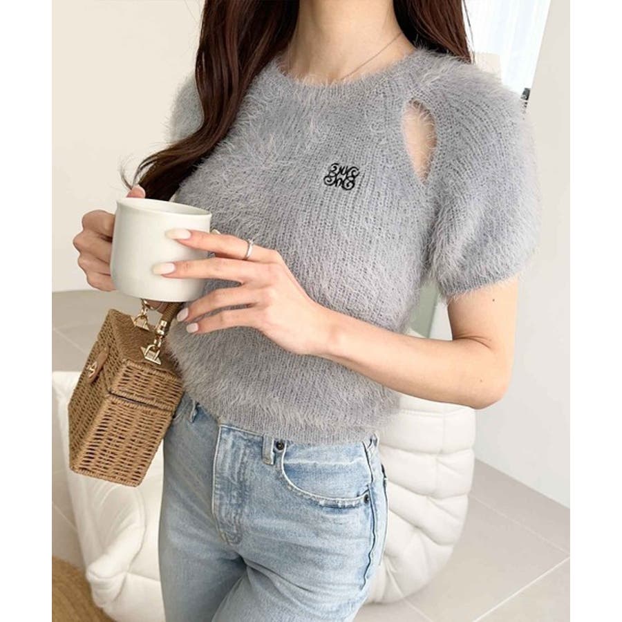 ふんわり大人ガーリーな雰囲気を。胸刺繍肩スリット半袖シャギーニットプルオーバー