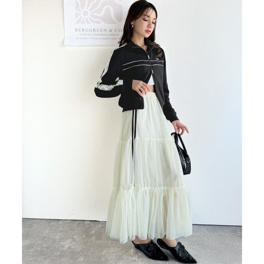 リラックスしたスタイルには、フレアシルエットのホワイトチュールスカートを合わせると