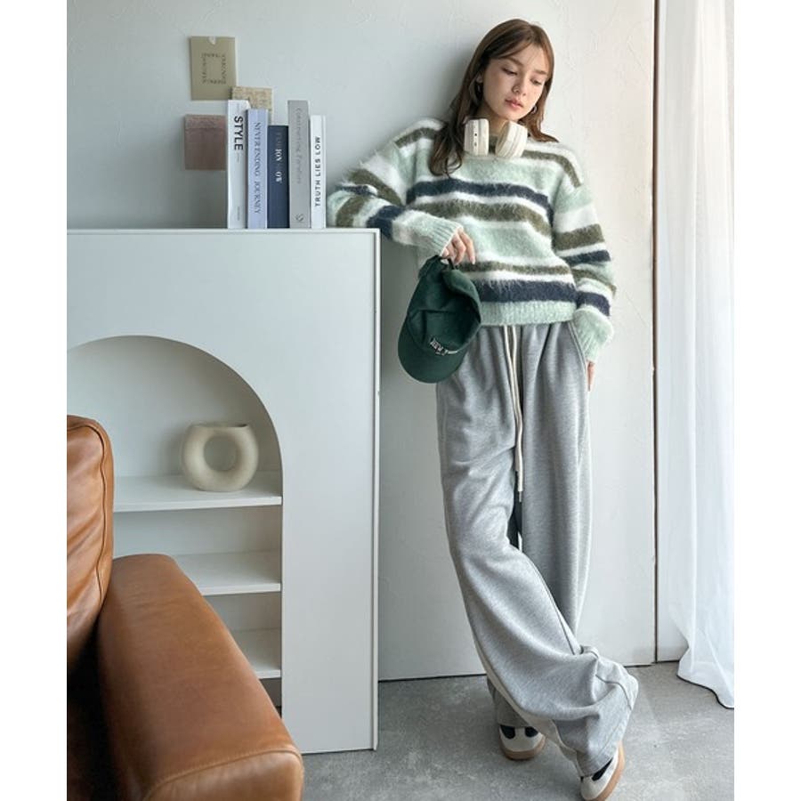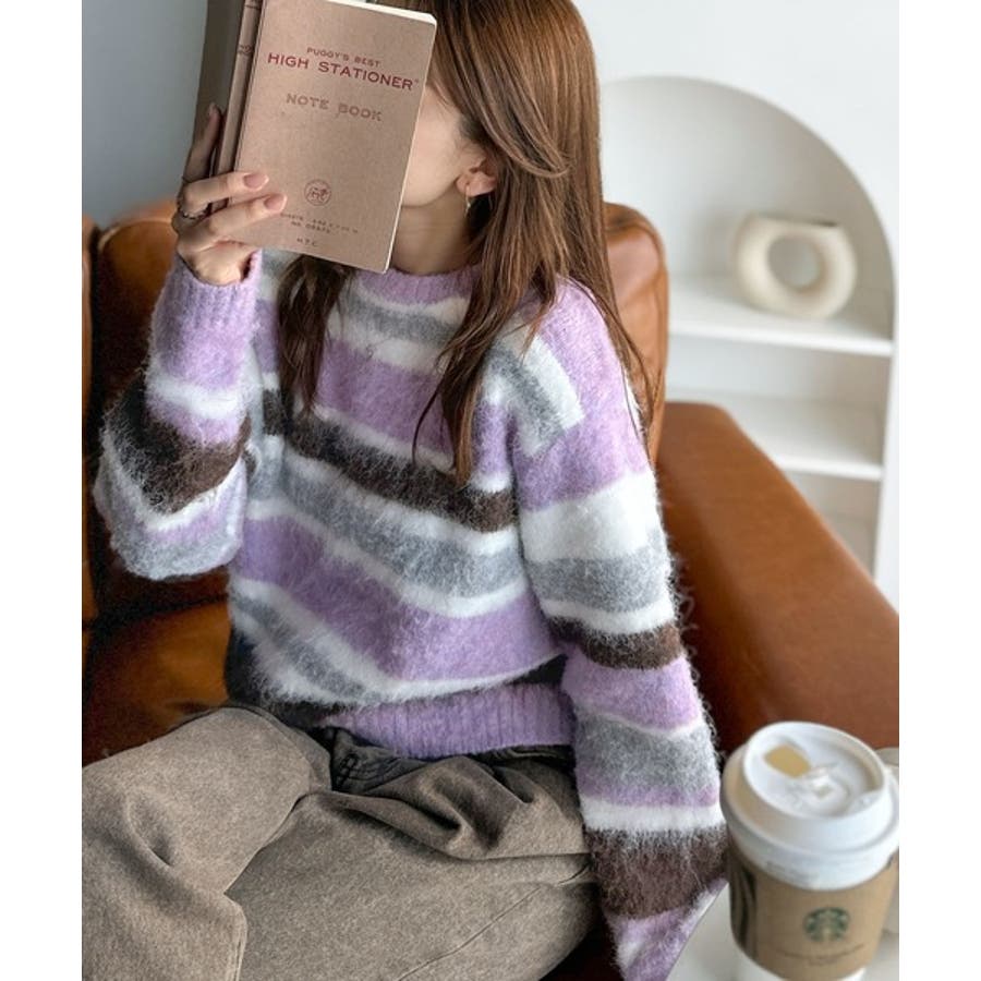 多色使いのマルチボーダーを施した起毛ニットプルオーバー。