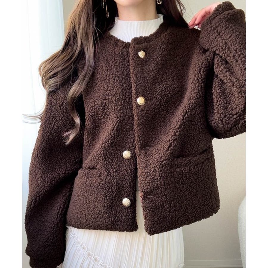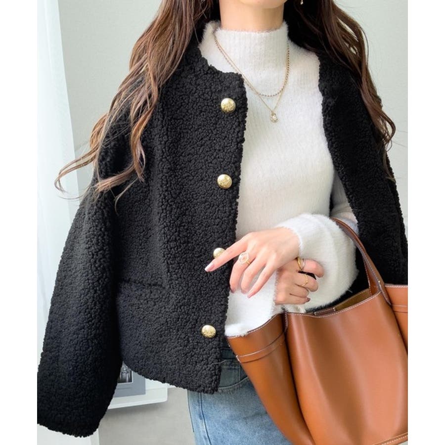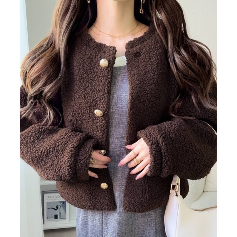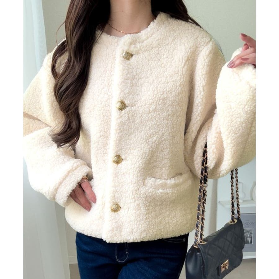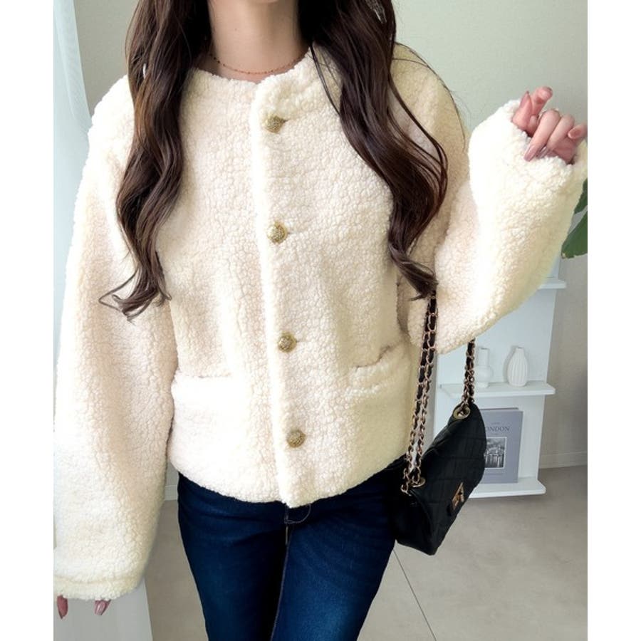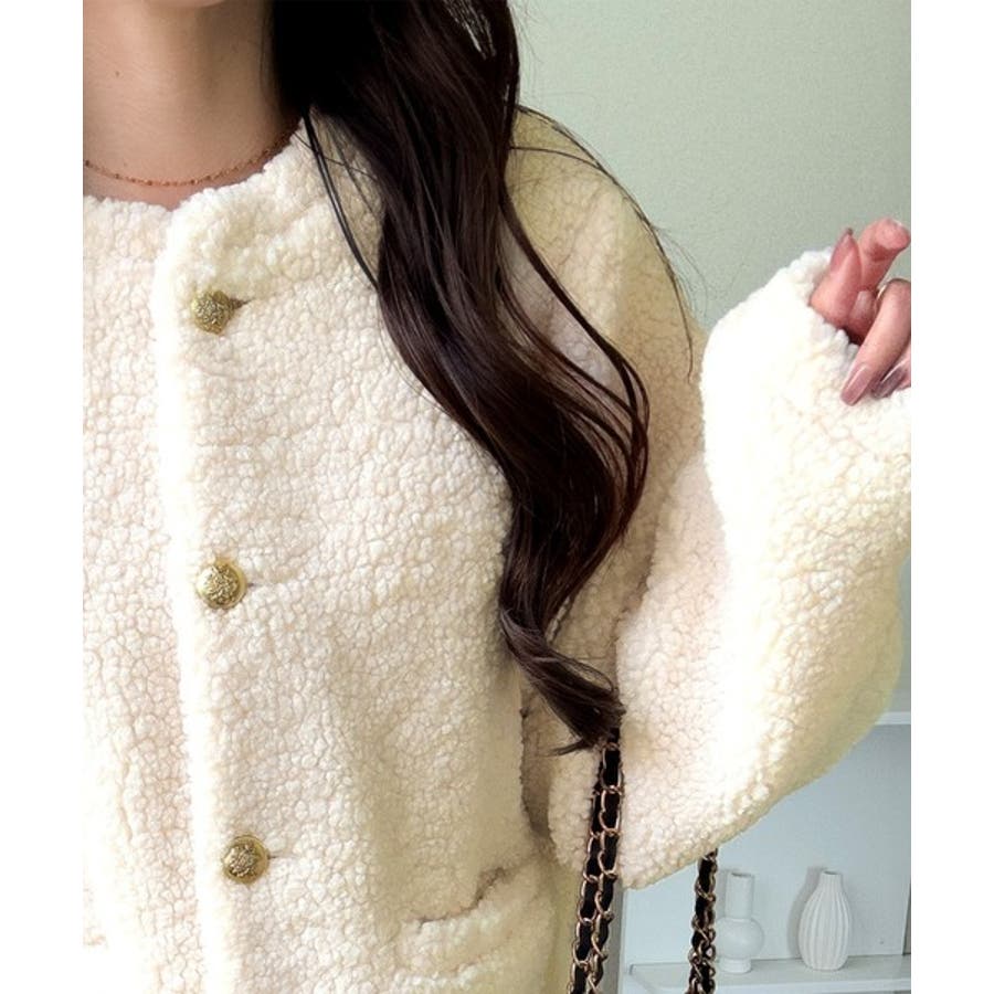 ゴールドのエンブレム釦がリッチに映える、ボリュームボアジャケット。存在感のあるボアながら、肩幅をコンパクトに設計することで