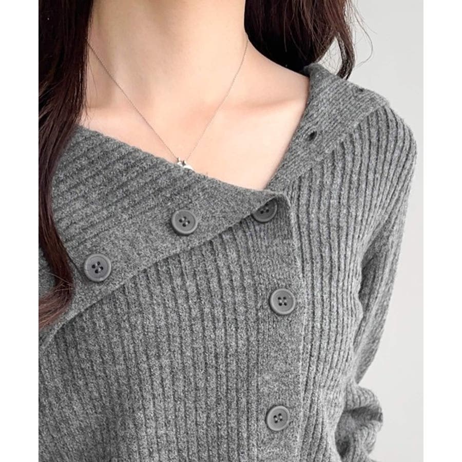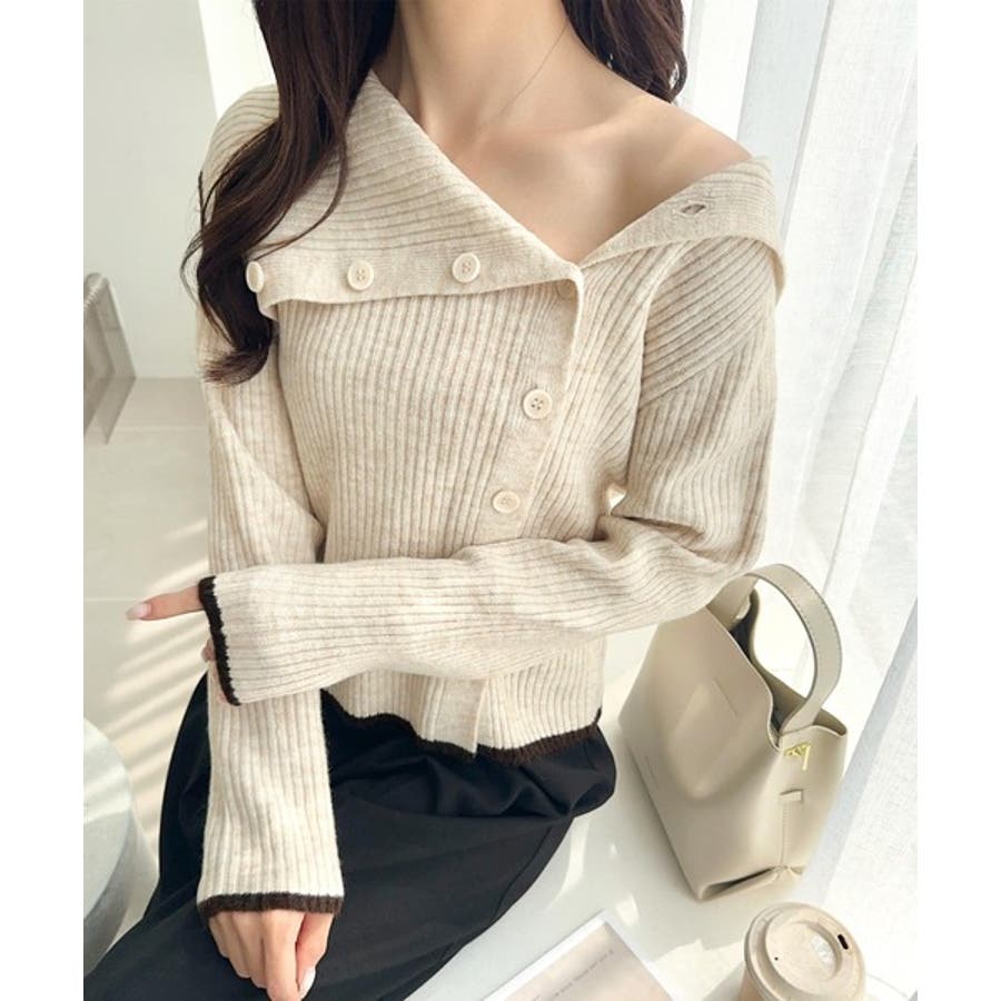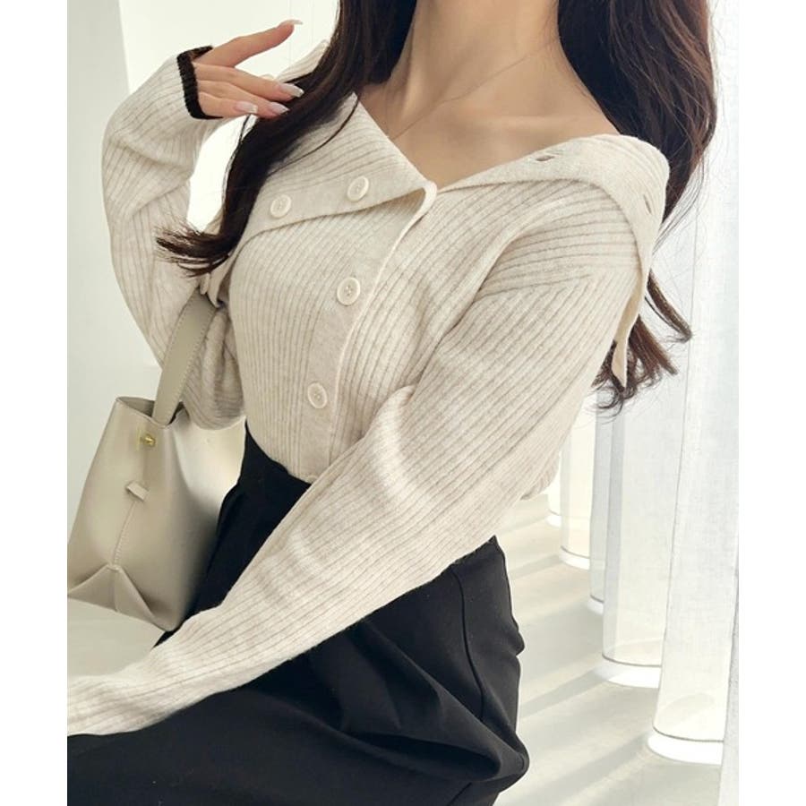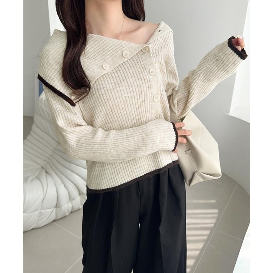 大きめのアシンメトリーな衿が華やかさをプラスするリブニット。