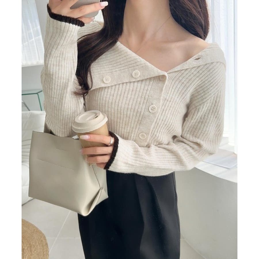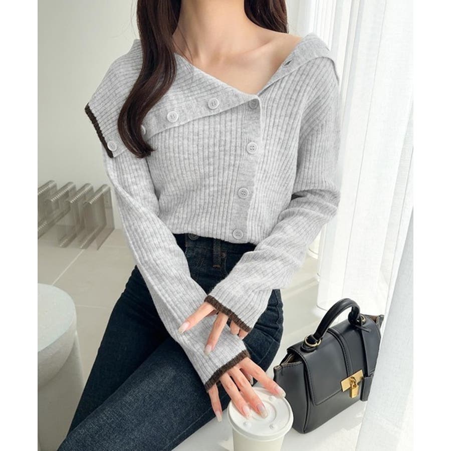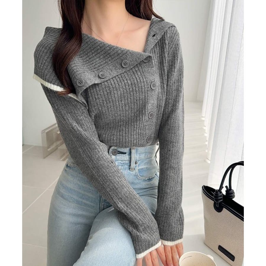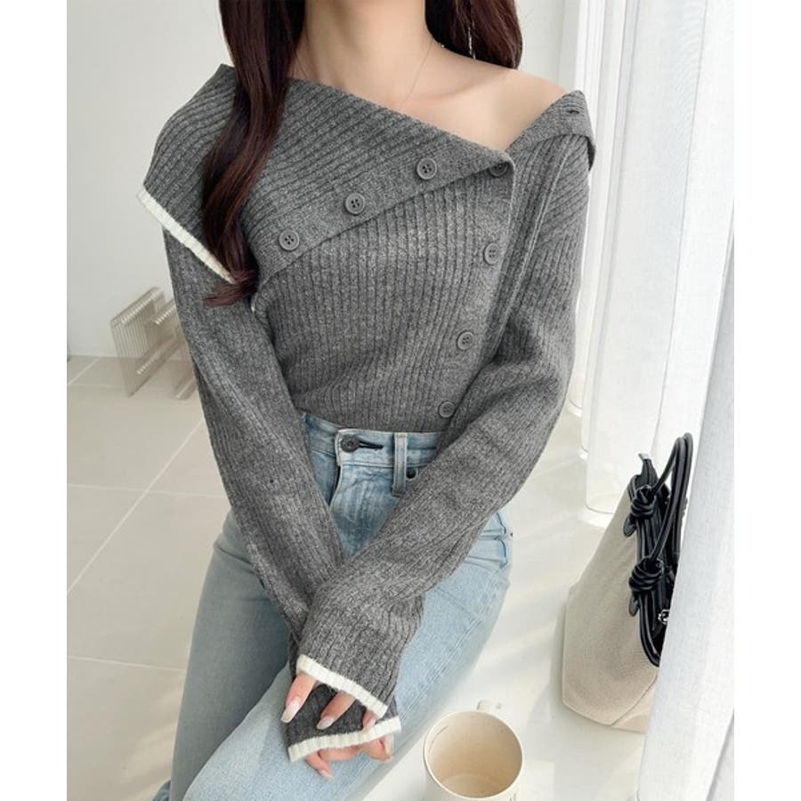 大きめのアシンメトリーな衿が華やかさをプラスするリブニット。