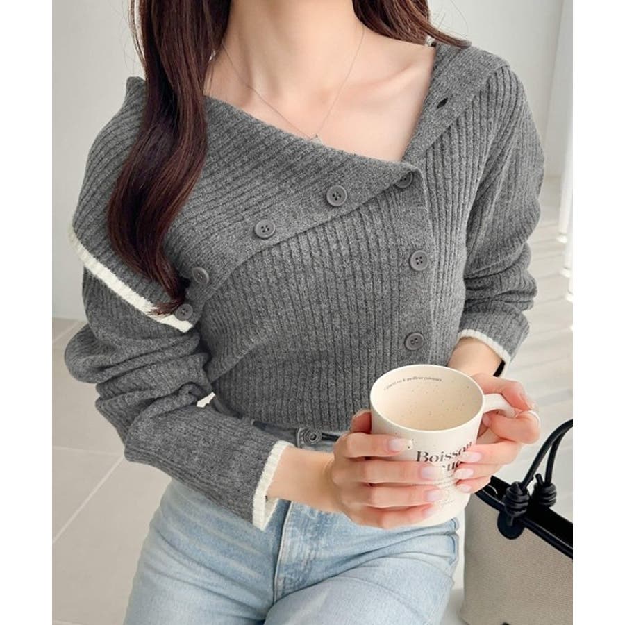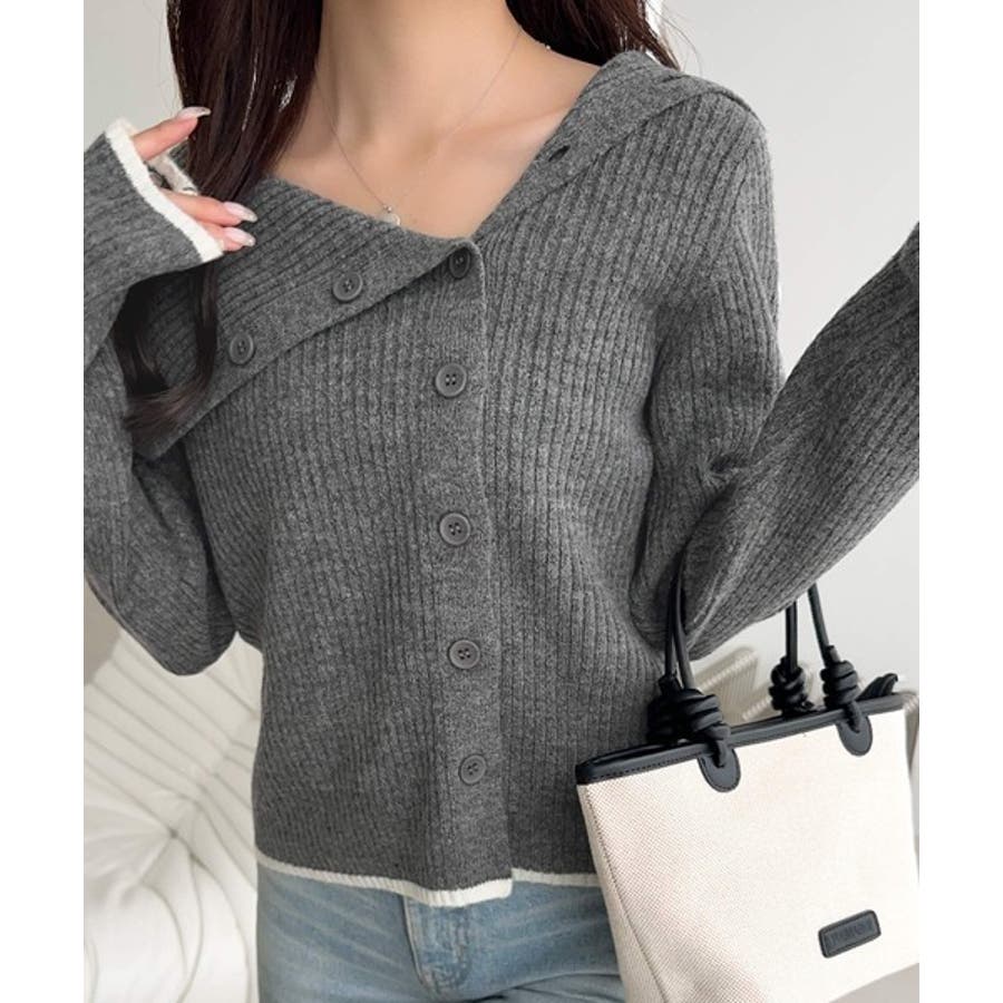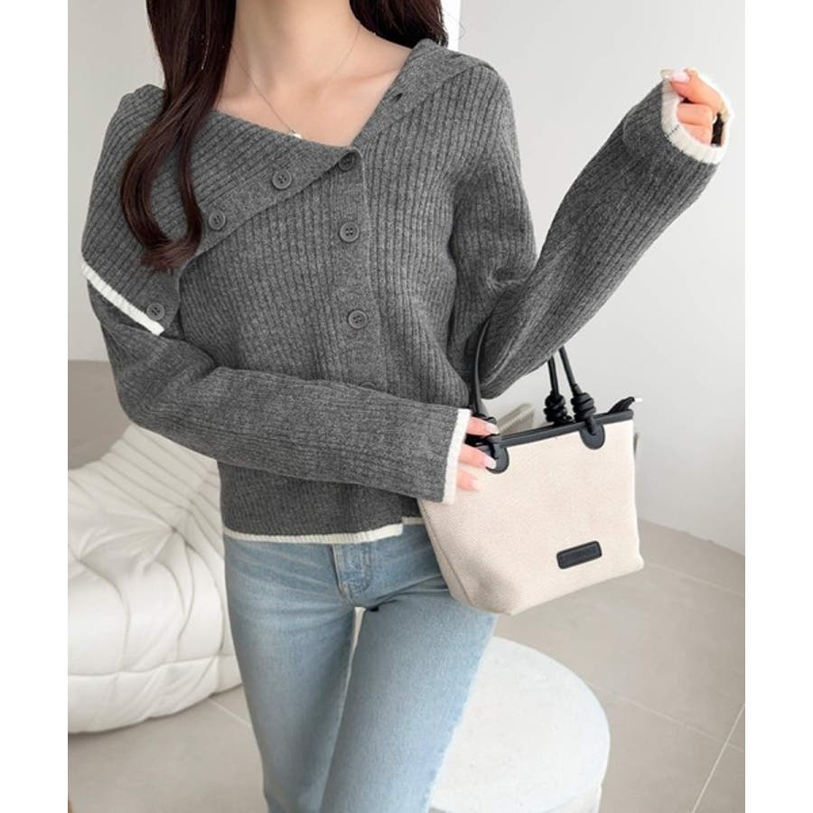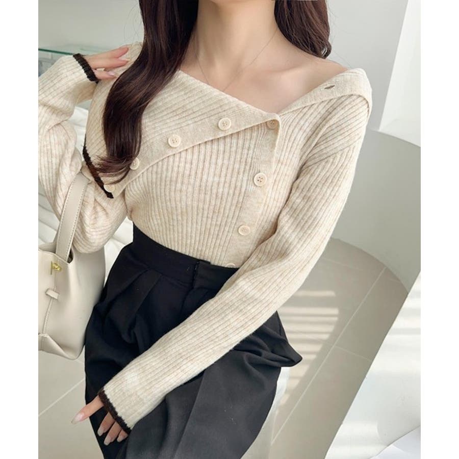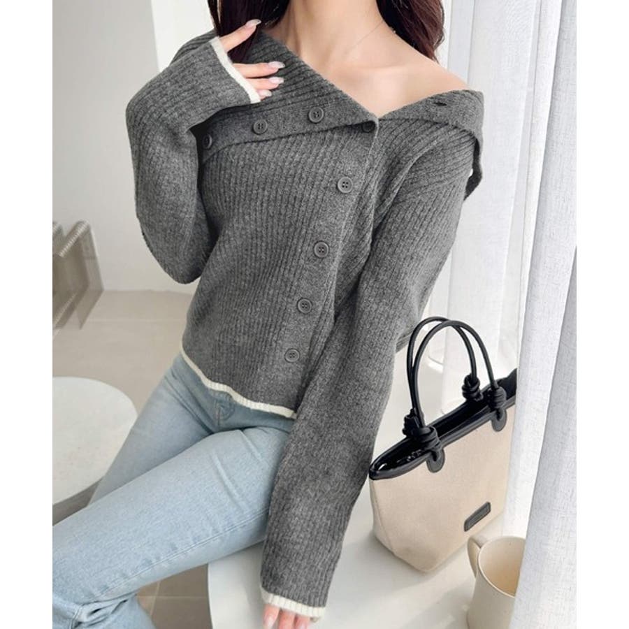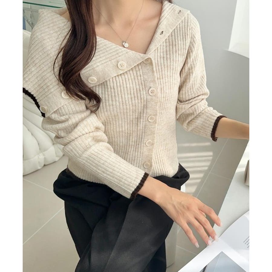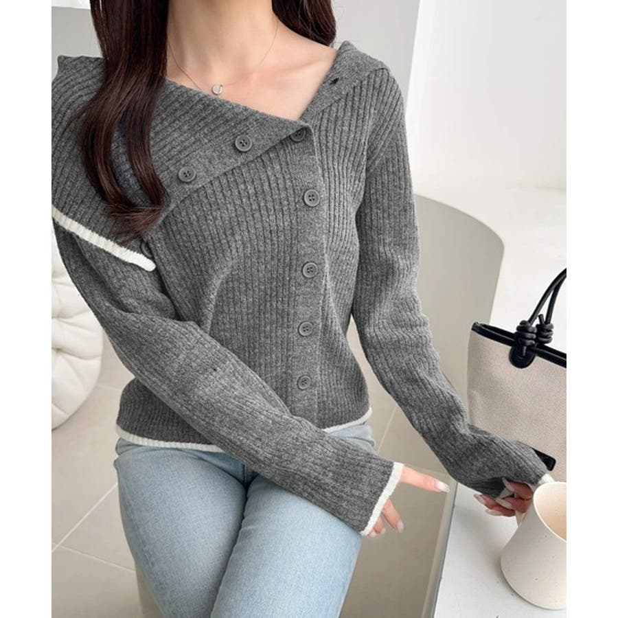 ワザありカラーで華やかさをプラス◎アシンメトリーカラー見せ裾配色多ボタンニット