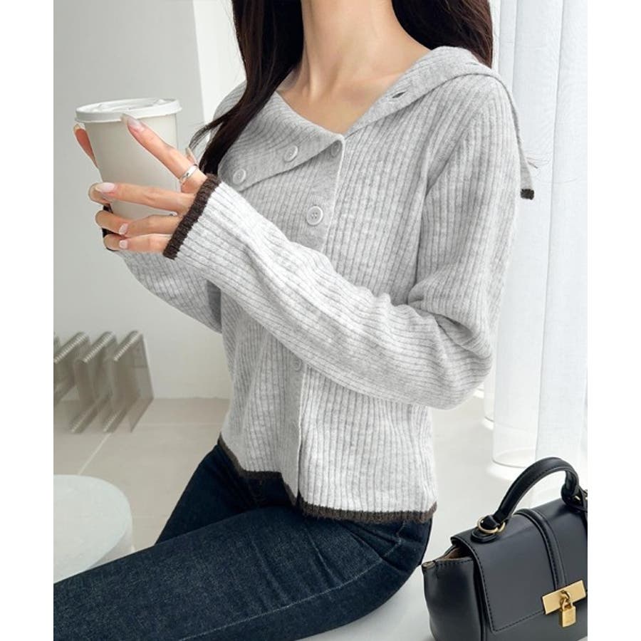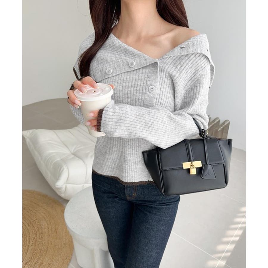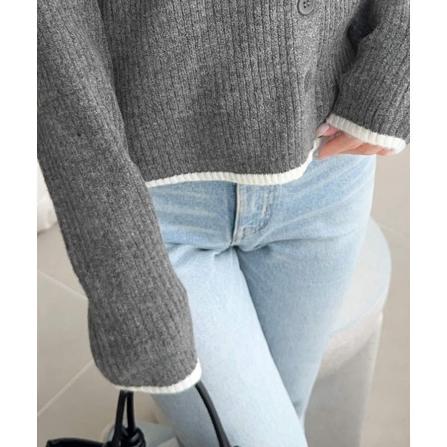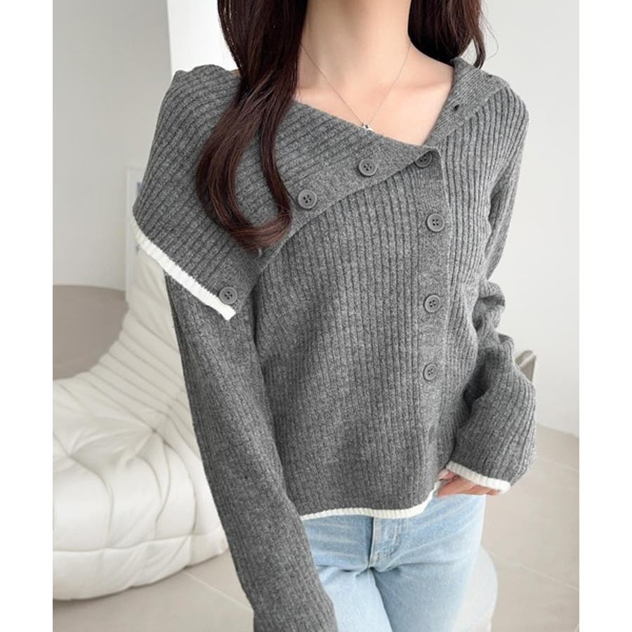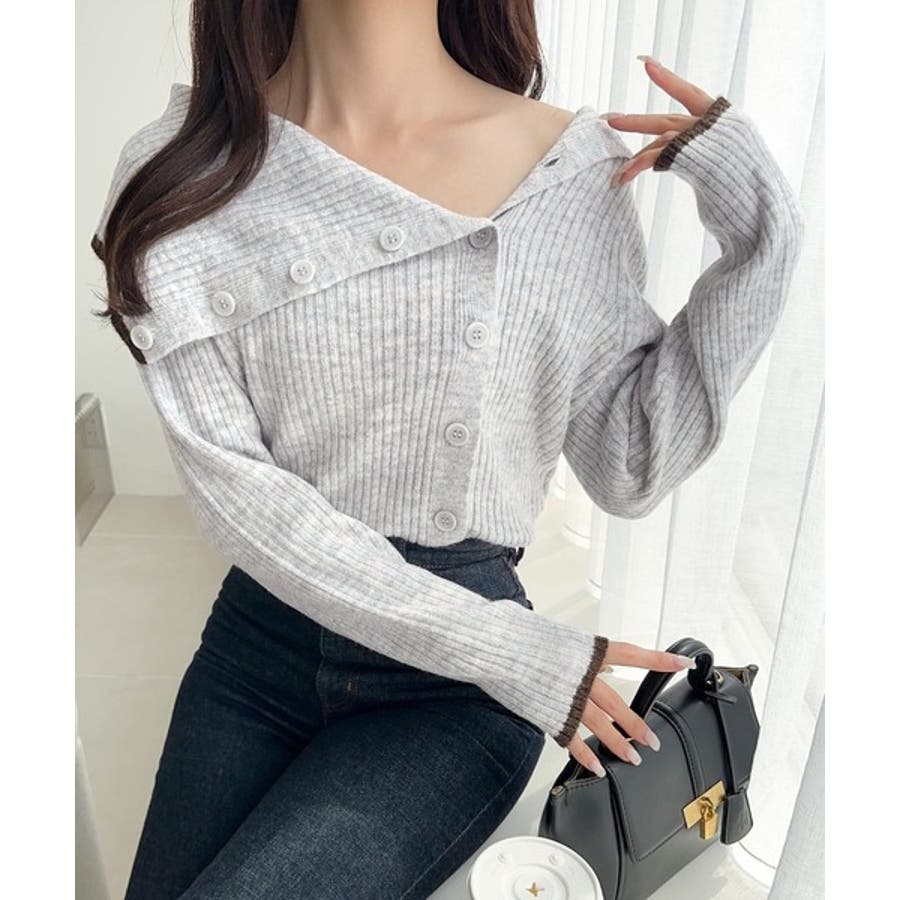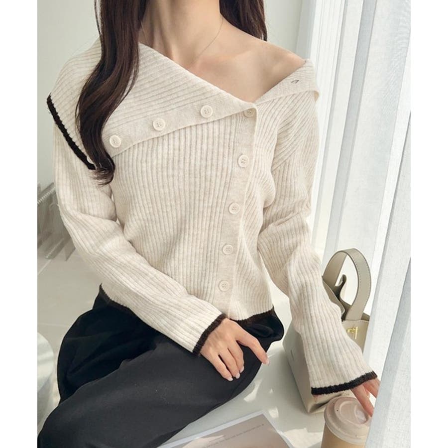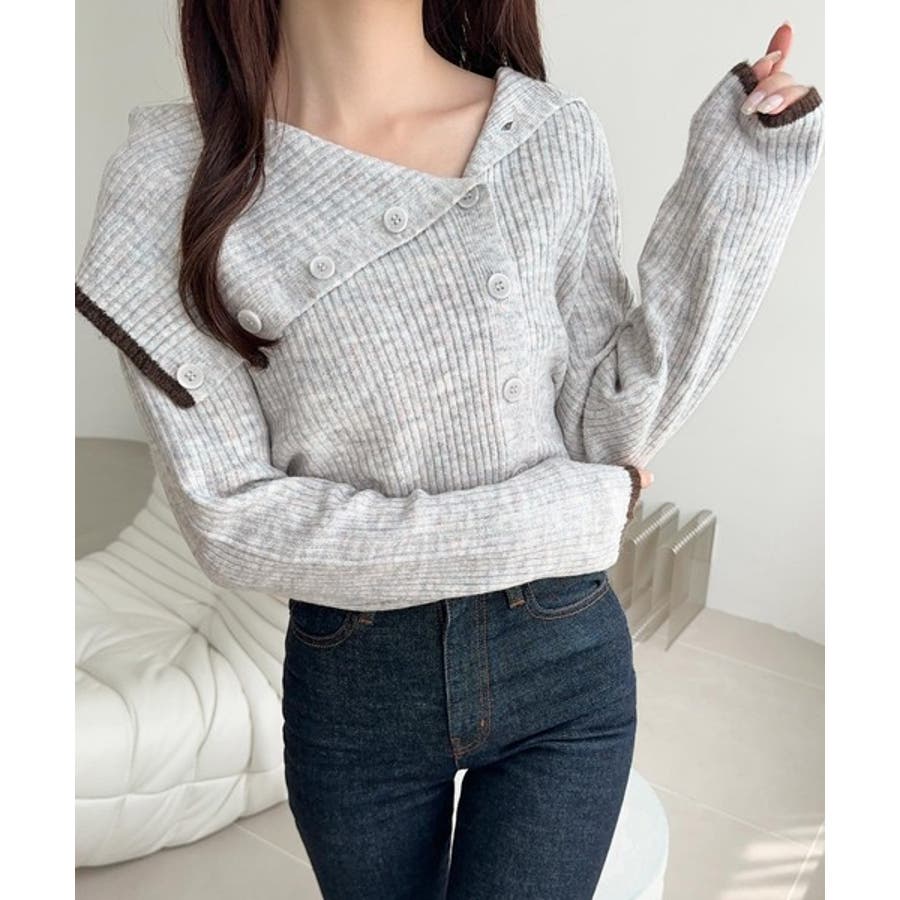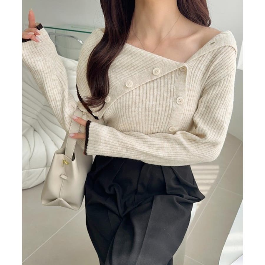 ワザありカラーで華やかさをプラス◎アシンメトリーカラー見せ裾配色多ボタンニット