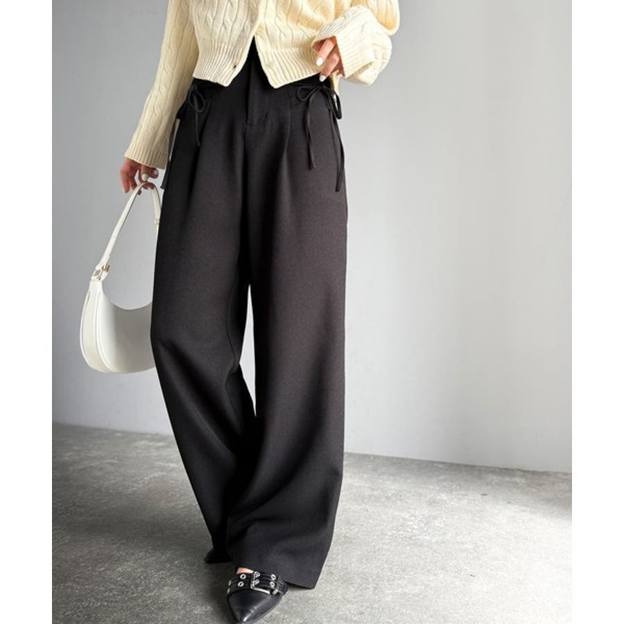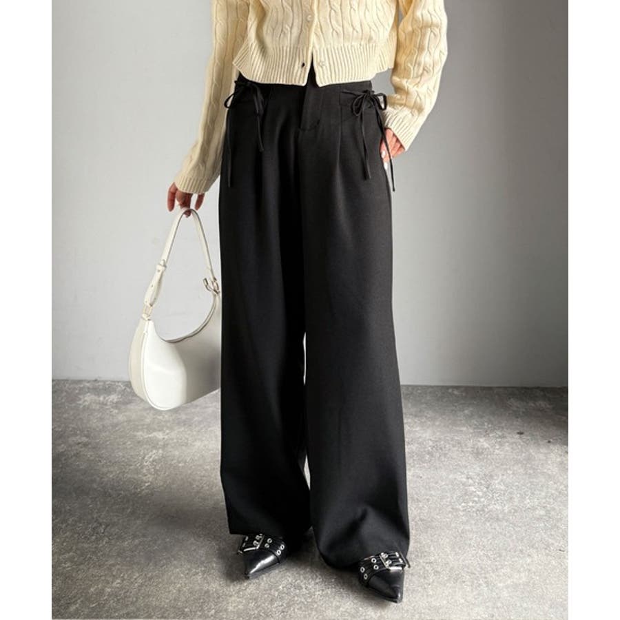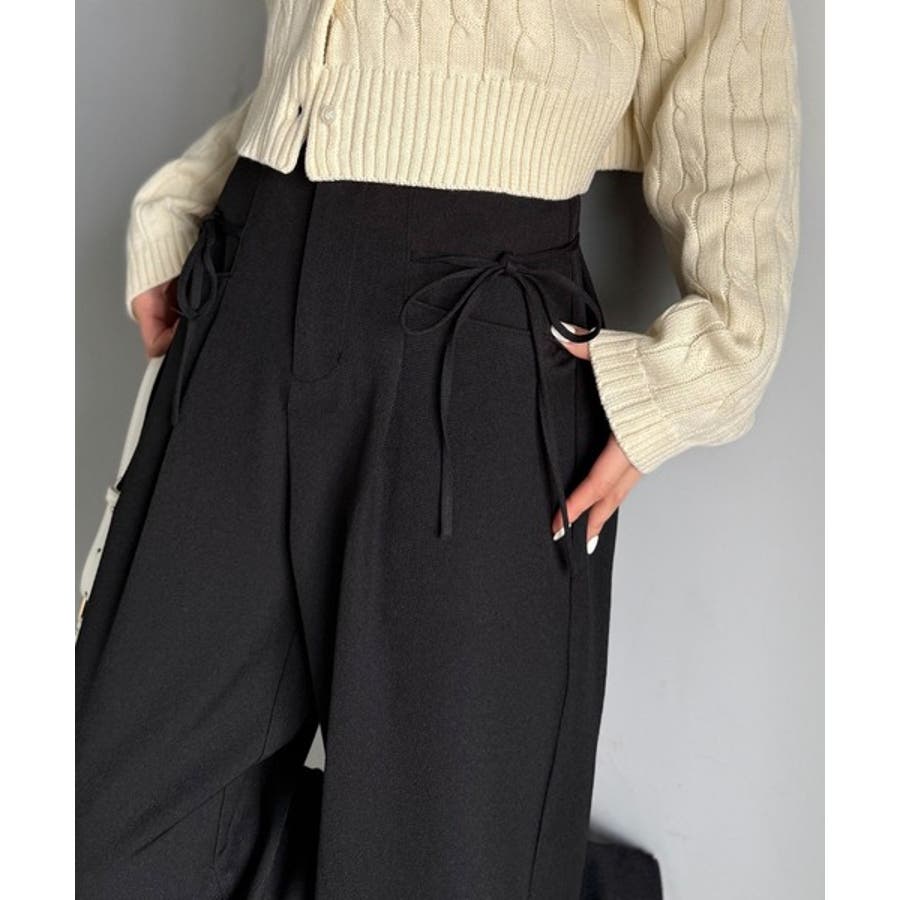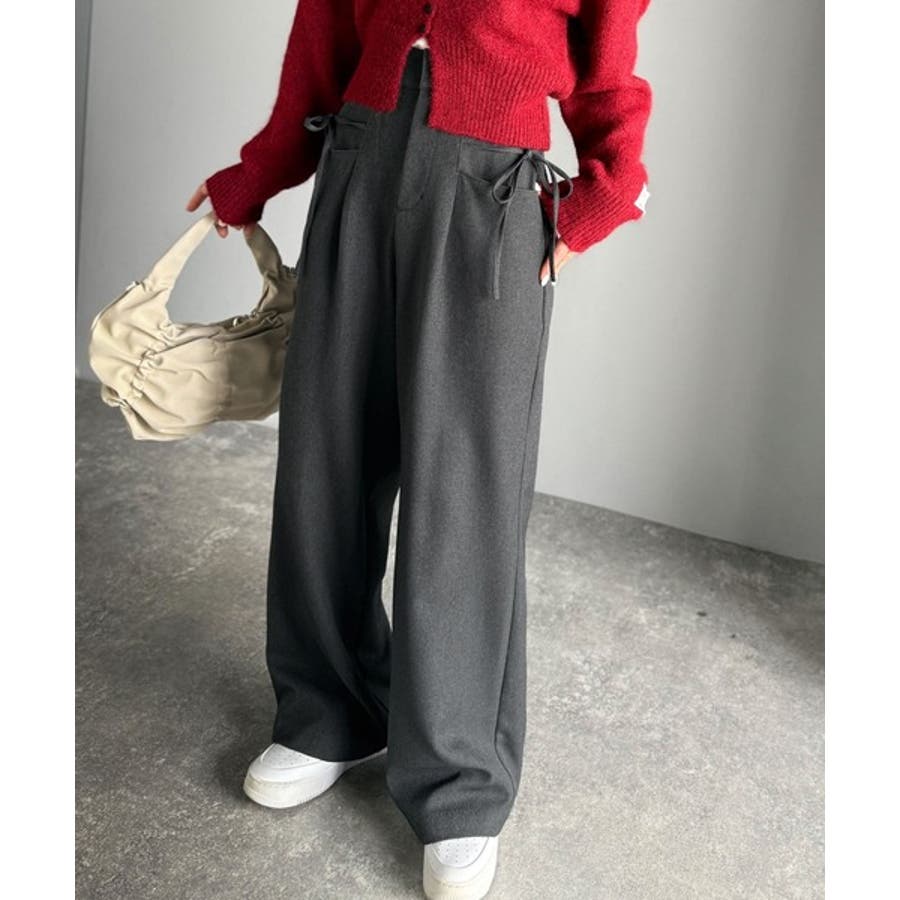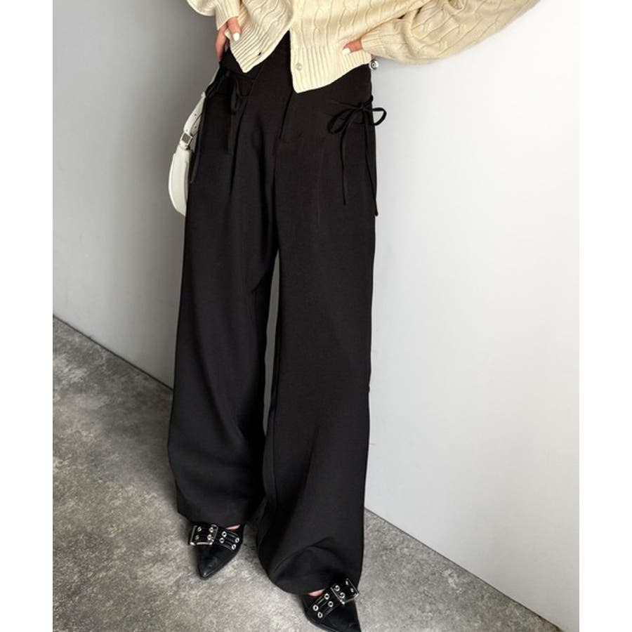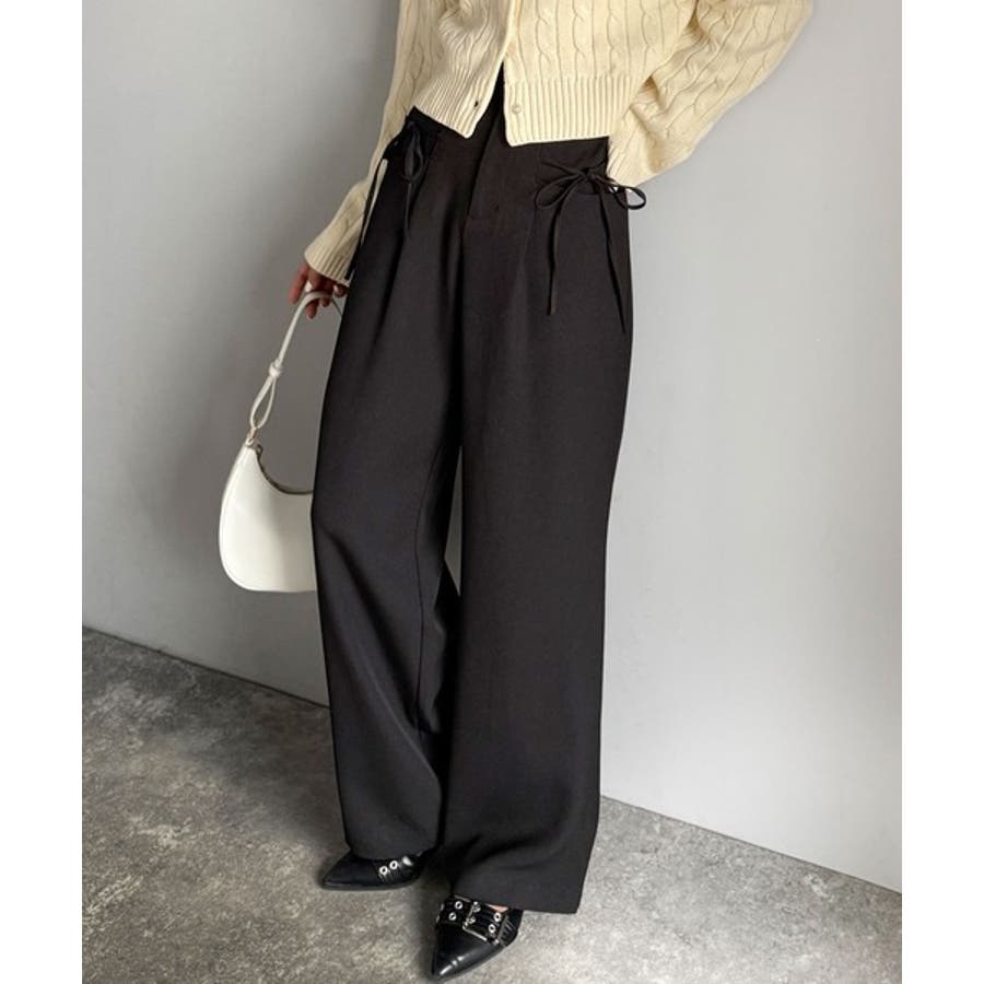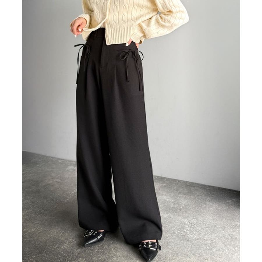 きれいめガーリースタイルに取り入れたい、リボン付きのワイドパンツです。