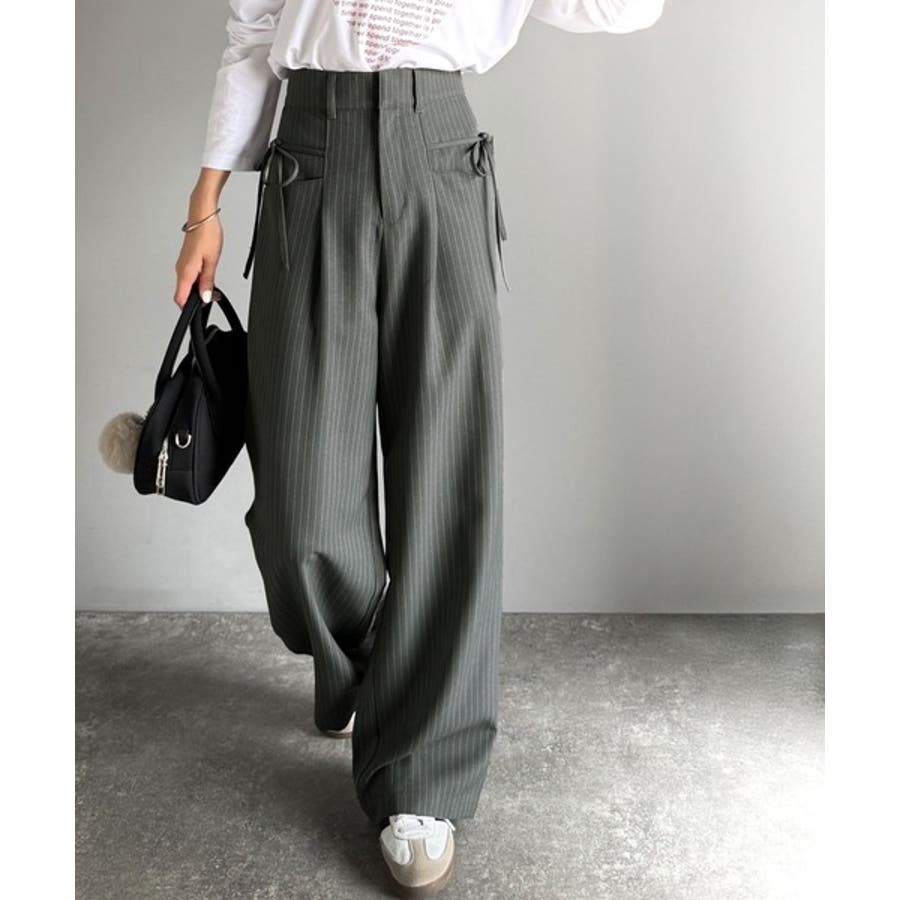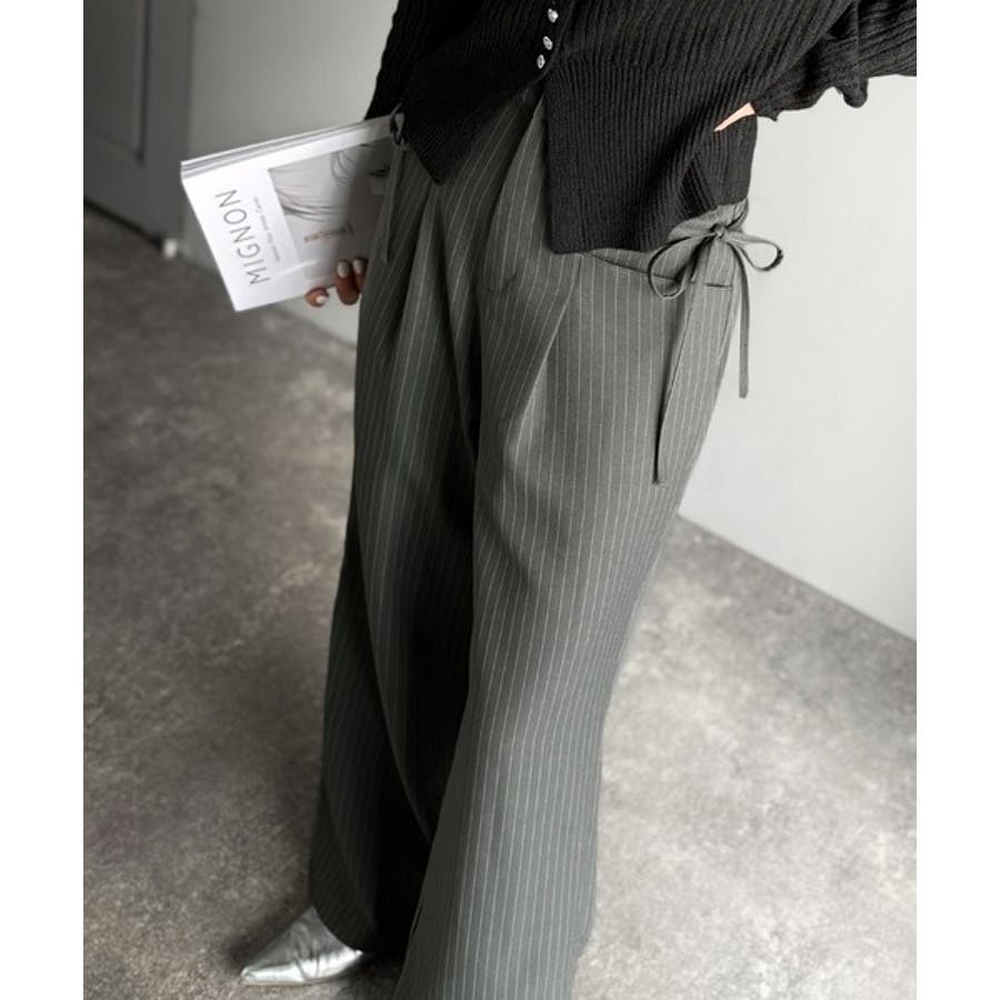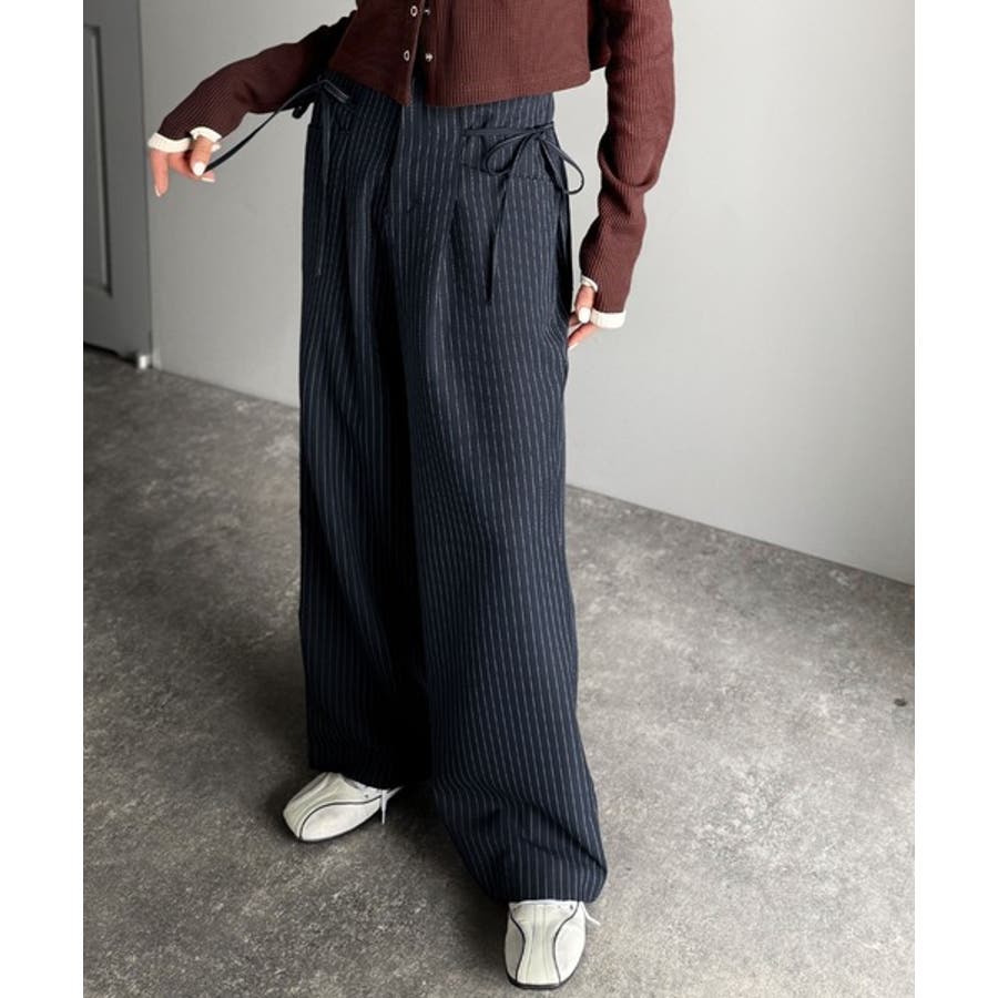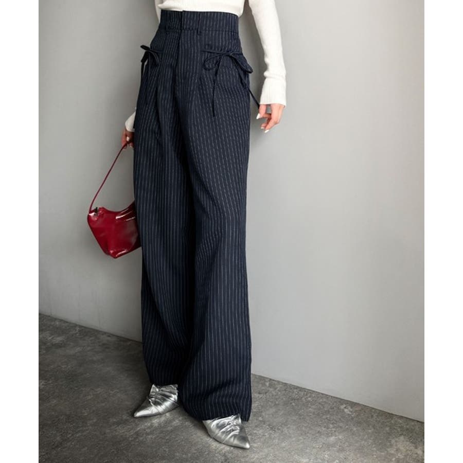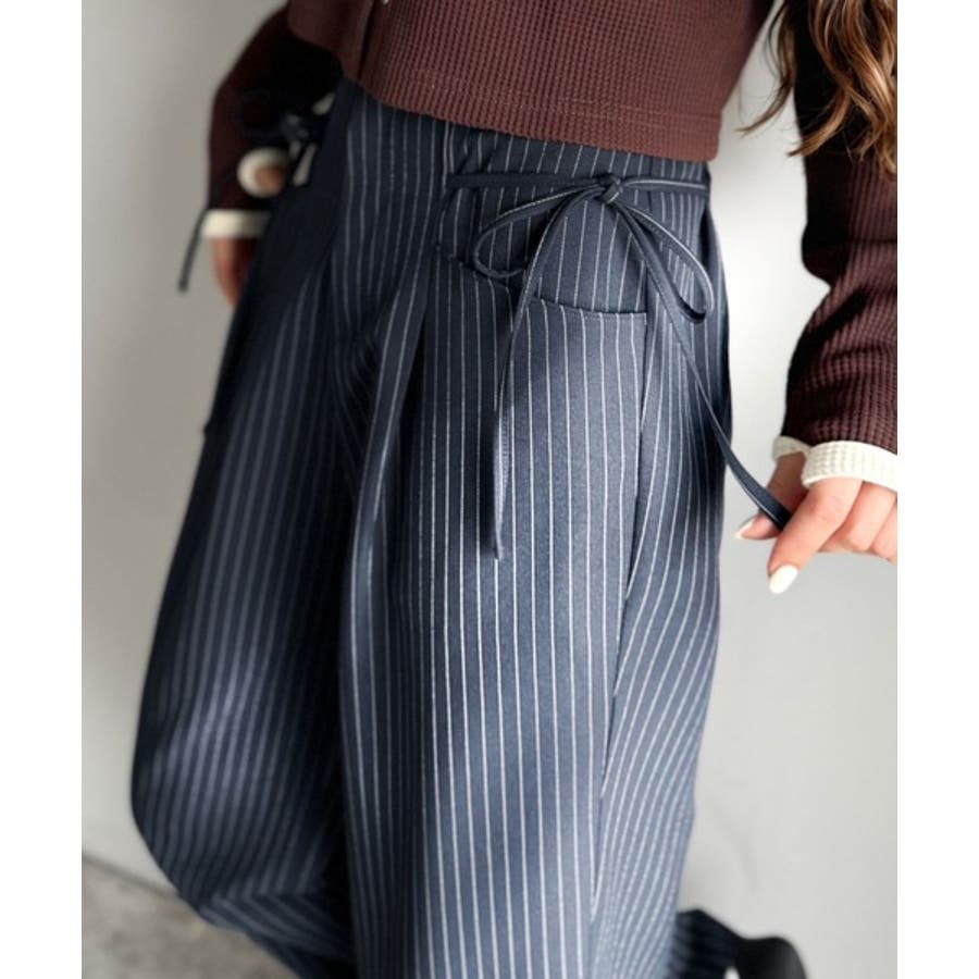 【mily bilet】タック入りストライプリボンワイドパンツ